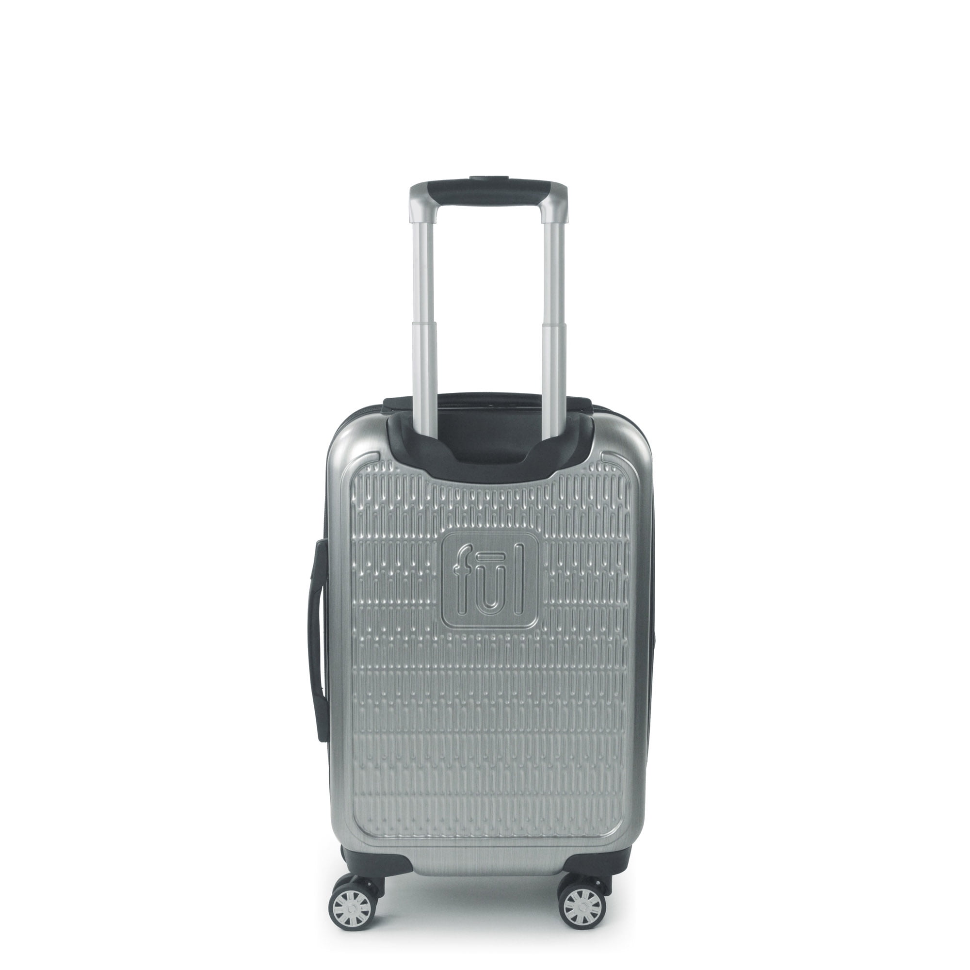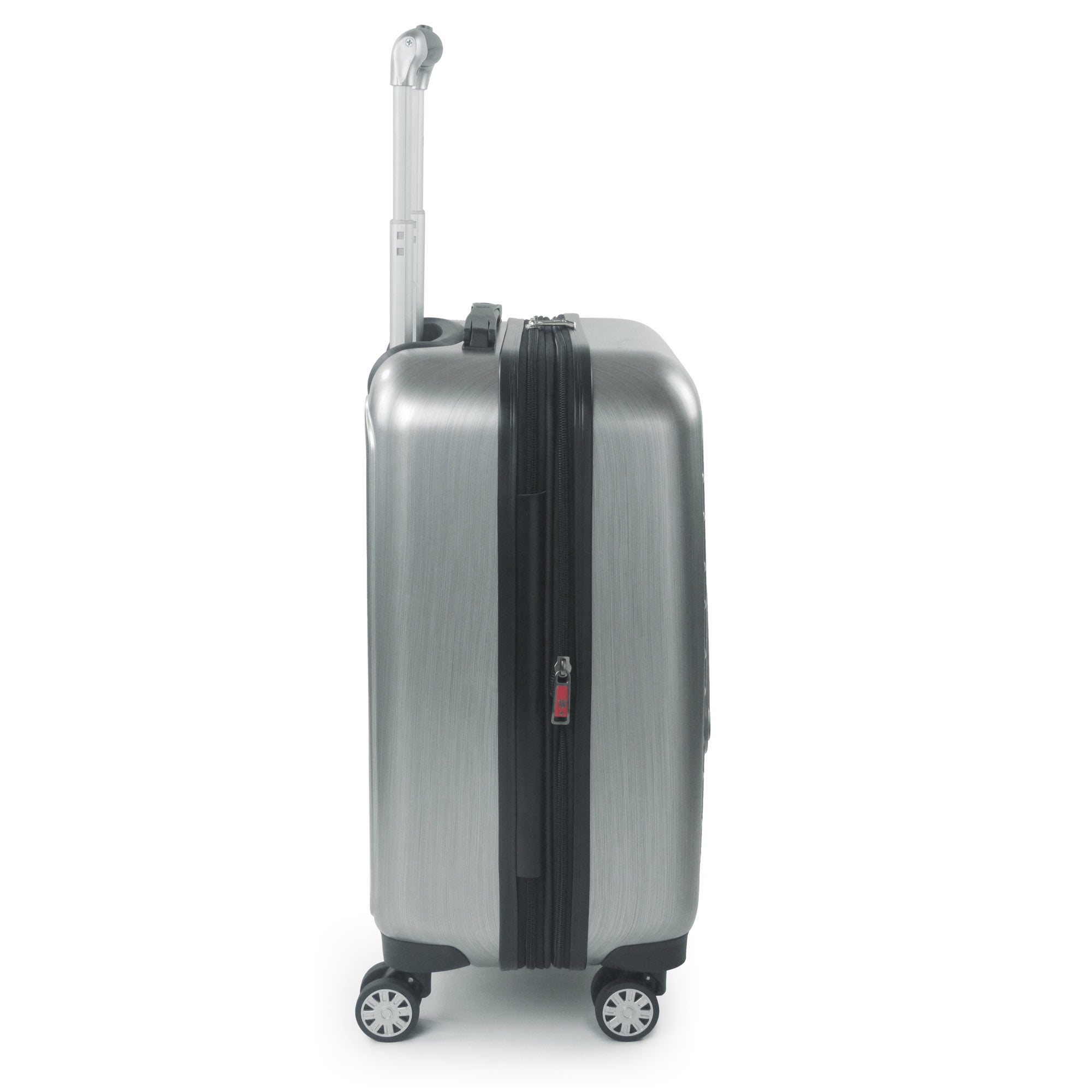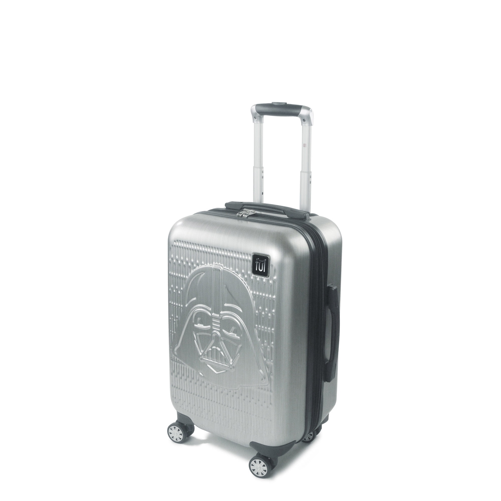 Silver hardshell luggage features an embossed Darth Vader design; Hardshell luggage carrier meets most airline requirements for carry-on luggage and fits into most overhead bins Hard luggage features a sizable polyester-lined main zip compartment for easy packing, a zip wet dry compartment for personal essentials, 2 mesh zip pockets for small accessories, clothing compression straps to keep clothing from wrinkling, and features expandable storage with 2-inch zipper gusset Wheeled luggage features a lightweight upright design with eight 360-degree multi-directional spinner wheels and retractable handle which allows for effortless movement; top and side handles allow for easy carrying and for loading into cars, trunks and overhead bins Travel luggage bag features a hard shell ABS plastic case which protects your luggage and is easy to spot clean; hardside luggage is an officially licensed Star Wars product Lightweight luggage spinner measures 22 H x 14 W x 9 D in inches, and weighs 7 lbs