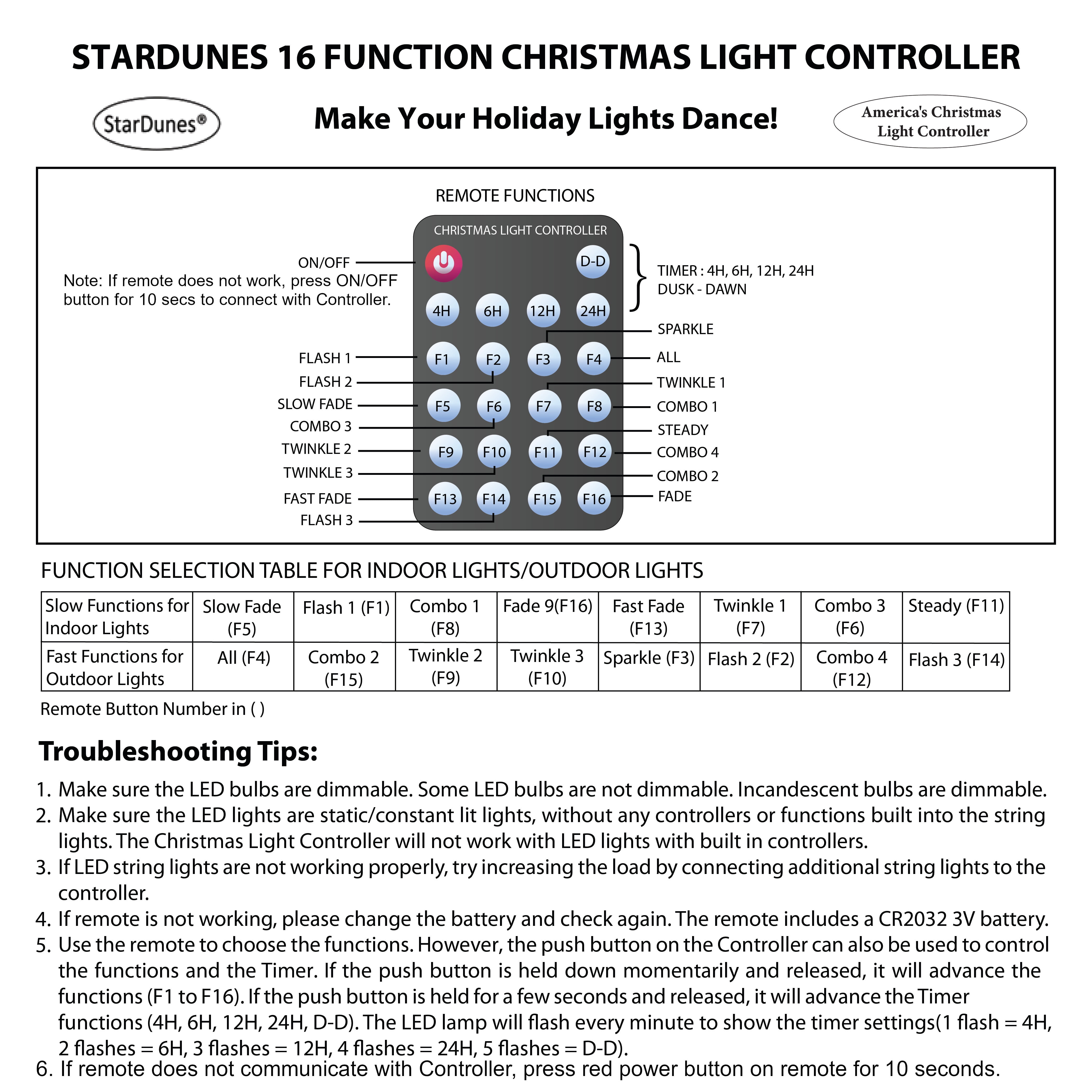 Stardunes Christmas Light Controller with full function remote is a unique controller with 16 Functions (Flash, Fade, Step Fade, Twinkle, and various combinations) for managing decorative lights at home or business. This unique light controller helps in converting any ordinary incandescent, LED string lights into flashing string lights. Ideal for Holiday or Special Occasion Lighting, Christmas Tree Lights, Lawn Ornament Lights, Rope Lights, and Business Signs, Etc. Easy To Use: Just plug your Holiday Lights to the Controller’s socket. Make all the string lights flash in synchronized fashion. Connect Incandescent or LED Lights. Rated from 5 To 400 Watts; Connect up to 6 Incandescent String Lights (Max. 60 Watts per String Light) or many LED String Lights (up to 400 Watts) end to end. Do Not Overload. This controller has a replaceable overload protection fuse for safety. For Indoor and Outdoor Use. Water Resistant. If you are not happy, then return for a refund. Before leaving negative feedback, contact us and we will resolve the issue to your liking. For more Information, watch the demonstration Video at Youtube by Searching For “Stardunes Christmas Light Controller.”
