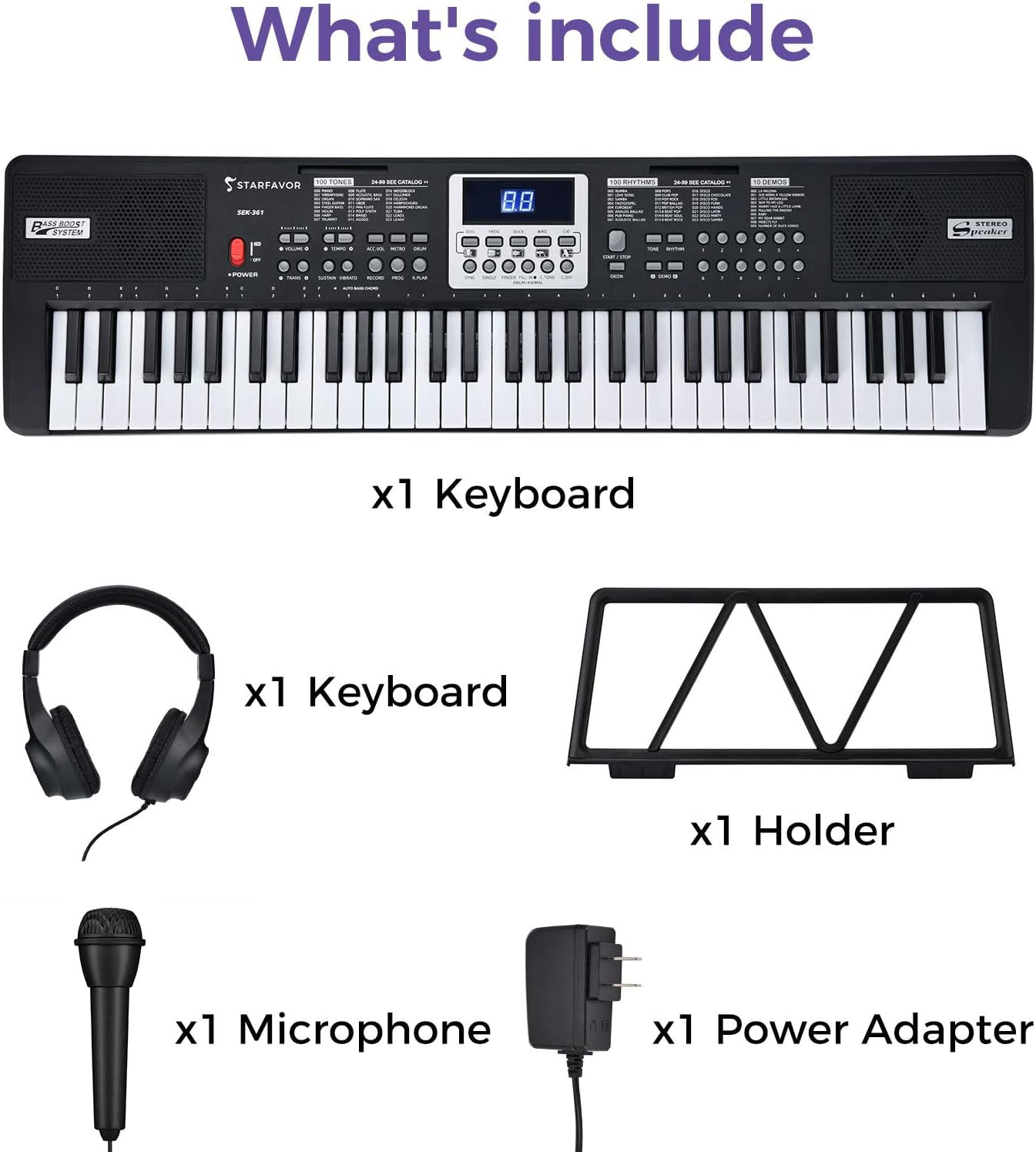 Starfavor 61 Key Kids Electric Keyboard SEK-361 ⭐Starfavor SEK-361 multi-function keyboard piano features 61 keys, providing a traditional piano and organ feel for versatile learning and an exciting acoustic experience. ⭐With 100 tones, 100 rhythms, 10 demo songs, drum pad hit keys, teaching functions, etc., the Starfavor electronic piano is the perfect instrument for beginning kids. ⭐This beginner keyboard is a wonderful music intelligence toy to develop children’s brain Awareness. Specifications Size: 76.0cm x 21.0cm x 6cm | 29.92 x 8.26 x 2.36 inches Weight: 5.5lb|2.5kg Suit: Little Kids or beginners Rated voltage: External power adapter, DC-6V/1000mA Keys and display: 61keys, LED display Tone and rhythm: 100 tones/100 rhythm styles Demo: 10 demo songs Control and effect: Drum pad hit button Performance recording: Record/Play Keyboard material: ABS Speaker Power: 6W Package Included 1 x Starfavor SEK-361 Electronic Keyboard 1 x Power Adapter 1 x Keyboard Sheet Music Stand 1 x Mini Microphone 1 x Headphone 1 x Keynotes stickers 1 x Manual Small and light designed for kids students, may not suitable for adults. NOTE – This keyboard is a Kid-sized keyboard for beginner students, may not suitable for adults.