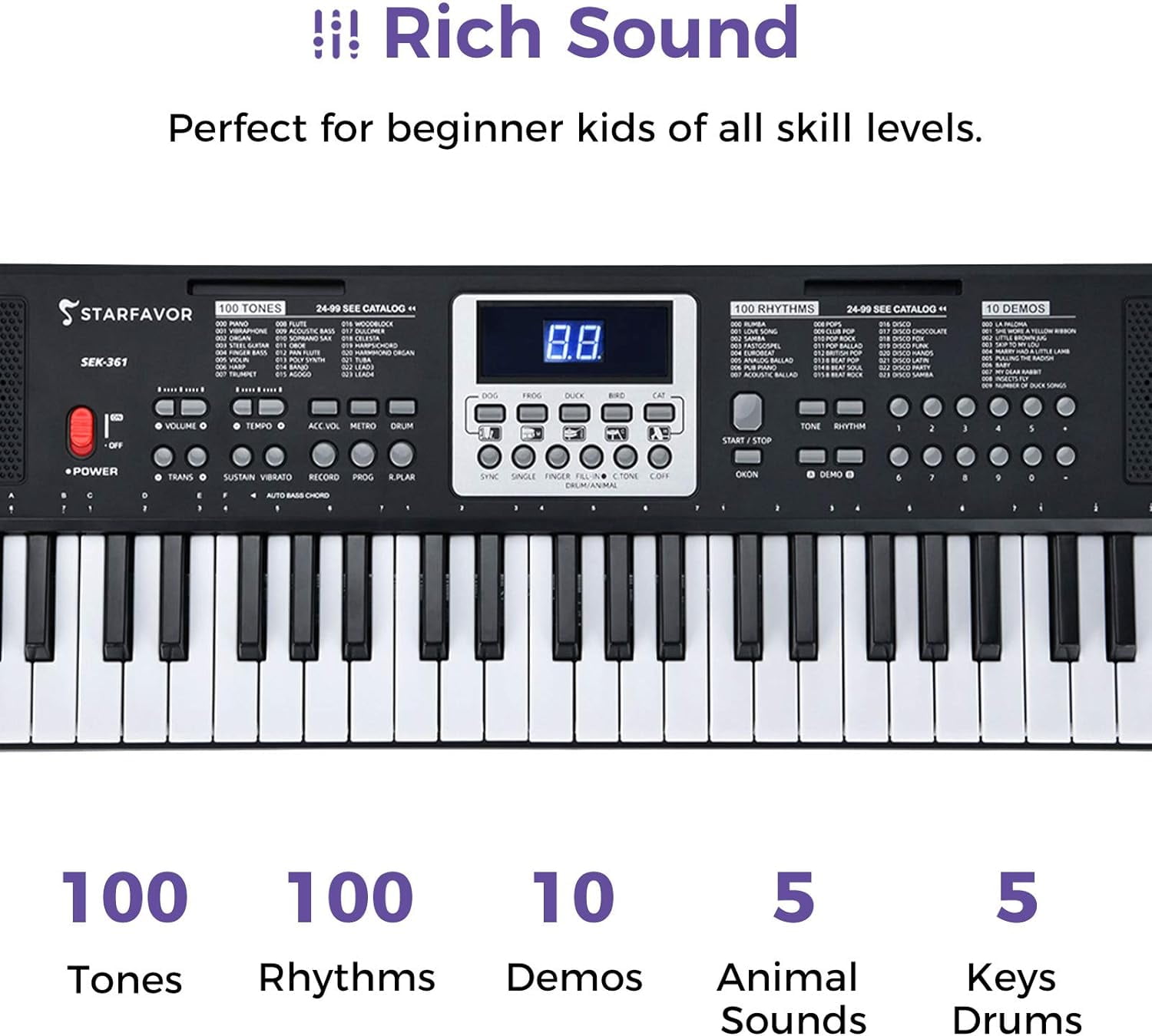 61 Key Keyboard – Starfavor multi-function eletronic keyboard features 61 keys, providing a traditional piano or organ feel for versatile learning and an exciting acoustic experience. Rich Sound – With 100 tones, 100 rhythms, 10 demo songs, drum pad hit keys, teaching functions, etc., the Starfavor electric keyboard is perfect for beginner kids of all skill levels. LED Display – The LED display will simply and clearly display the current tone, rhythm sequence number, and the current playing speed. Stereo Speaker – The electronic keyboard is equipped with two high-quality speakers, which can offer three-dimensional surround sound so that you can immerse yourself in the music atmosphere. The bundle is also equipped with high-quality headphones so that you can practice in private without affecting your neighbors. Small and Light – The electric piano is portable and small, weighing only 5.5 lbs, designed for kids and teenagers who can easily enjoy the joy of playing no matter when and where.