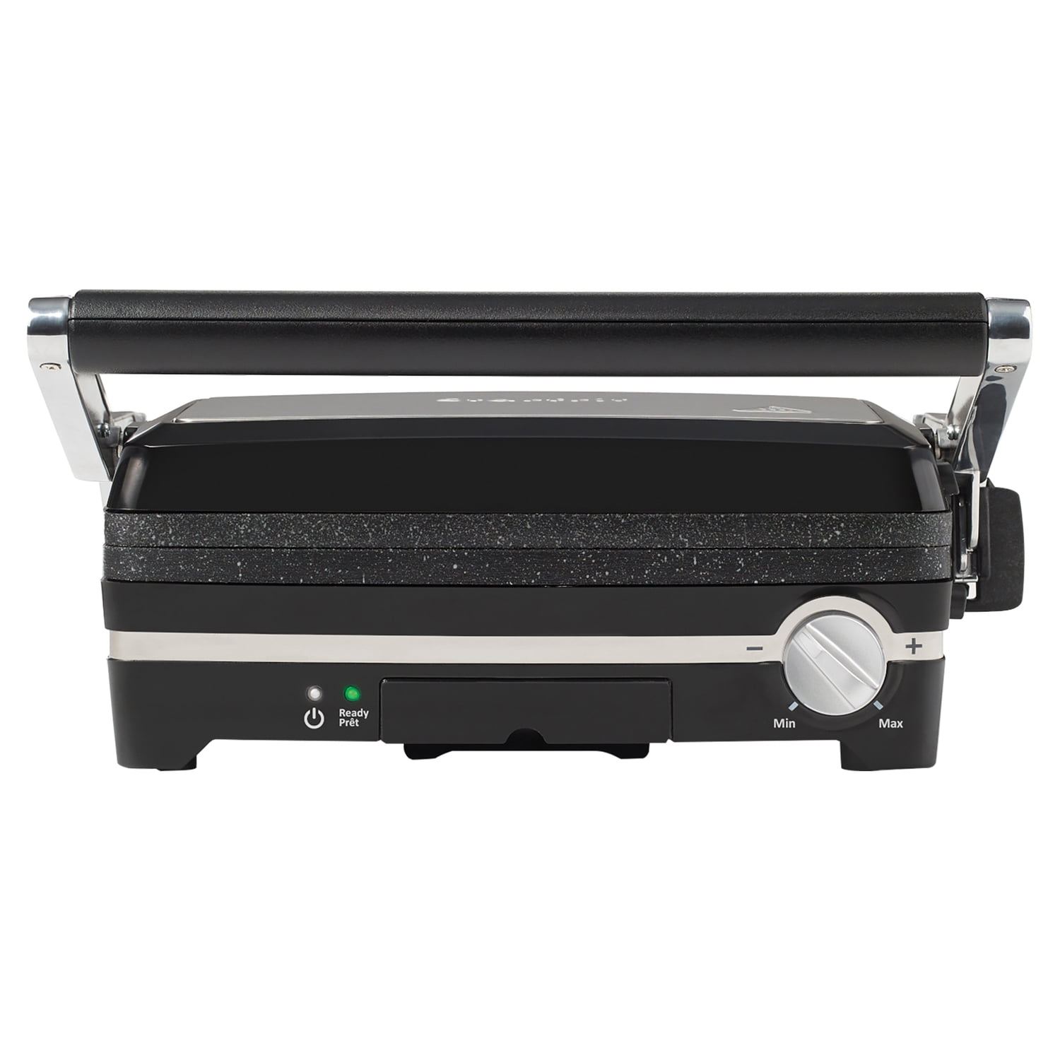 1,500 watts of power; 180° opening for larger cooking area; Integrated drip tray for easy storage; Reversible, nonstick plates switch from grill to griddle; Floating handle adjusts the thickness according to the food; Large cooking plate: 10.826 in. x 7.874 in. x .098 in. (27.5 cm. x 20.0 cm. x 0.25 cm.); Power and Preheat lights; Temperature-controlled knob; Cool-touch handle; Compact, upright storage position; 39.37 in. (1 m.) power cord length
