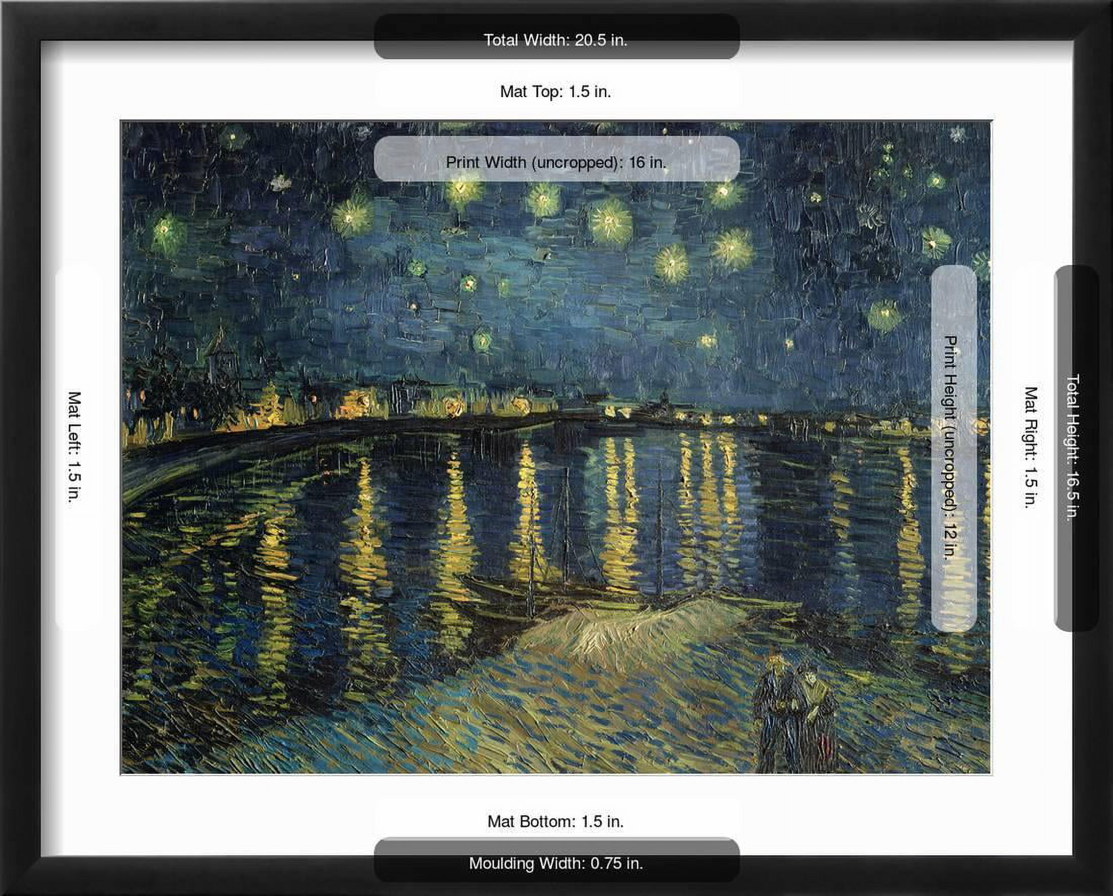 Title: Starry Night over the Rhone c1888 Theme: Scenic Artist: Vincent van Gogh Finished Size: 20 x 16 in Product Type: Frame Material: Paper Frame Material: Wood Home Decor Style: Wall Art Brand: Art.Com Color: Multi-Color Framed Finished Height: 1.5 in Finished Weight: 1 LB Hanging Hardware Included Hand-finished by Experts in the USA