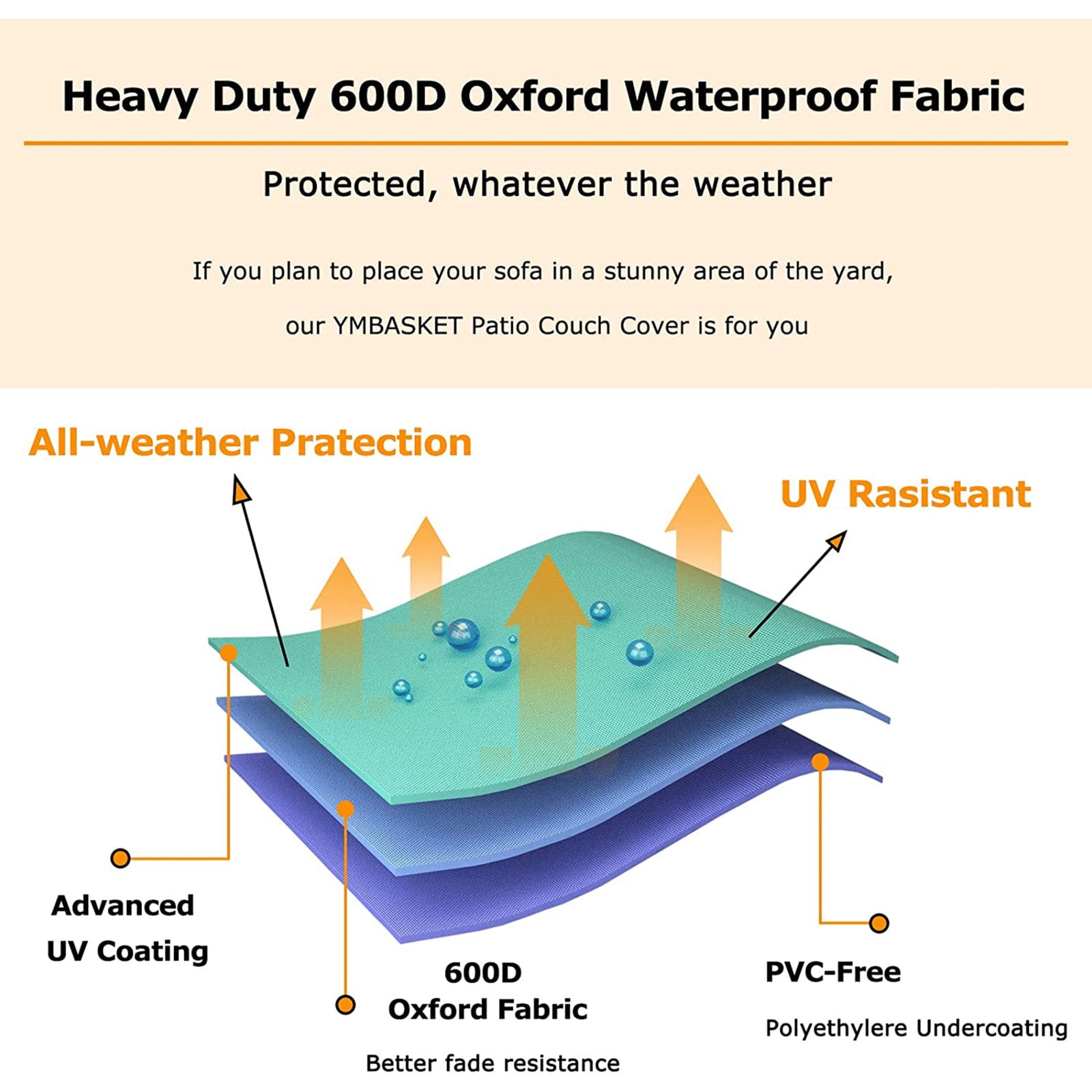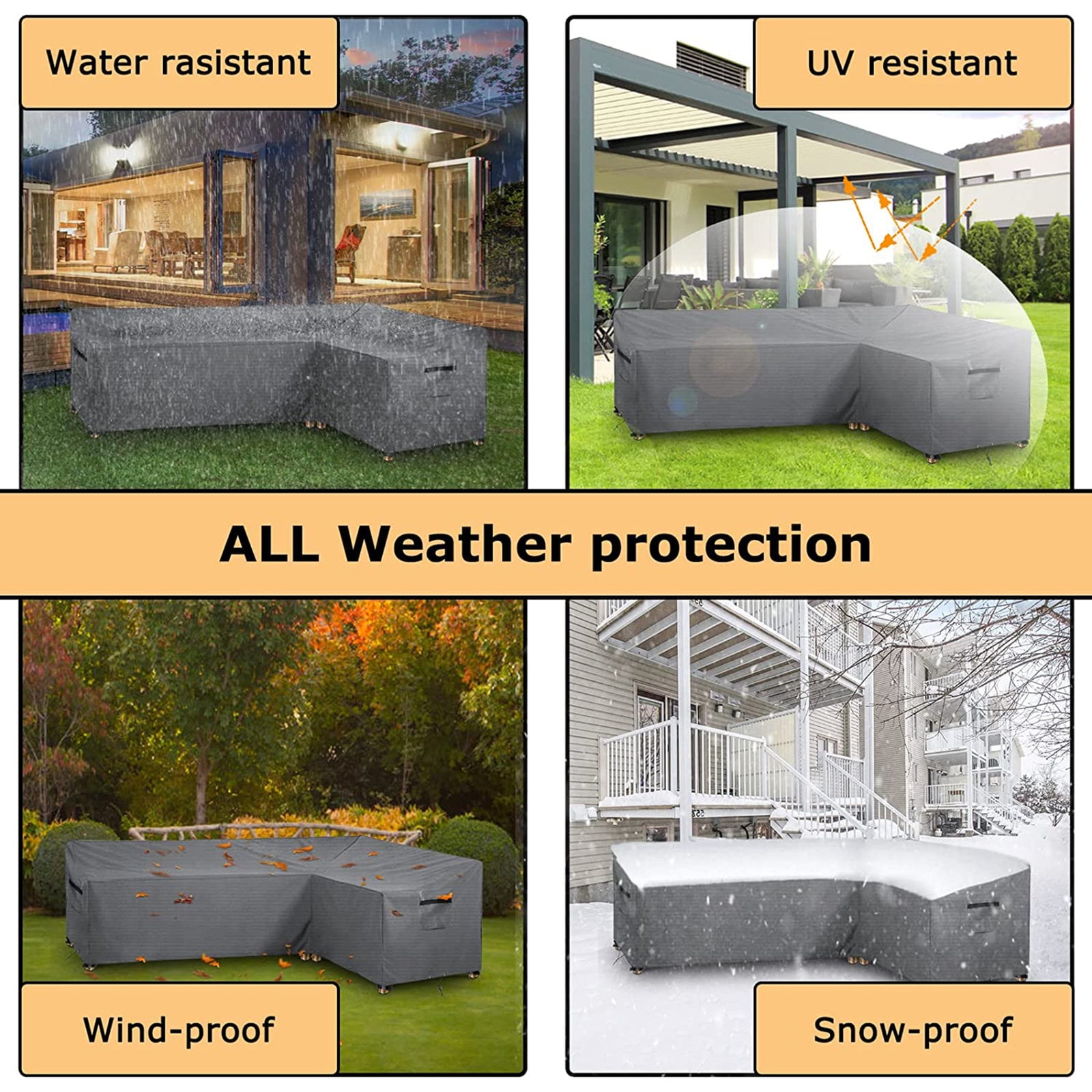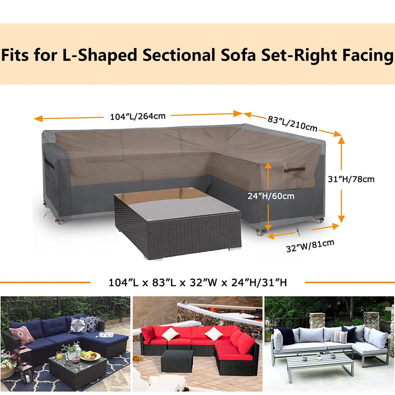 【Heavy Duty Patio Furniture Covers】 Fits most 7 piece L-shaped sectional sofa set 104″L (left side), 83″ L (right side) x 32″ D x 31H”. The size of your outside furniture is less than 1-2 inch than the cover size, it is most suitable. Please check your size for a proper fit. 【Withstand Heavy Snow in Winter and UV Protection in Summer】 Patio furniture set cover made by new upgraded waterproof oxford fabric with water-repellent PVC surface coating and UV coating, provides a full protection from heavy rain, snow, wind, sun while preventing dust, pollen and leaves from entering the sofa outdoors. 【Enhanced Water Resistance and Durability】 Waterproof glue strips on the seams and the thicker material with more windproof straps for solving the problems of water leakage in the seam and can not to be blown off by strong wind. Air vents can keep the air flowing that let the wind not tear the patio set cover. 【A Easy-use Outdoor Sofa Cover】 It’s easy to install and remove sectional couch cover with handles, you can finish all the installation work by yourself. 【Easy to Clean】 L shaped patio couch cover is easy to clean, just wipe it with water.