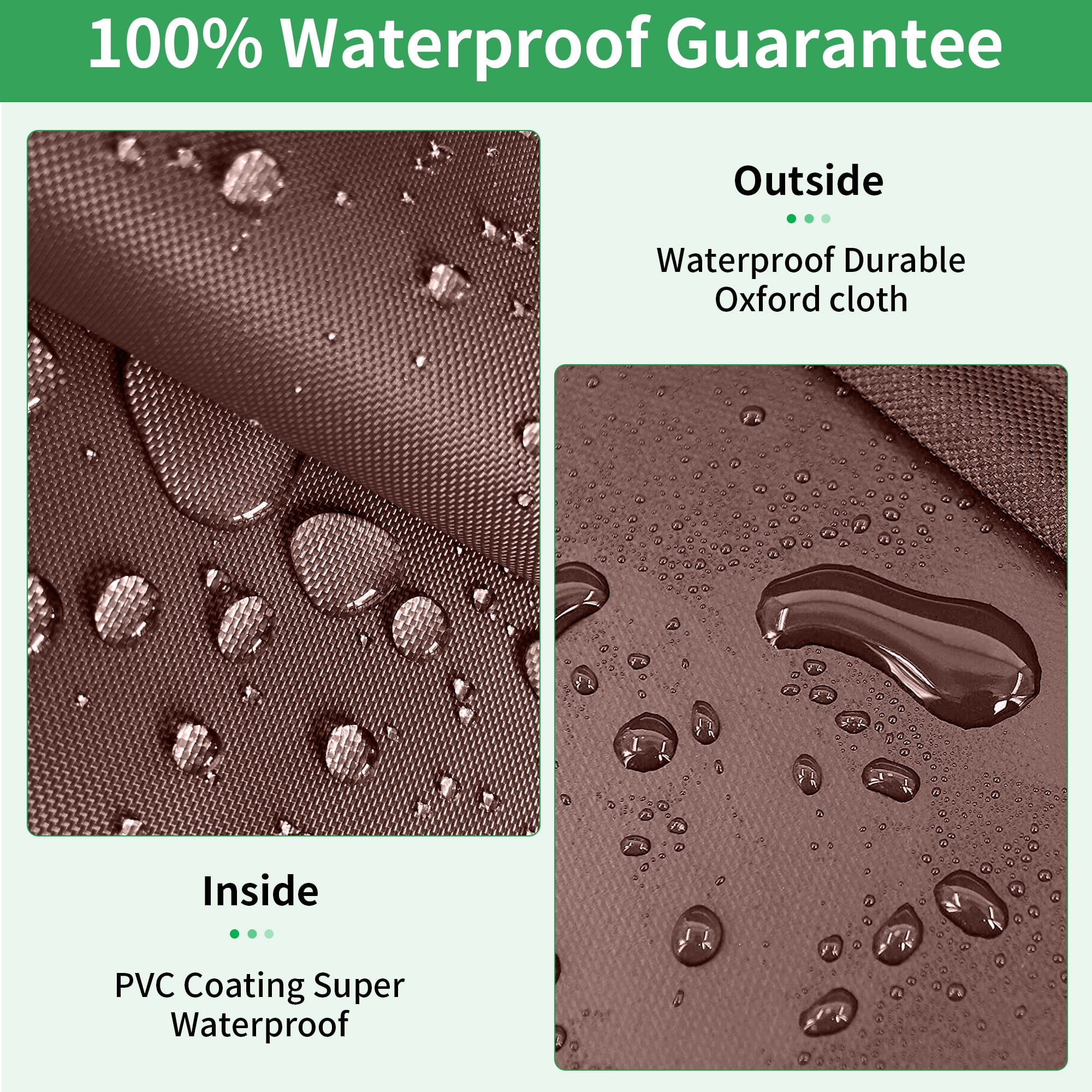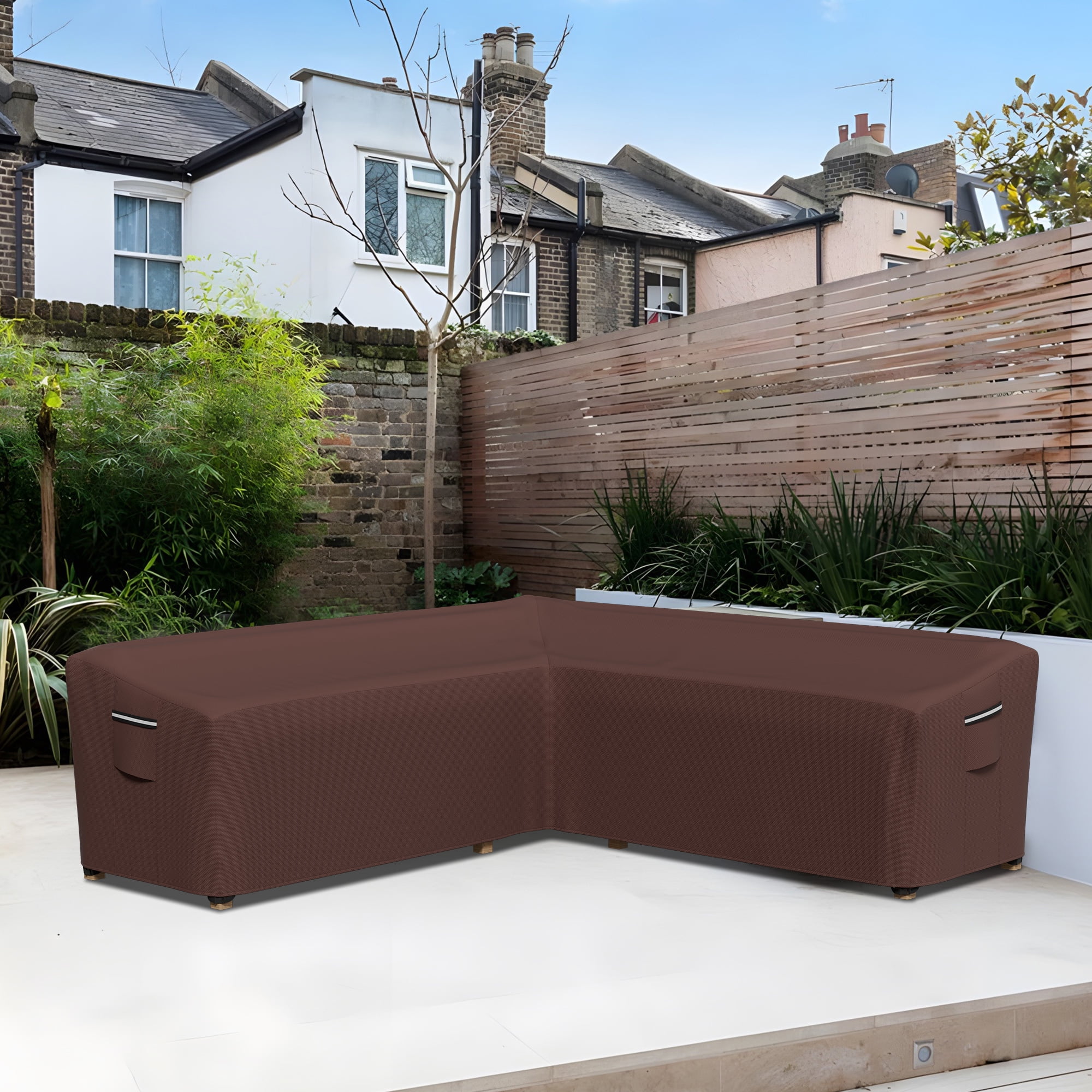 Description: Crafted with weatherproof and water-resistant Gardelle fabric, STARTWO 600D Thickened L-Shaped Outdoor Sectional Cover features a water-repellent fabric top with a protective laminated undercoating. Enjoy the convenience of padded handles for easy fitting and removal. The cover also includes air vents to reduce condensation and wind lofting. Please note that it does not cover the wheels or legs entirely.Invest in the STARTWO Sectional Lounge Set Cover and give your outdoor furniture the long-lasting protection it deserves. Specification: Condition:100% New Type:L-Shaped Color:Brown Size(LxLxDxH):104″x83″x32″x31″ Material:600D Oxford Polyester+PVC Weight:8.8Lbs Pakage Included: 1 x L-Shaped Patio Furniture Cover 1 x Storage bag