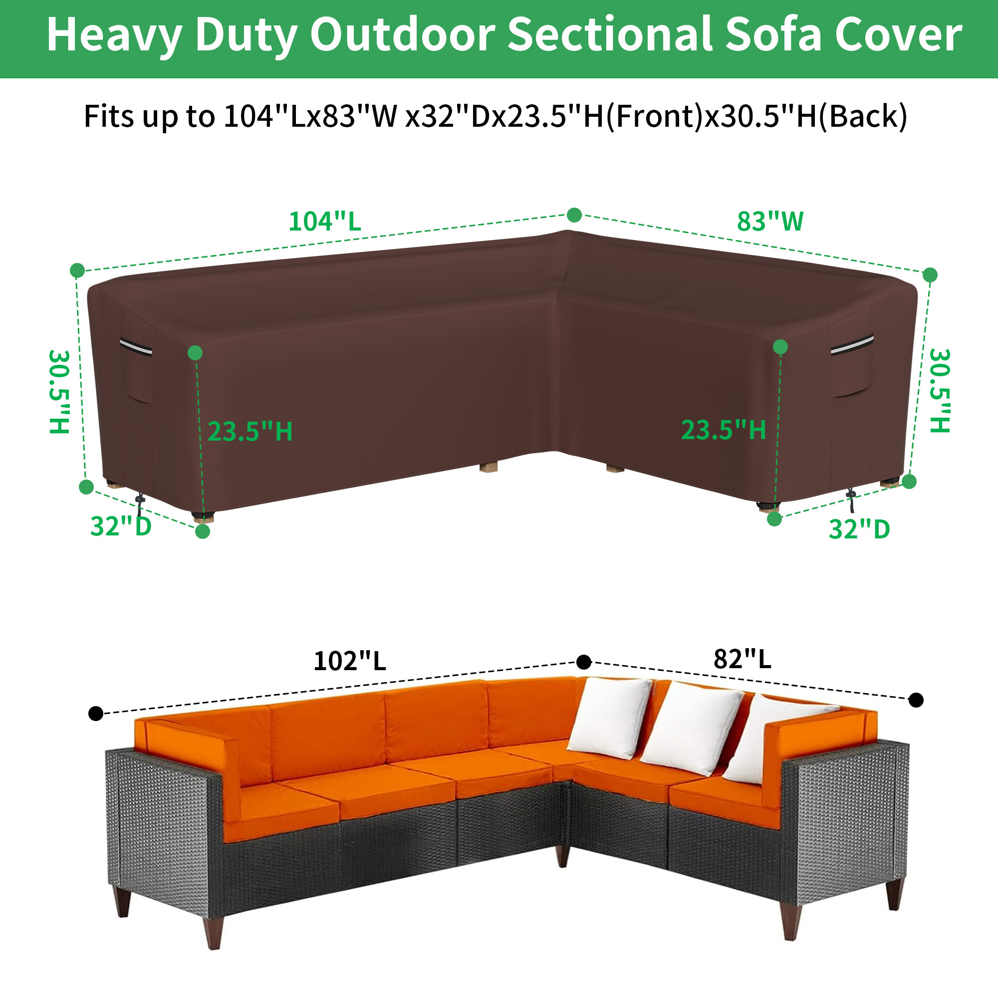 【Large Patio Outdoor L Shaped Sofa Cover】 104″Lx83″Lx32″Dx31″H ,This size fit universal L-shaped sofa cover on market, pls measure your outdoor sectional before purchasing for proper fit. 【Premium Outdoor Sectional Sofa Cover】 Made of 600D high density oxford fabric which is more thicker and durable than other material, not easy to tear, can effectively protect your furniture from rain, sunlight, snow, dust etc. 【Waterproof Patio Sectional Cover】 Built in waterproof PVC coating can prevent your patio sectional getting wet, double stitching seams with waterproof sealed, prevents the rain from penetrating through stitching holes of the seams, no worries about water leaking through seams. 【Anti-UV and Windproof Outdoor Sectional Sofa Cover】 Inner UV stabilized coating provides exceptional anti-uv protection under the sunlight. Buckle strap and adjustable hem cord provides a customizable fit with exceptional security in the windiest conditions. 【Special Design】 1.Our L-shaped sectional furniture cover designed with two air vents for better airflow and keep weather out providing maximum ventilation and minimum condensation. 2.Large padded handles make removal easy.