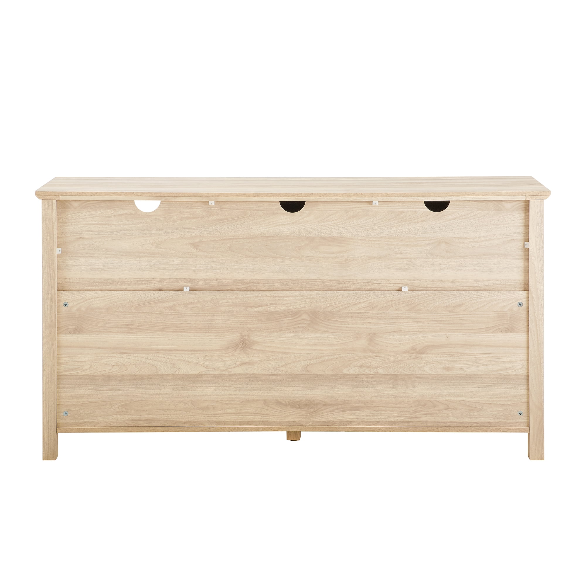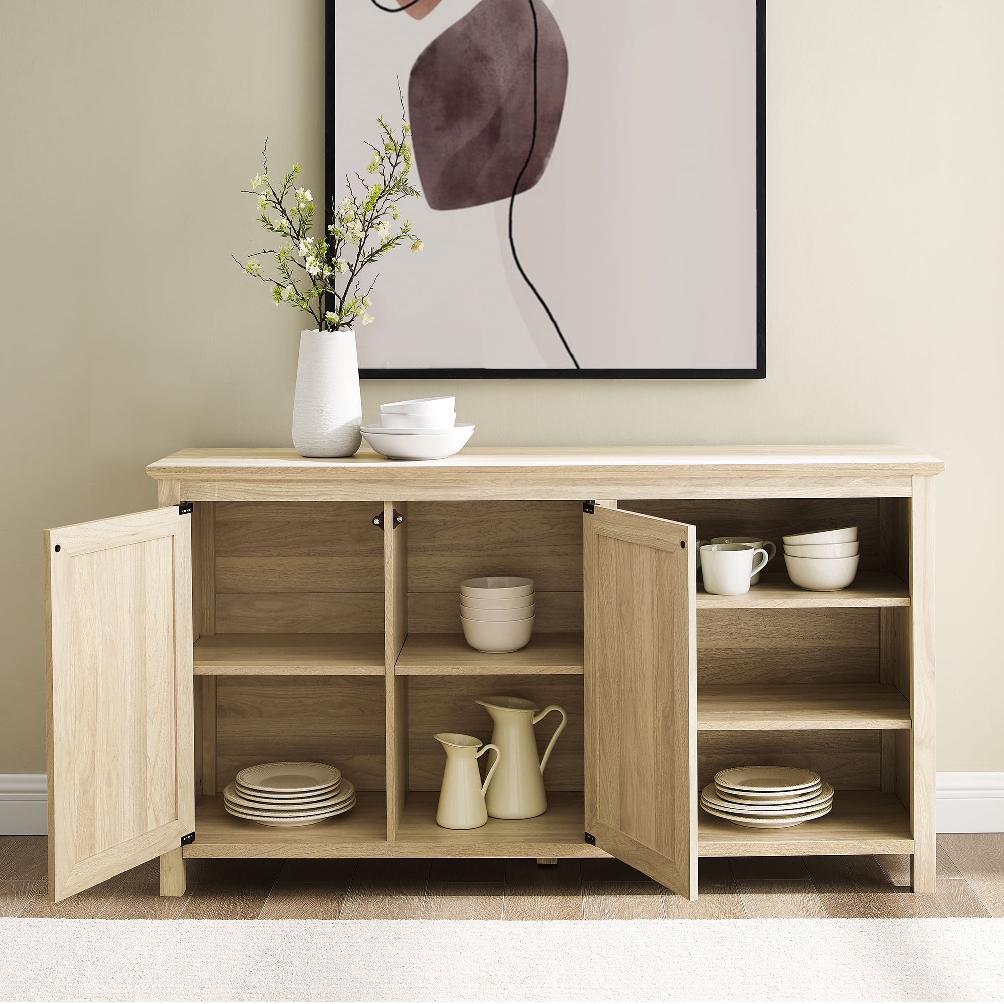 Transitional coastal sideboard Birch finish 2 doors with metal pin hinges 4 adjustable shelves 3 cord management holes Open and closed storage Accommodates TVs up to 65 inches Materials: Warp-resistant MDF, durable laminate, and powder-coated metal Assembly: Assembly required with step-by-step instructions Packaged dimensions: 8″ H x 65″ L x 21″ W Assembled Dimensions: 31” H x 58” L x 15.75” W