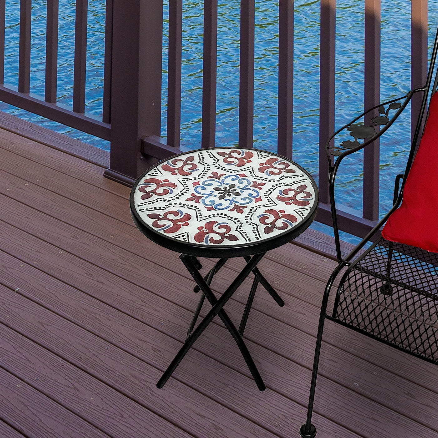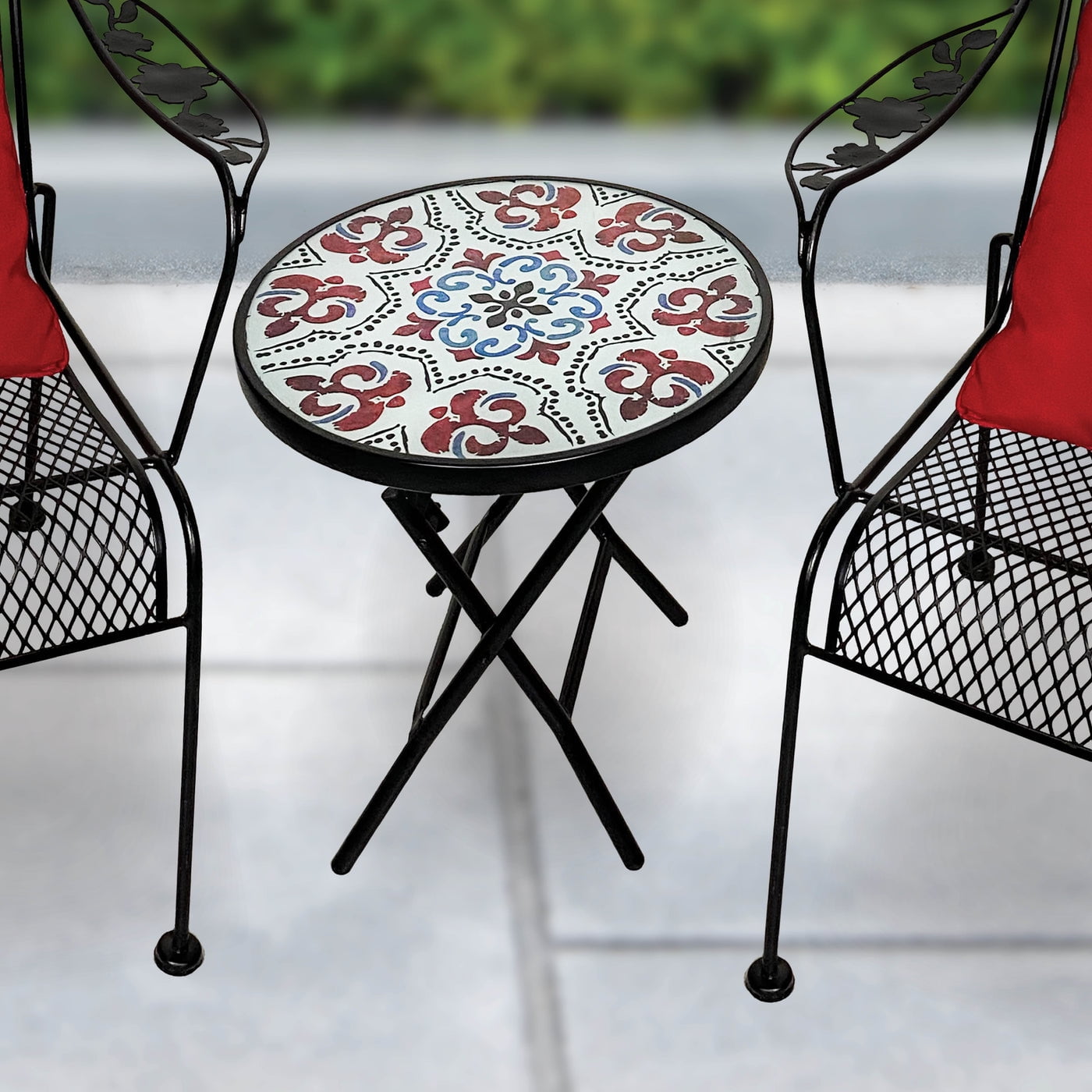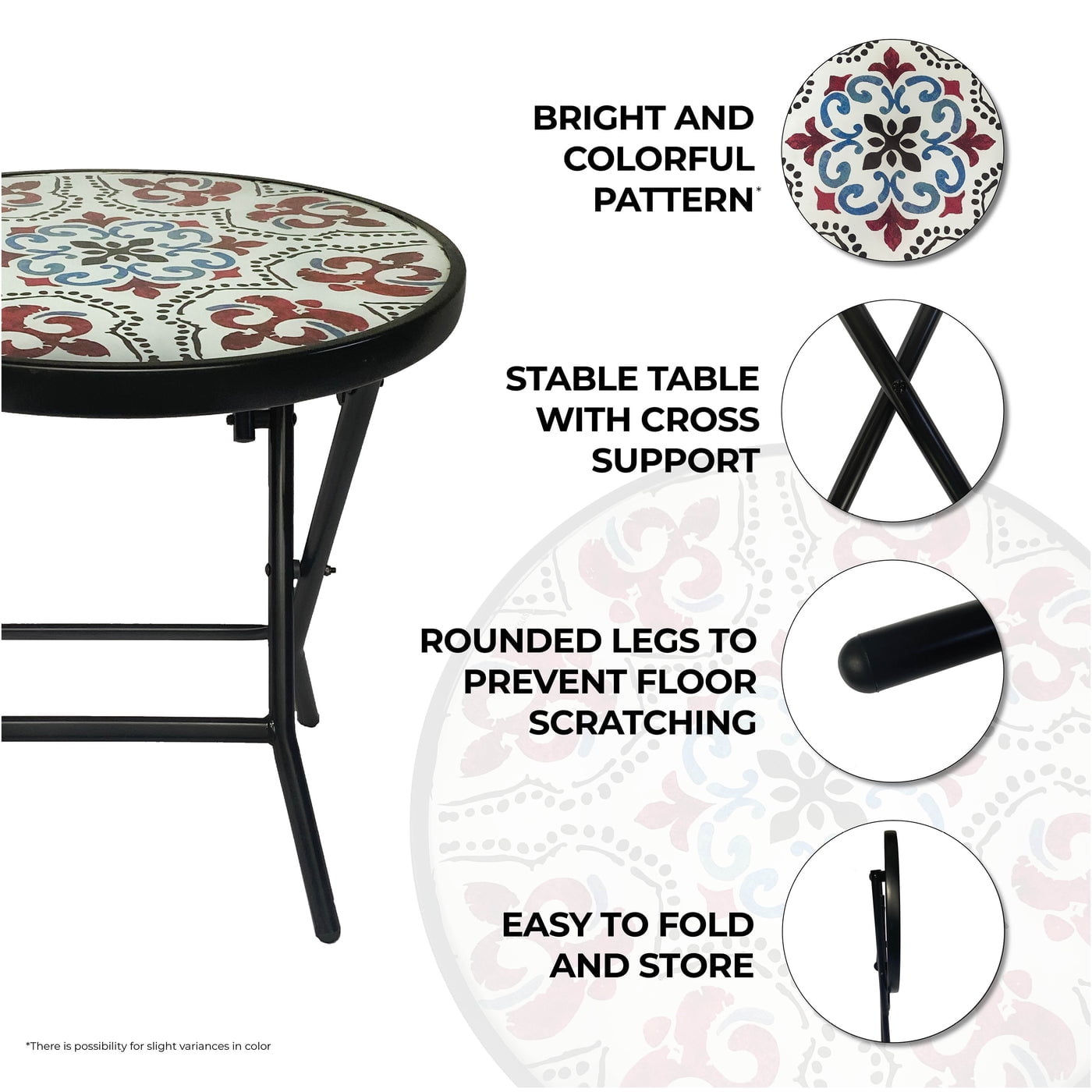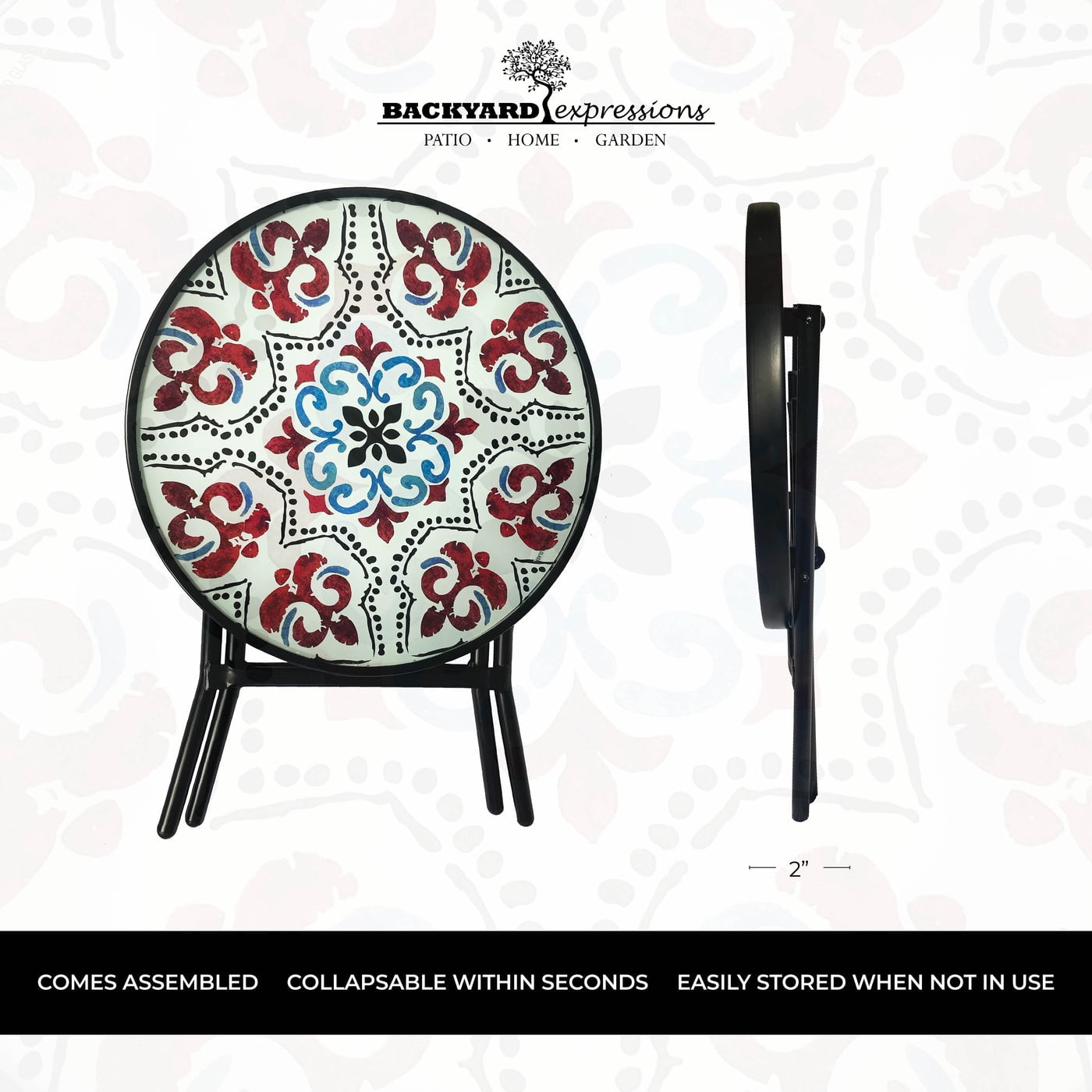 Add some color to any are of your yard with this Backyard Expressions foldable table. Folds easy for storage, with no assembly needed. This table features a beautiful glass top and powder coated steel frame.