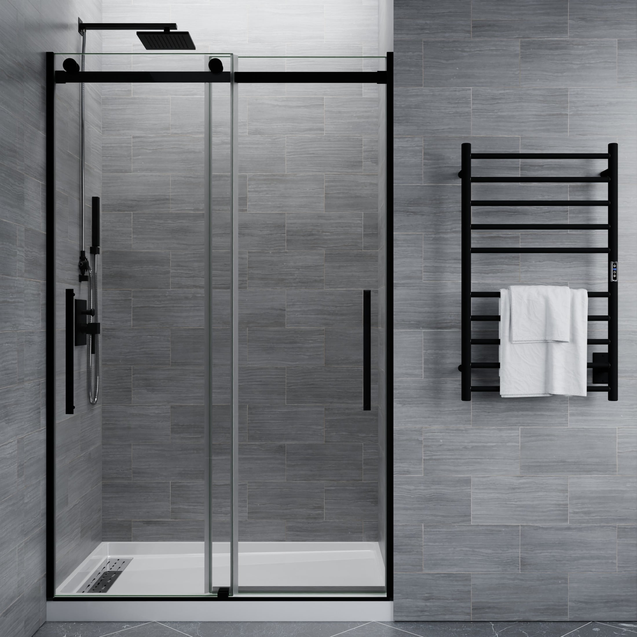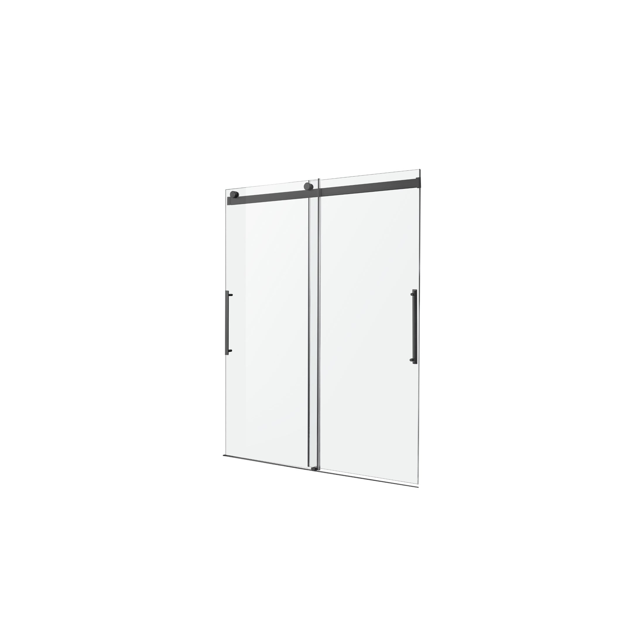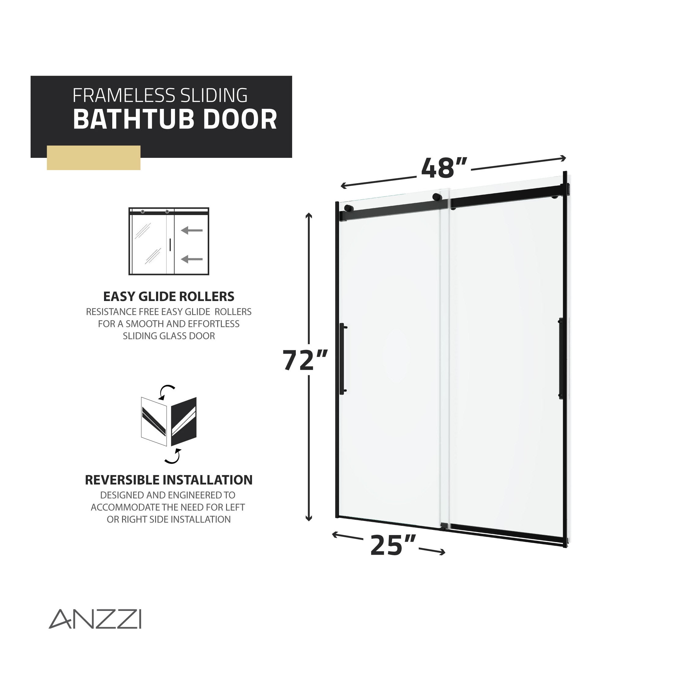 5/16 in. tempered Deco-Glass is ANSI-certified to be safe, strong, and durable The ultramodern frameless design with double sliding doors gives your shower a premium look Double-sided Tsunami Guard shielding repels water to protect against cloudy build-up and keep glass crystal clear Stunning, vibrant stainless steel and aluminum hardware is Rhino Alloy-certified Finished in your choice of beautiful Matte Black Rhino Alloy-certified stainless steel rollers make opening and closing effortless Package includes everything you need — guide rail, door stopper, glass bracket, four (4) high forged rollers, threshold and cover, two (2) stainless steel door handles, splash proof seals Versatile symmetrical design allows for left or right installation — whatever fits your space! Overall dimensions: 48 in. W x 76 in. H Walk-in opening size: 25-1/8 in. Protected by our Limited Lifetime Warranty