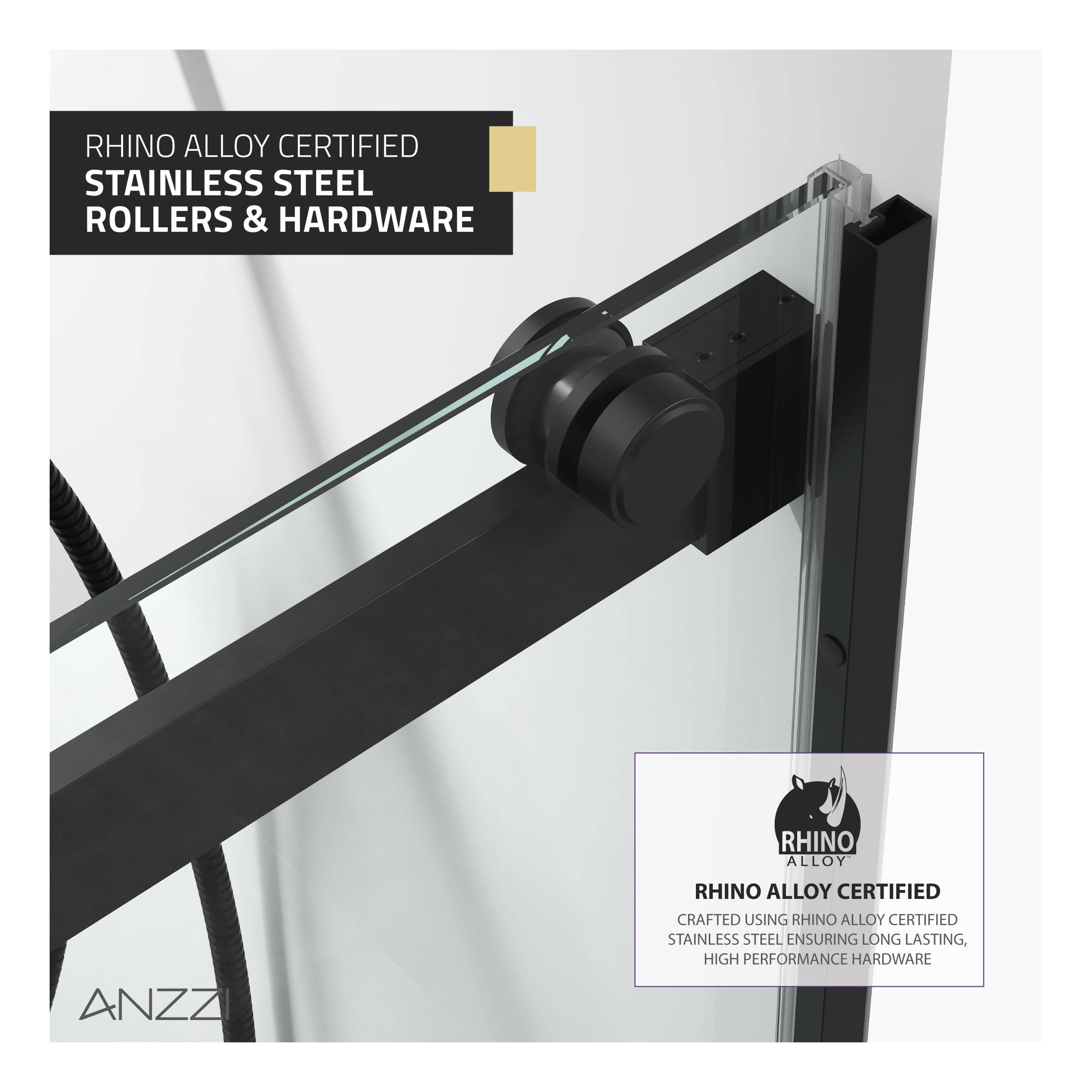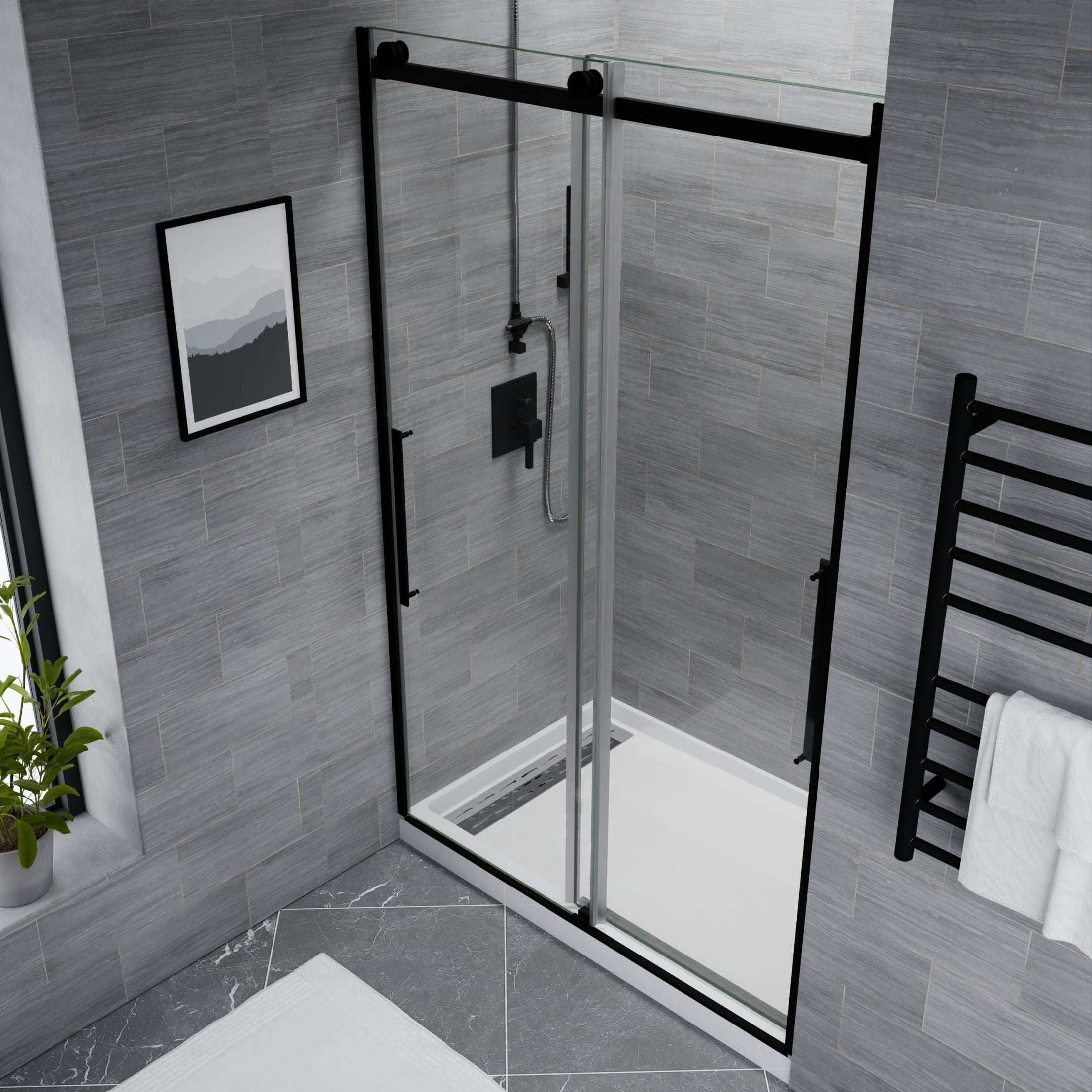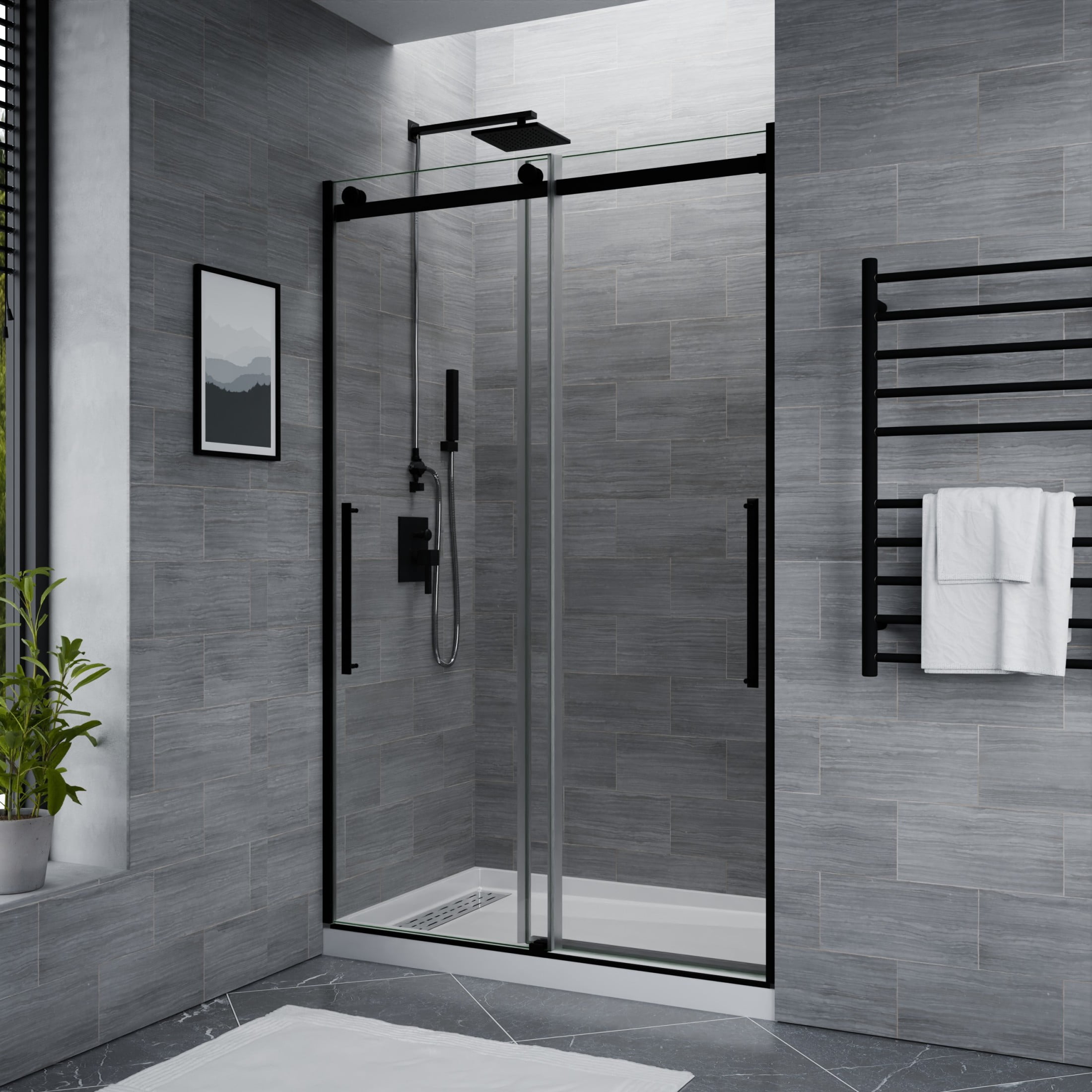 5/16 in. tempered Deco-Glass is ANSI-certified to be safe, strong, and durable The ultramodern frameless design with double sliding doors gives your shower a premium look Double-sided Tsunami Guard shielding repels water to protect against cloudy build-up and keep glass crystal clear Stunning, vibrant stainless steel and aluminum hardware is Rhino Alloy-certified Finished in your choice of beautiful Matte Black Rhino Alloy-certified stainless steel rollers make opening and closing effortless Package includes everything you need — guide rail, door stopper, glass bracket, four (4) high forged rollers, threshold and cover, two (2) stainless steel door handles, splash proof seals Versatile symmetrical design allows for left or right installation — whatever fits your space! Overall dimensions: 48 in. W x 76 in. H Walk-in opening size: 25-1/8 in. Protected by our Limited Lifetime Warranty