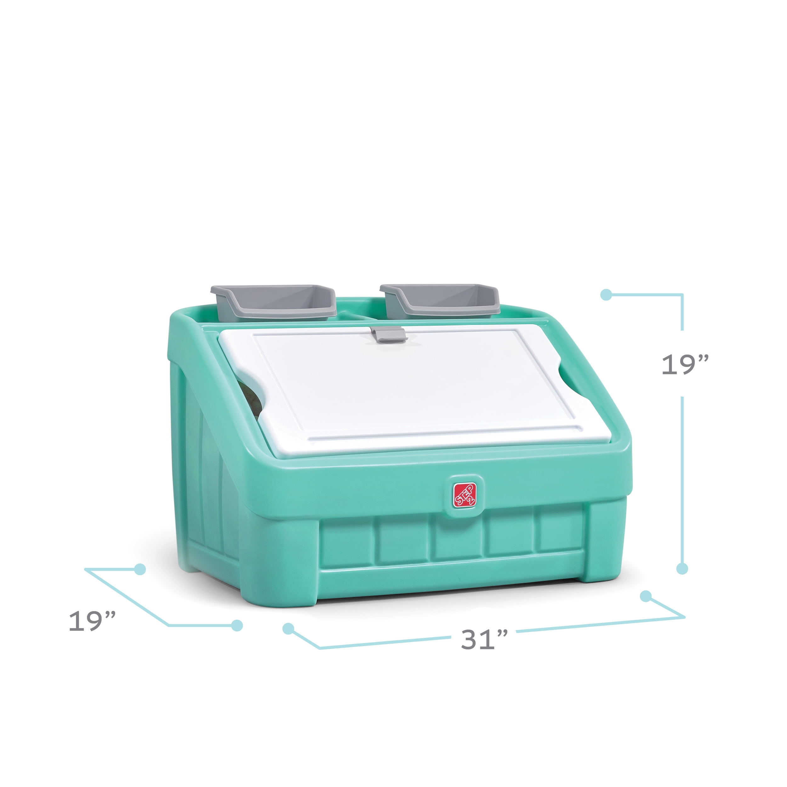 Toybox Plastic construction Lid doubles as an art board used as a coloring or writing surface Art clip lets kids decorate their toy box by displaying their artwork 4.5 cubic feet (0.13 cubic meters) of interior storage space Ideal for a bedroom or play area Recommended for children ages 2 and up Available in mint green