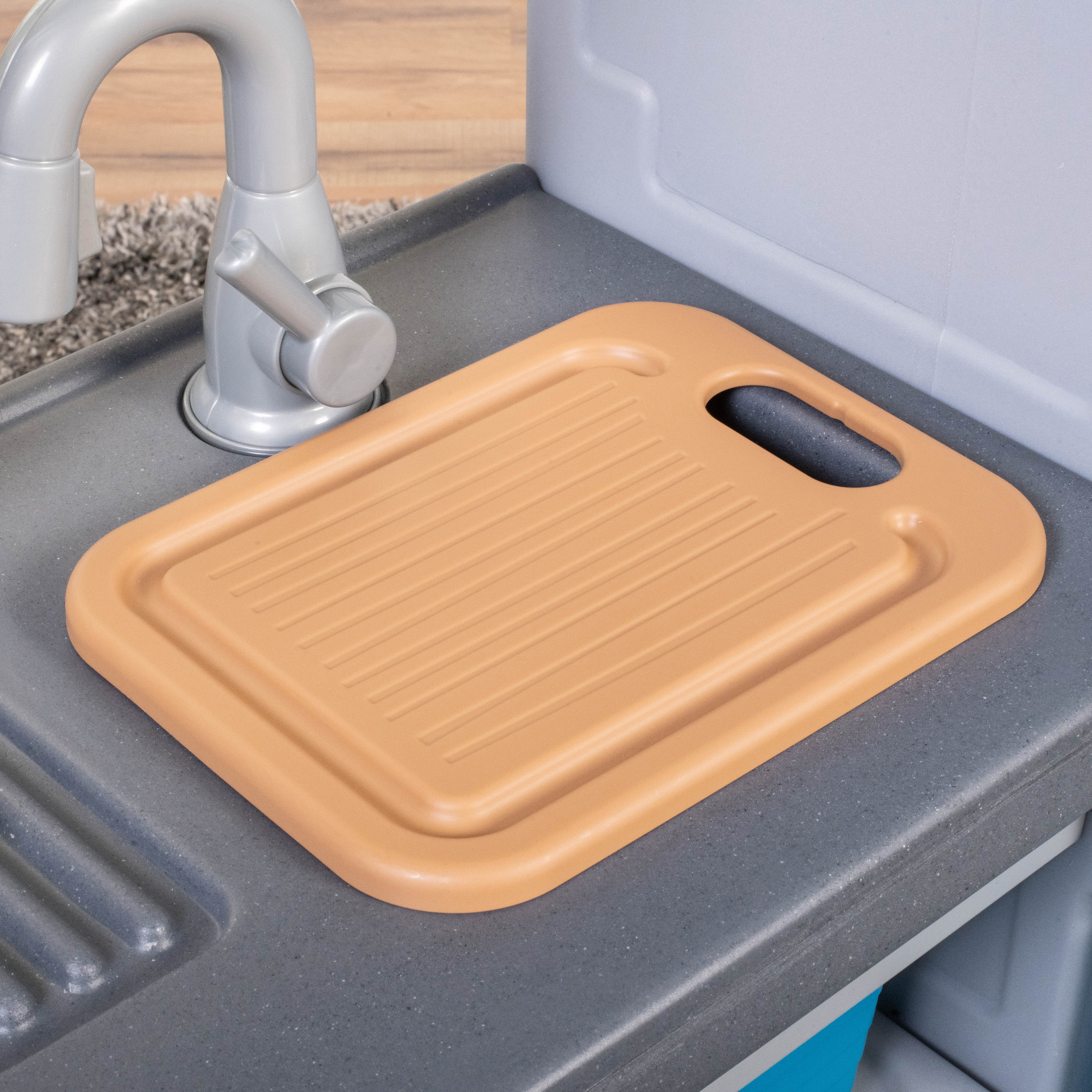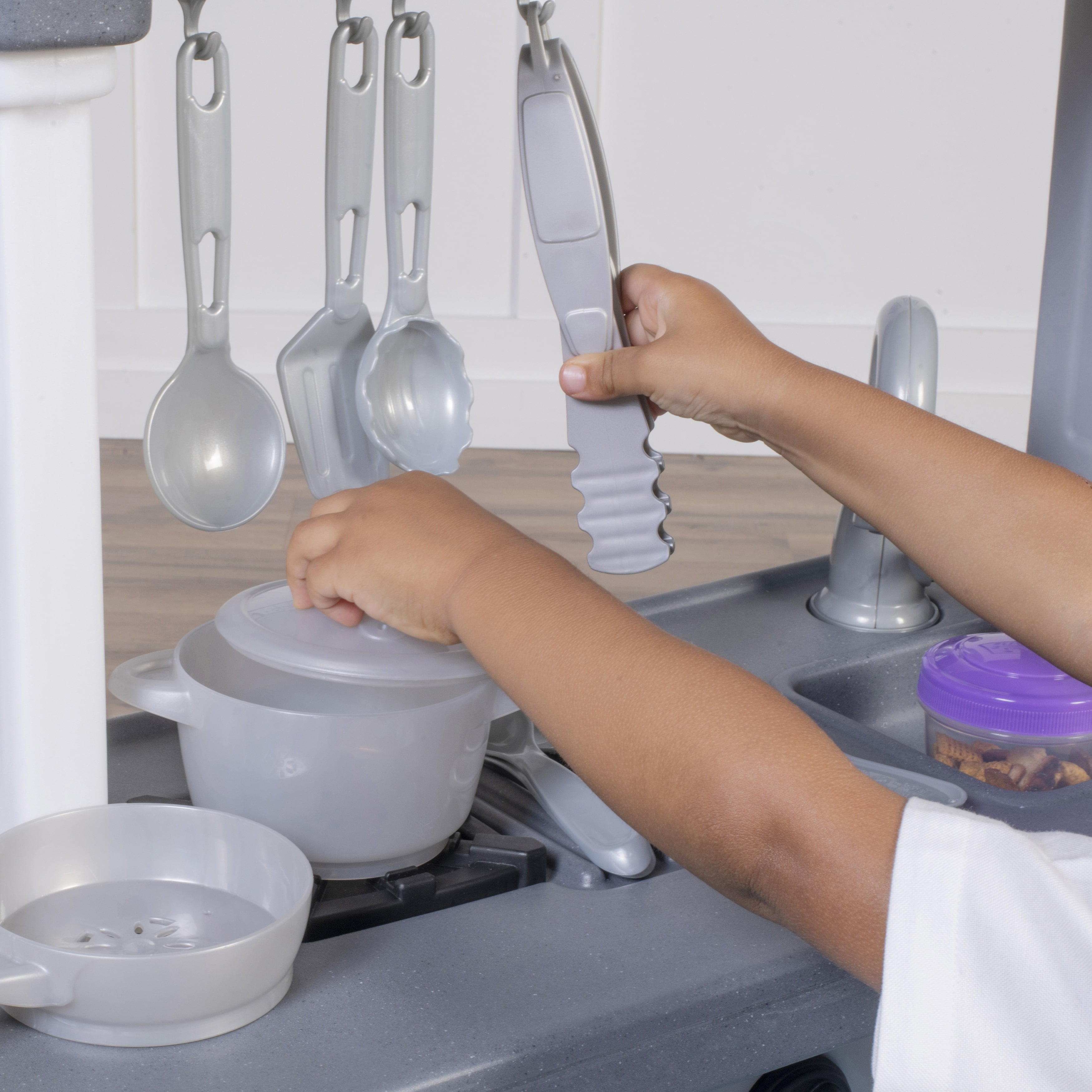 The Step2 Cooking Time Kitchen playset for kids is an immersive pretend kitchen designed for children ages two and up, featuring a range of realistic details that make it a captivating addition to any play area. With its faux stainless steel and lifelike wooden accents, complemented by a vintage-style fridge and freezer, this kitchen playset blends style and functionality seamlessly. Parents will appreciate its elegant design, while kids will be enchanted by its numerous interactive features. Little ones can stay engaged by turning the sink on and off, opening the oven door, and adjusting the clock, all of which provide a realistic play experience. The set includes 23 accessories, enhancing the pretend cooking adventure. A specially designed cutting board fits perfectly over the sink, offering additional prep space for creating imaginative meals. The stove’s clicker knobs simulate real cooking, and the electronic lights and sounds automatically activate when pots and pans are placed on the burner (2 AA batteries required, not included), bringing the play experience to life. Built from durable, high-quality materials, this kitchen playset is engineered to withstand years of enthusiastic play. Its realistic, kid-friendly design is spacious enough for multiple children to play simultaneously, fostering social interaction and collaborative play. Children can role-play a variety of cooking activities, including baking and chopping, mirroring the actions of their adult role models. This playset not only encourages creativity and problem-solving but also promotes teamwork and social skills—all while delivering hours of fun. For assembly and maintenance, please refer to the included instructions manual.