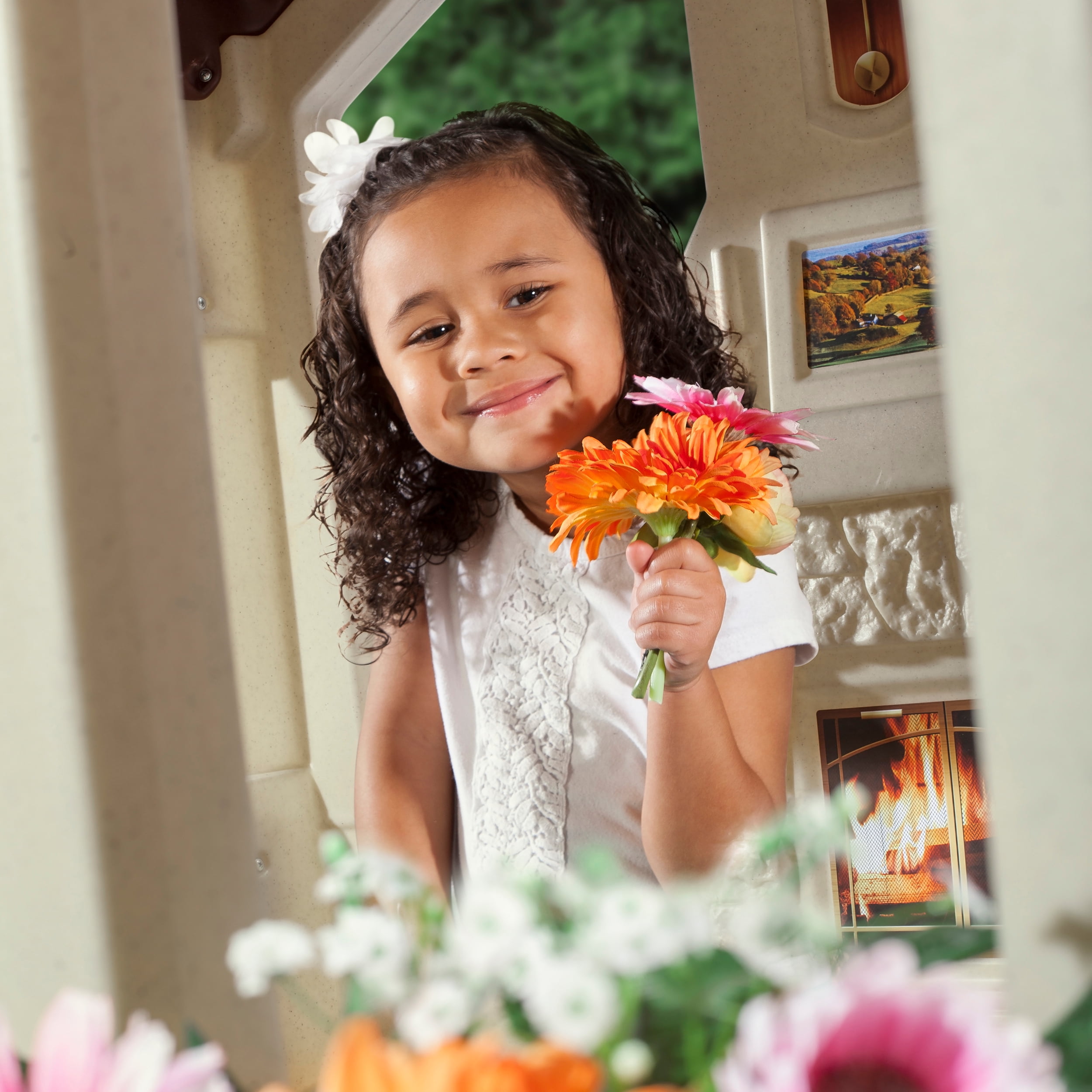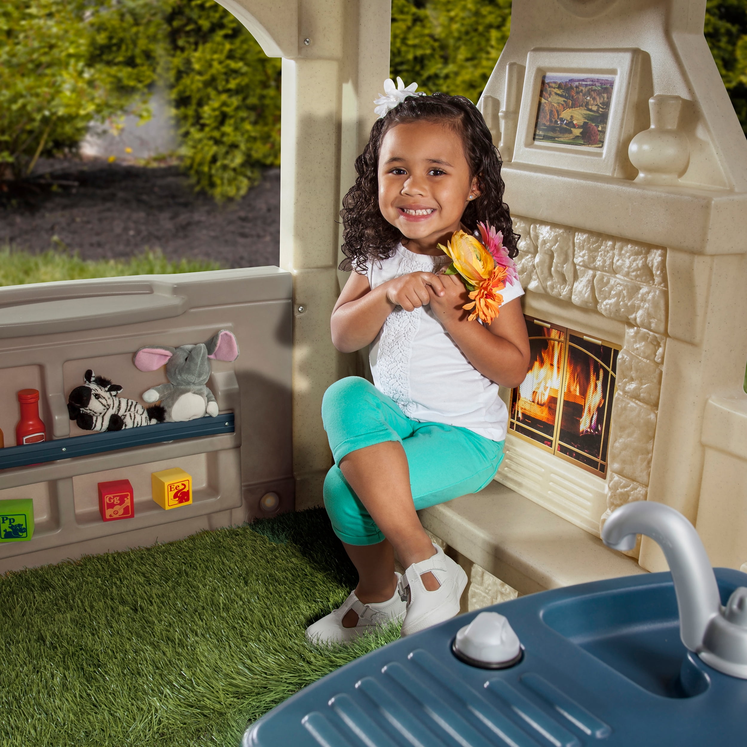 Multiple kids can play together with the open-concept design of this cozy outdoor playhouse! Molded-in sink with swivel faucet, outdoor eating area, shelving, skylight, and fireplace, and more features add to the realistic appeal. Charming design with realistic stone, faux wood finishing, and neutral color palette blend beautifully into backyard play spaces. Electronic doorbell chime requires 2 “AAA” batteries (not included). Easy to clean! Use disinfectant wipes or household cleaners whenever you want! In the box: Playhouse, 2 flowerboxes, decals. Color: Brown Material: Made from Plastic