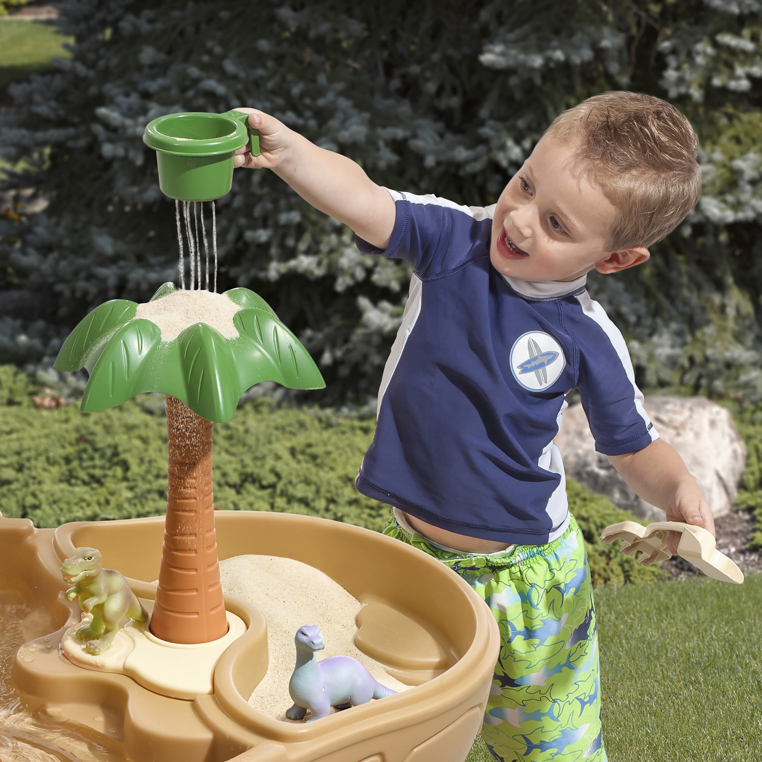 Sand and water activity table Pour water into the top of the volcano and watch as the water gushes down the mountain for a water eruption! 2-sided table features an area for sand and an area for water Use the 2-sided shovel and rake to dig to the bottom to find the molded-in Dino bones and footprints The dinosaurs can get some shade and take a drink from the local watering hole under the realistic palm tree Large kid’s play table allows for multiple kids to play together, great for social and interactive play 7-piece accessory set included Adult assembly required Recommended for ages 2 and up Dimensions: 33 x 29.50 x 30 inches Weight: 14 pounds