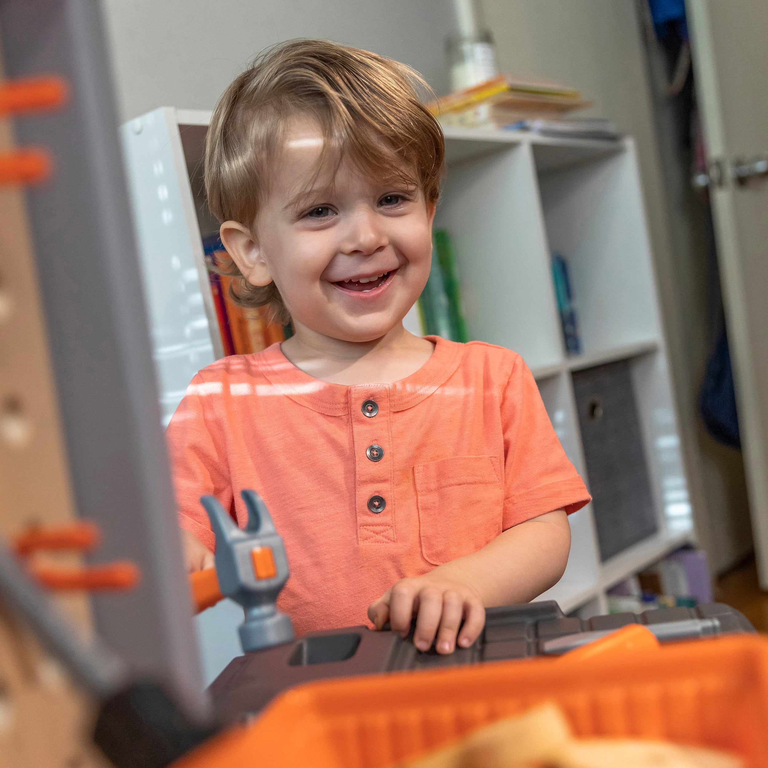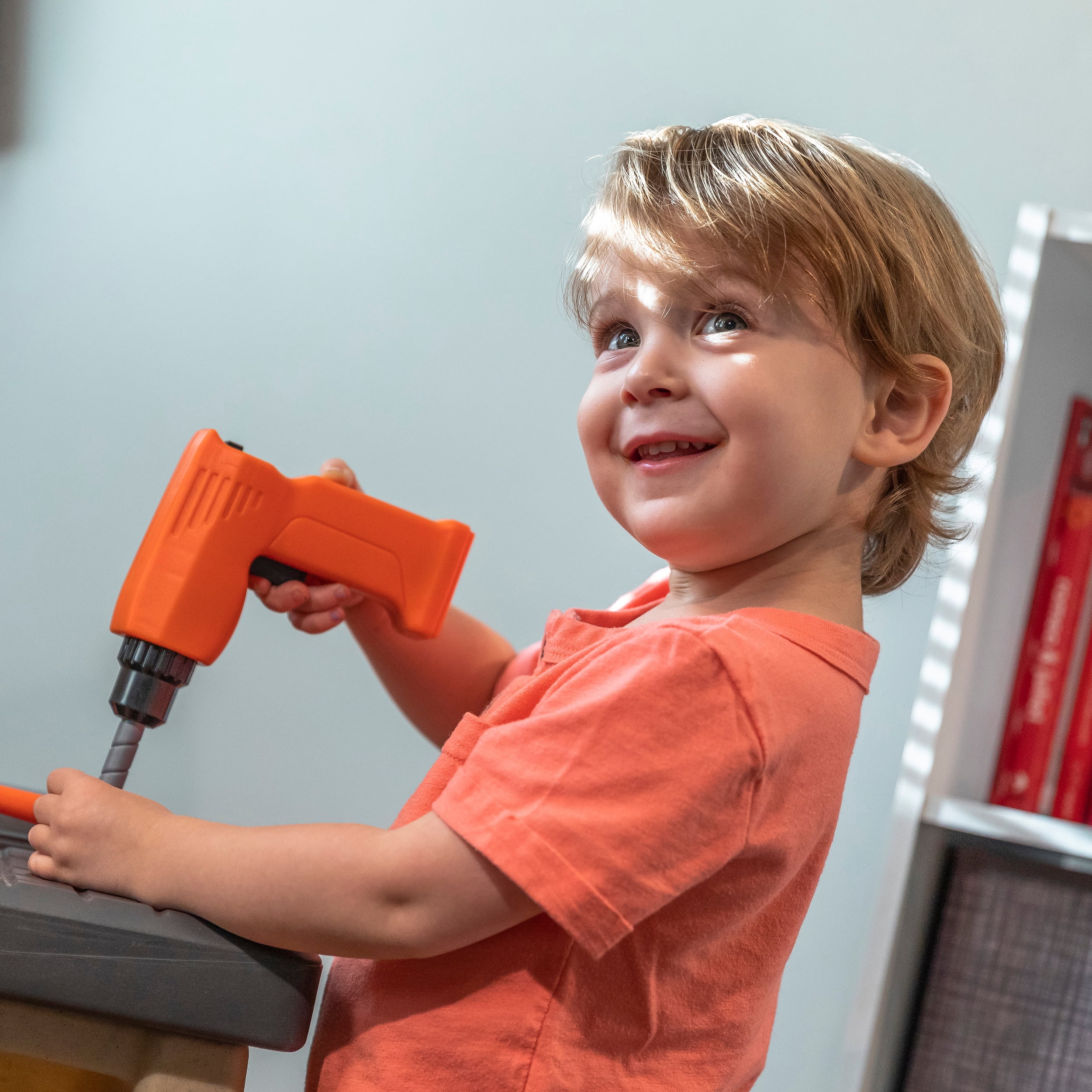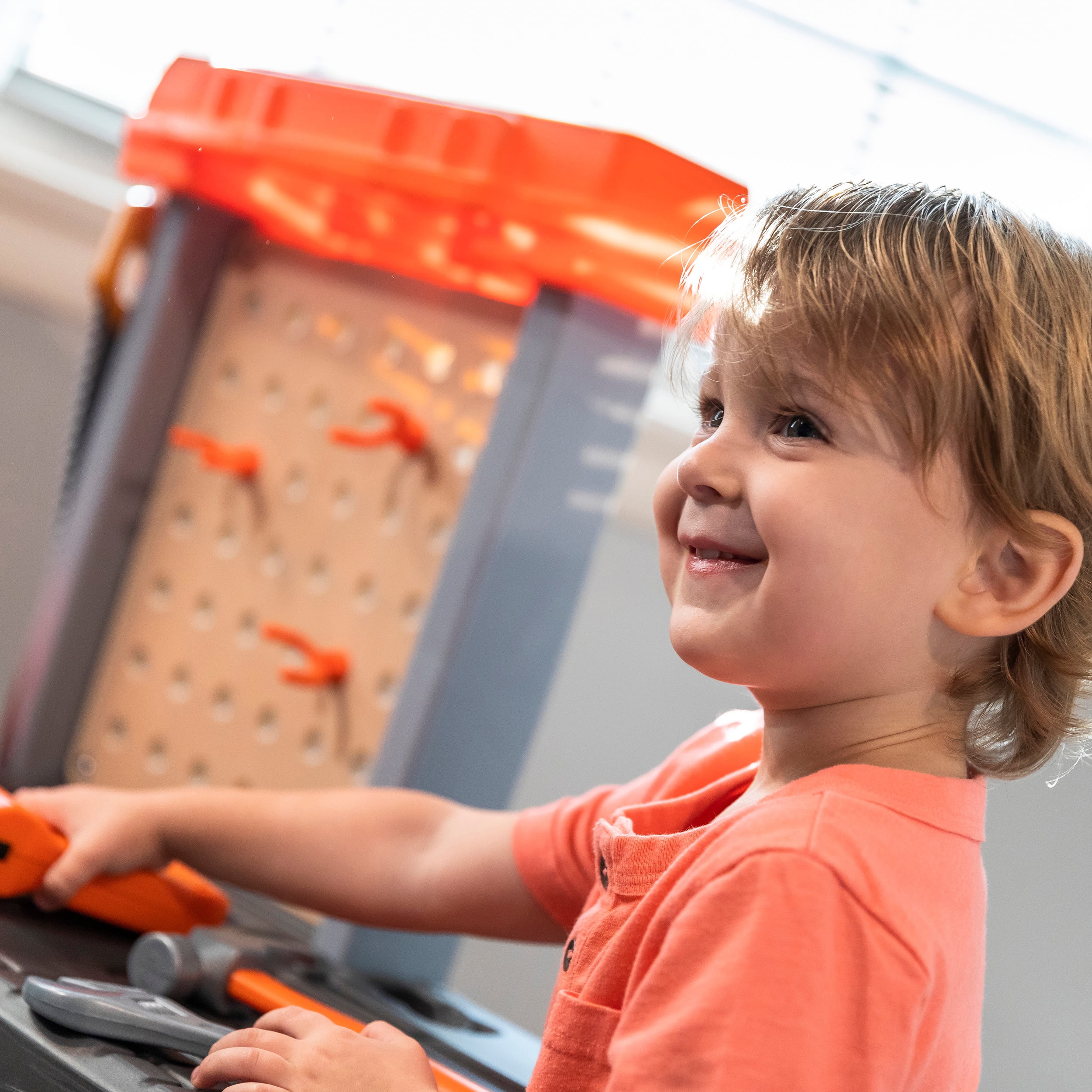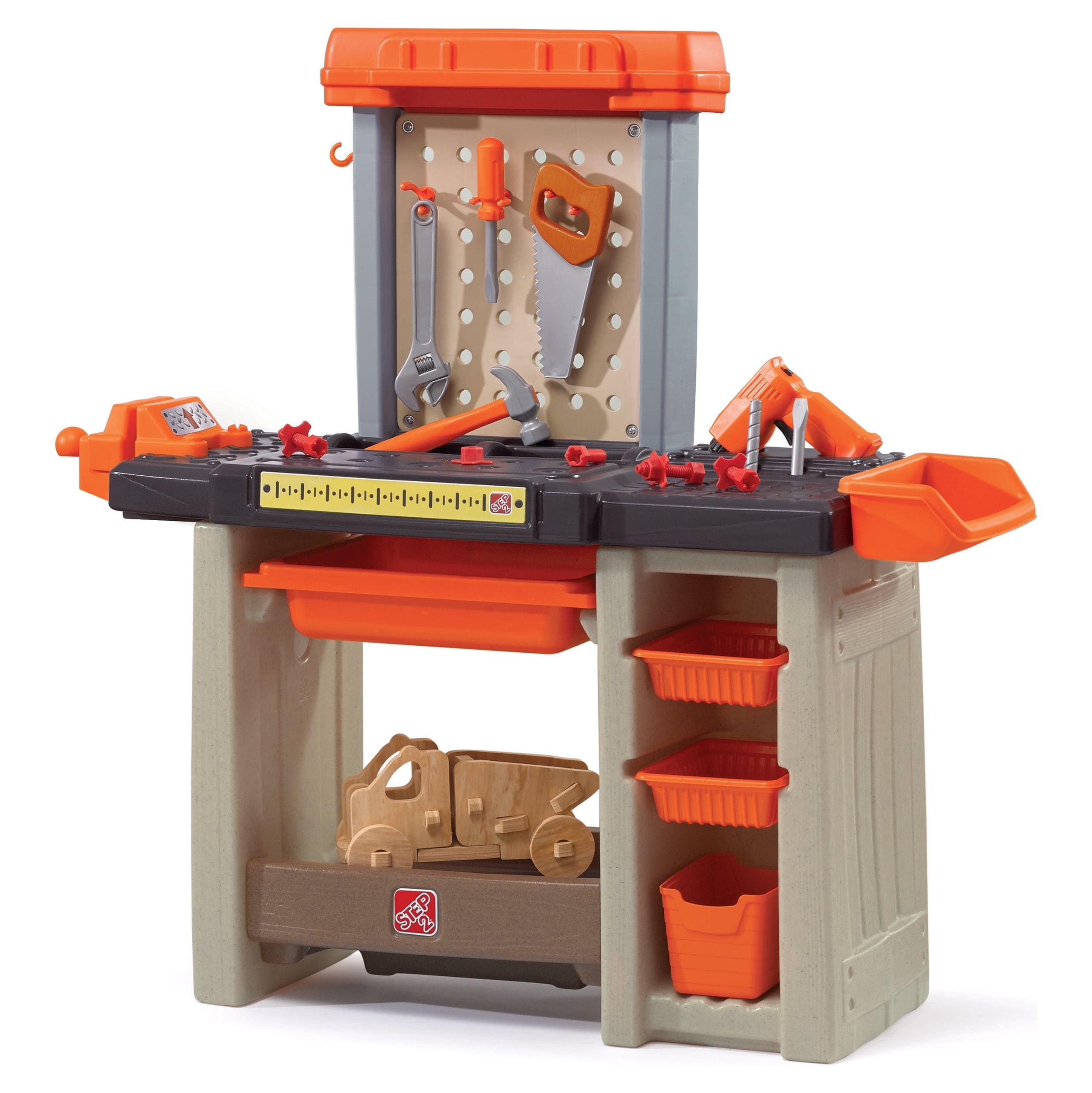 Workbench features a realistic drill with sounds. Workbench features a 30-piece accessory set that includes power tools, projects and a work light When playtime is over, hang your tools on the peg board or store them in the storage bins (included) Large tool bench features a spacious worktop surface for multiple children to build and design! Kids Workshop features a working vise to hold your little ones project steady!