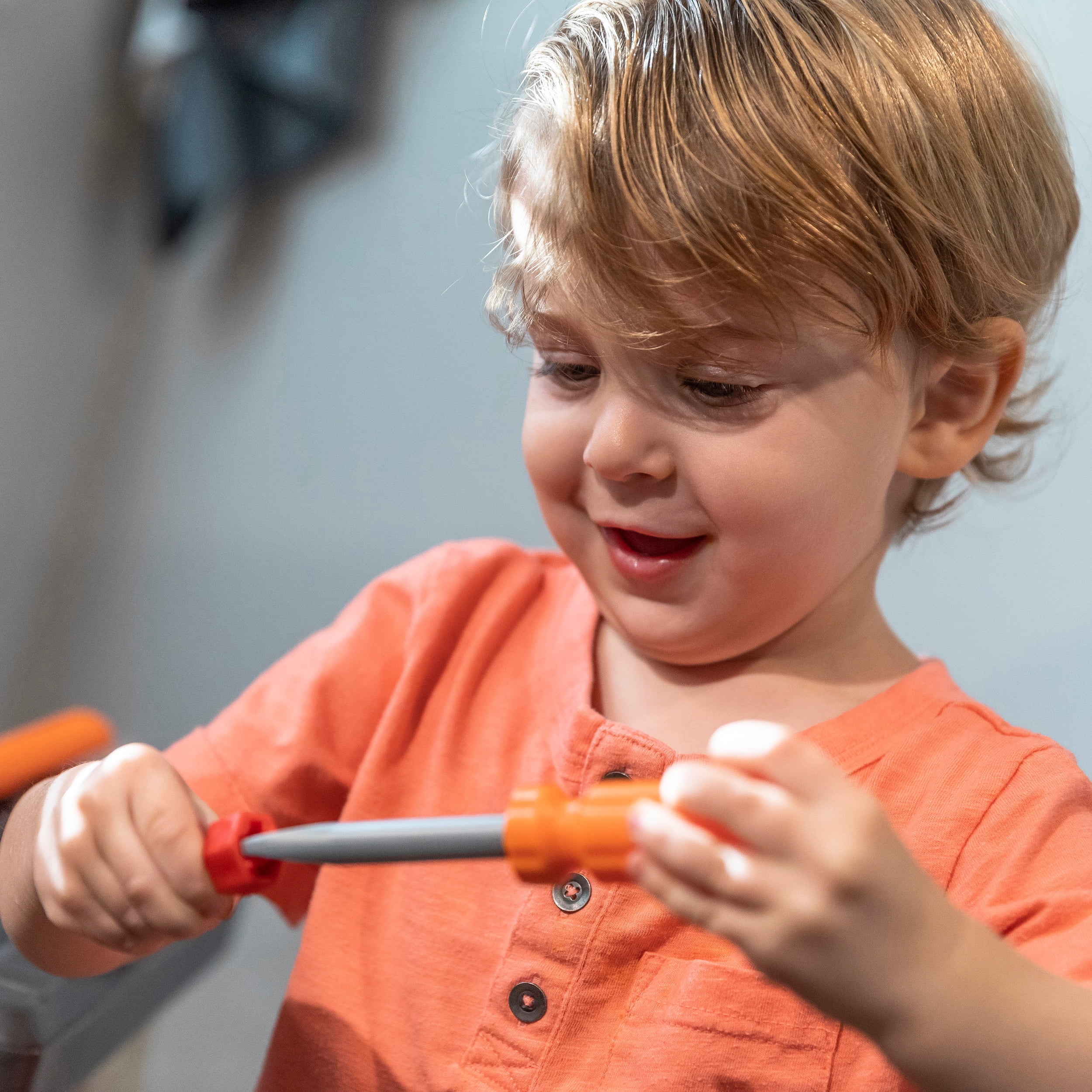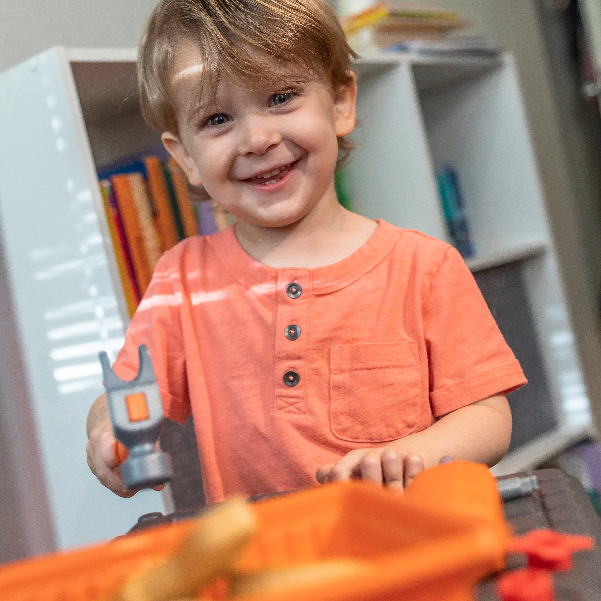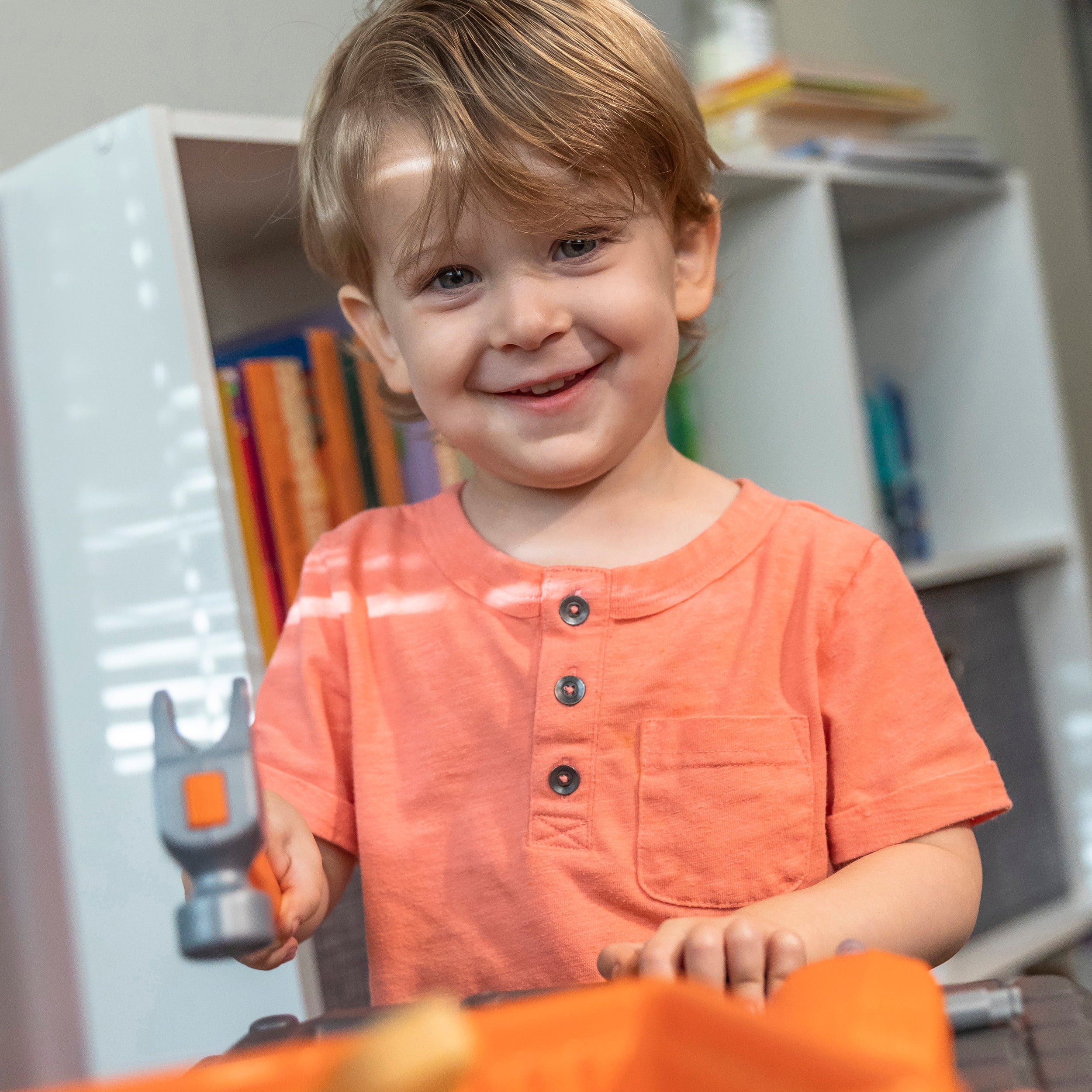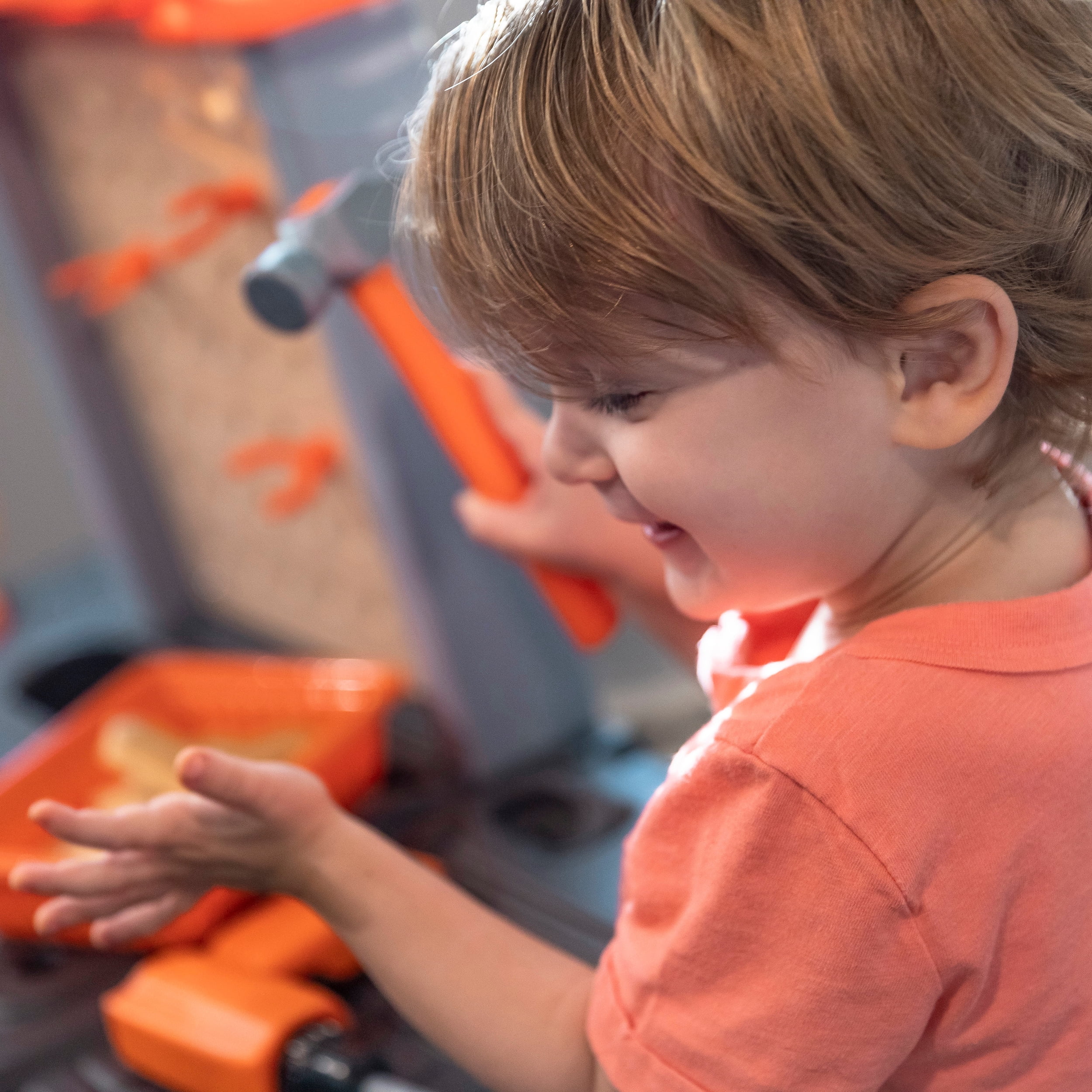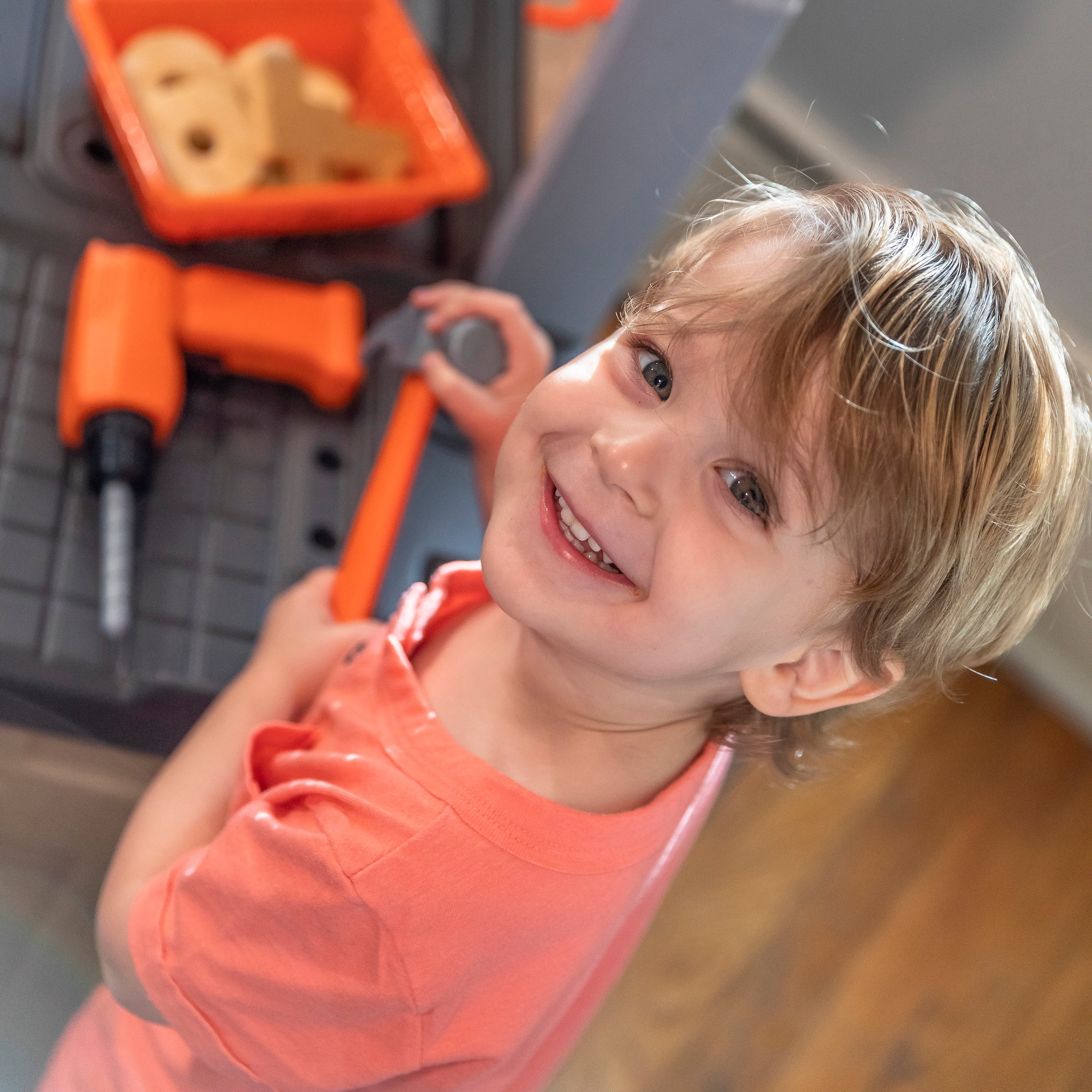 Workbench features a realistic drill with sounds. Workbench features a 30-piece accessory set that includes power tools, projects and a work light When playtime is over, hang your tools on the peg board or store them in the storage bins (included) Large tool bench features a spacious worktop surface for multiple children to build and design! Kids Workshop features a working vise to hold your little ones project steady!