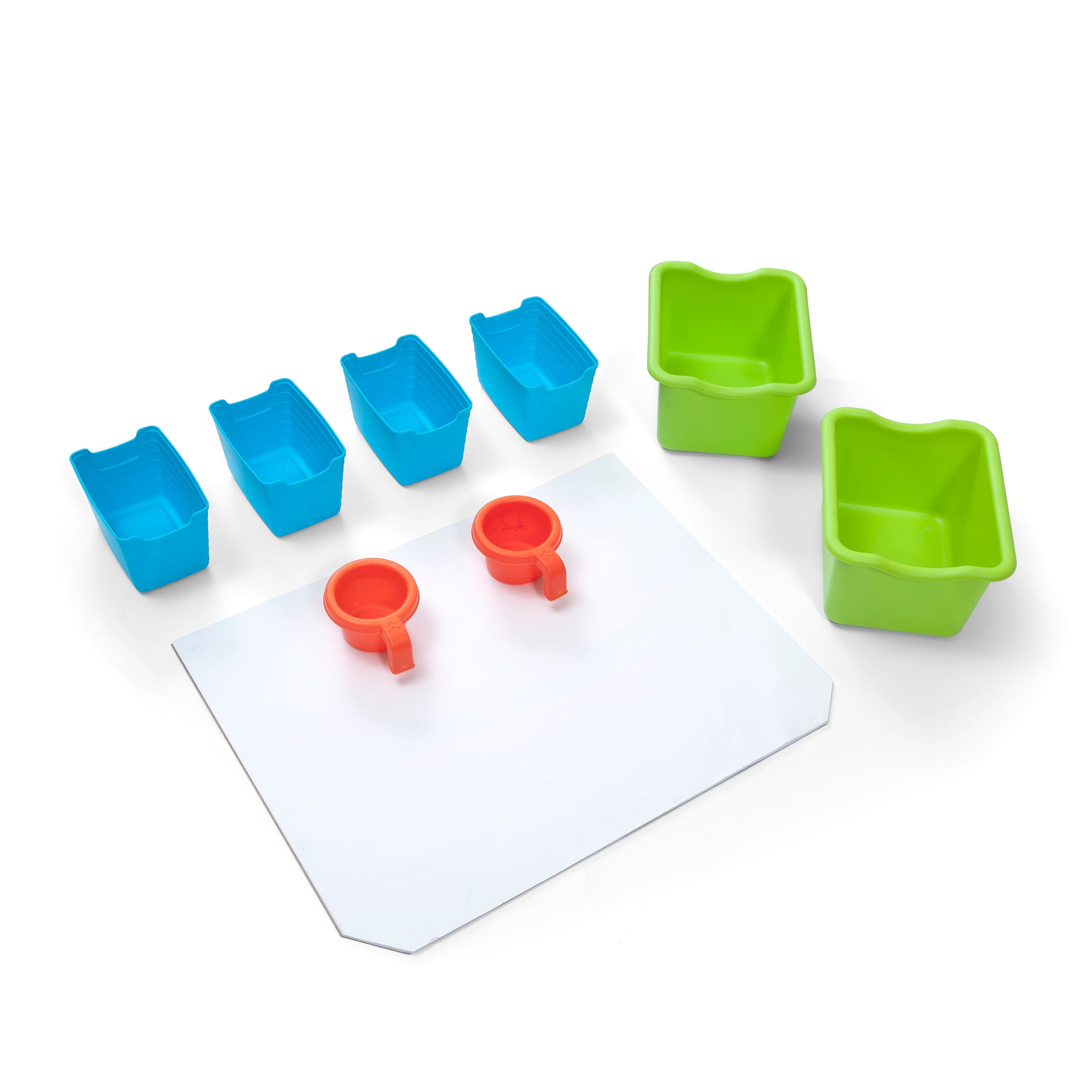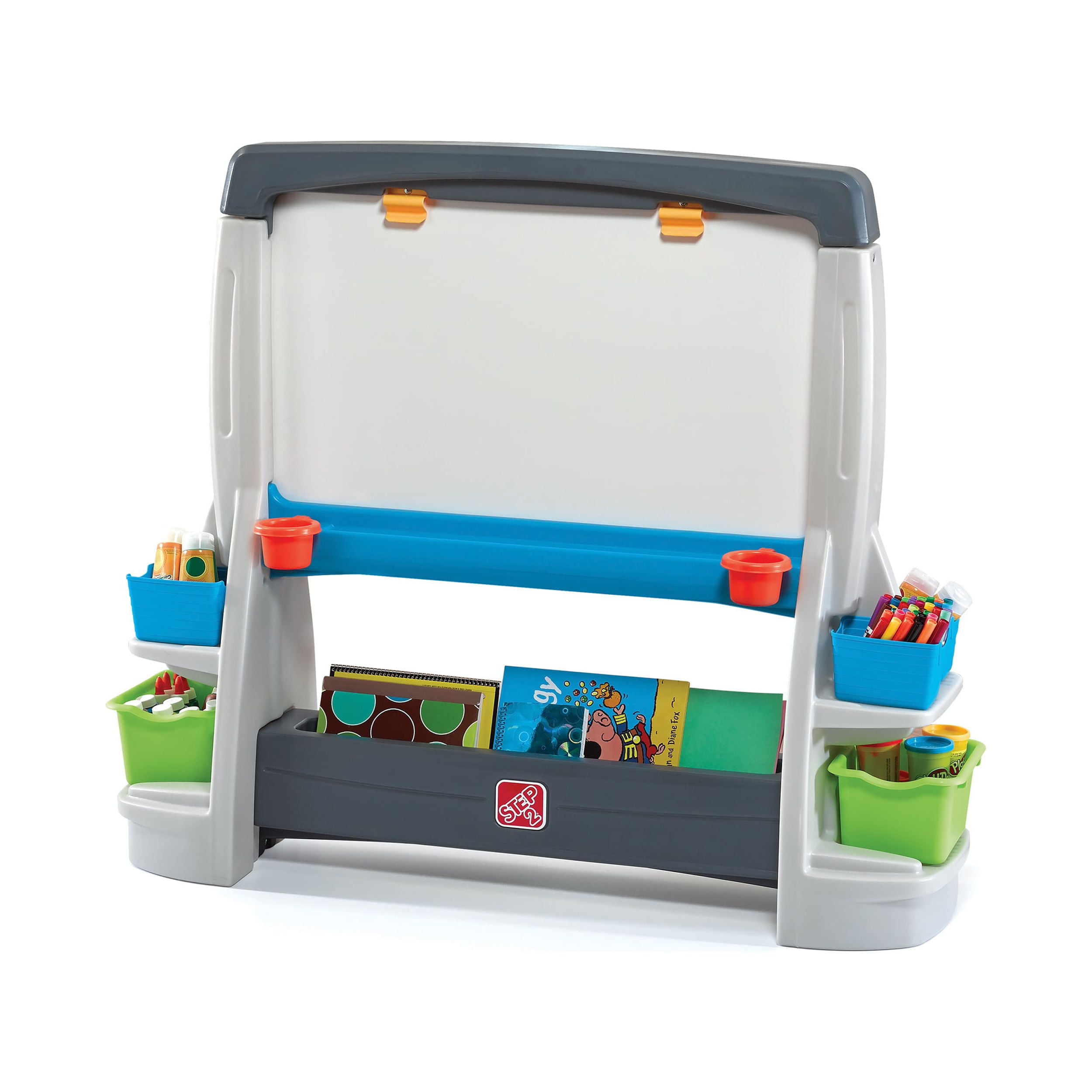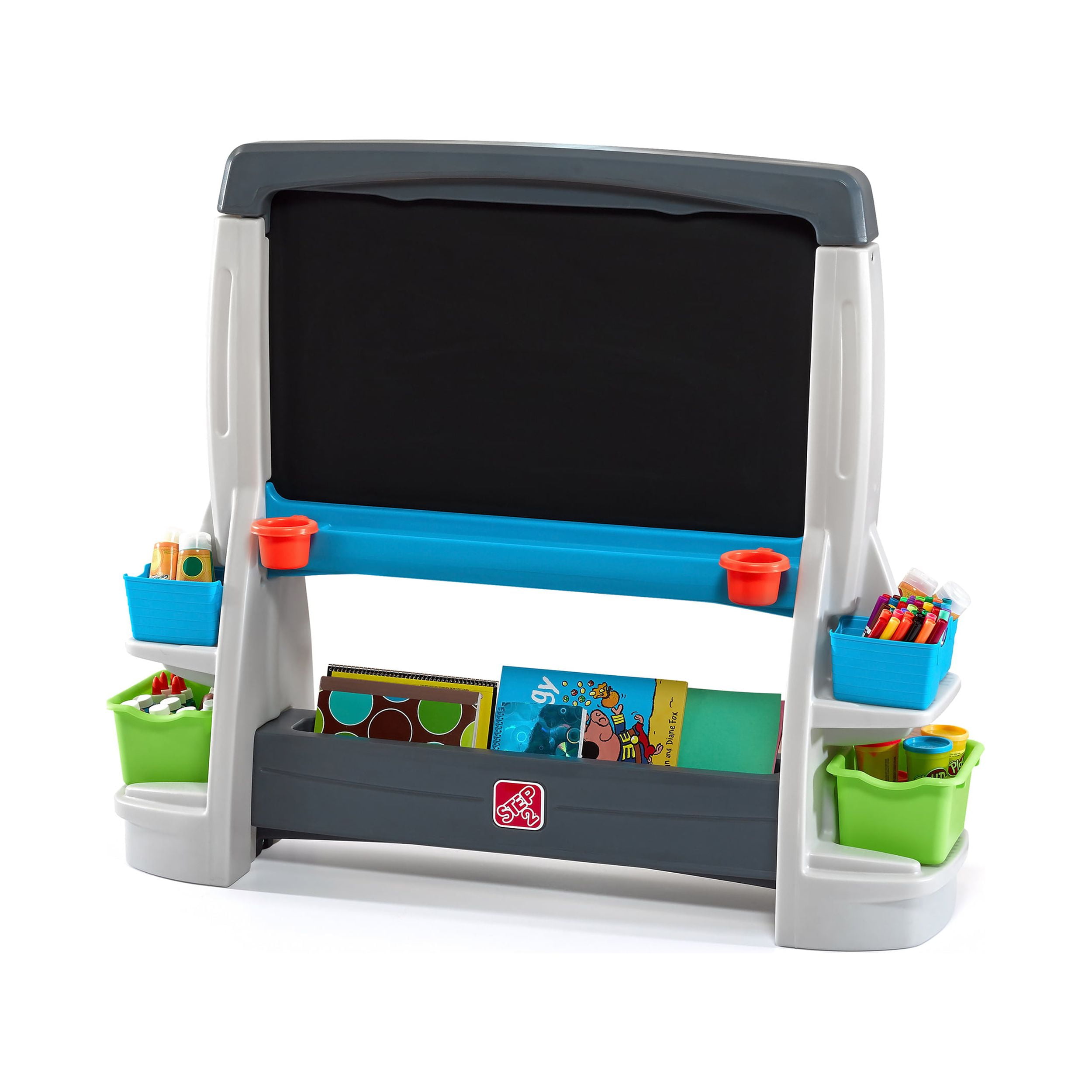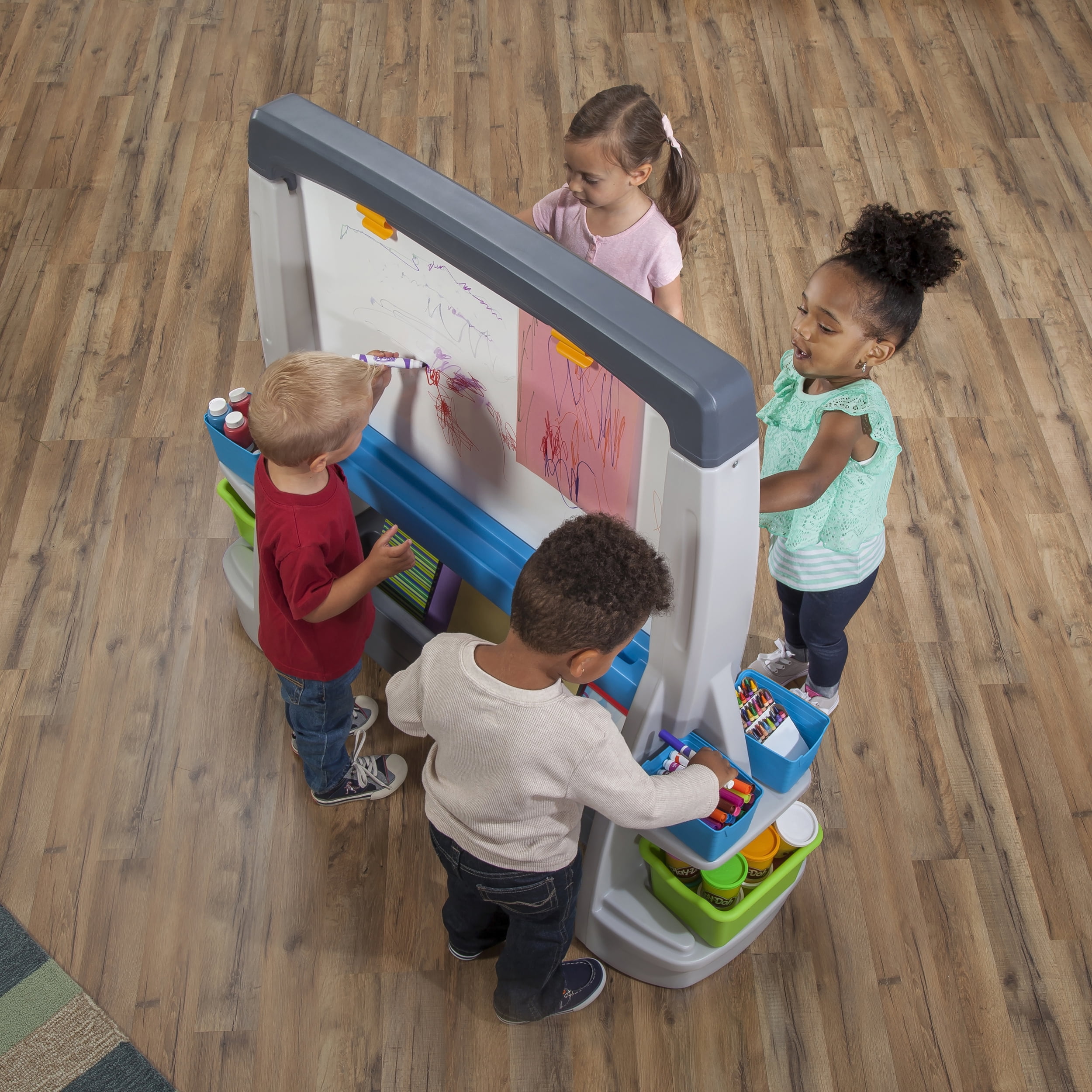 This artist easel for kids features two oversized art surfaces for tons of creativity! Kids can draw, paint, color, and more with the dry erase board on one side and chalkboard on the other. The Step2 Jumbo Art Easel is great for solo creative play and is also a perfect choice for playdates! The two-sided design of this kids’ art easel has plenty of space to create and display masterpieces. Removable bins and a large molded-in storage pocket provide tons of storage space for art supplies. Creative play teaches kids how to express themselves and how to think outside the box! Plus, they’ll practice their fine motor skills by gripping an art tool like paint brushes and crayons. Easy to clean! Use disinfectant wipes or household cleaners whenever you want! In the box: Easel base, two-sided art board, 4 small bins, 2 large bins, and 2 cups.