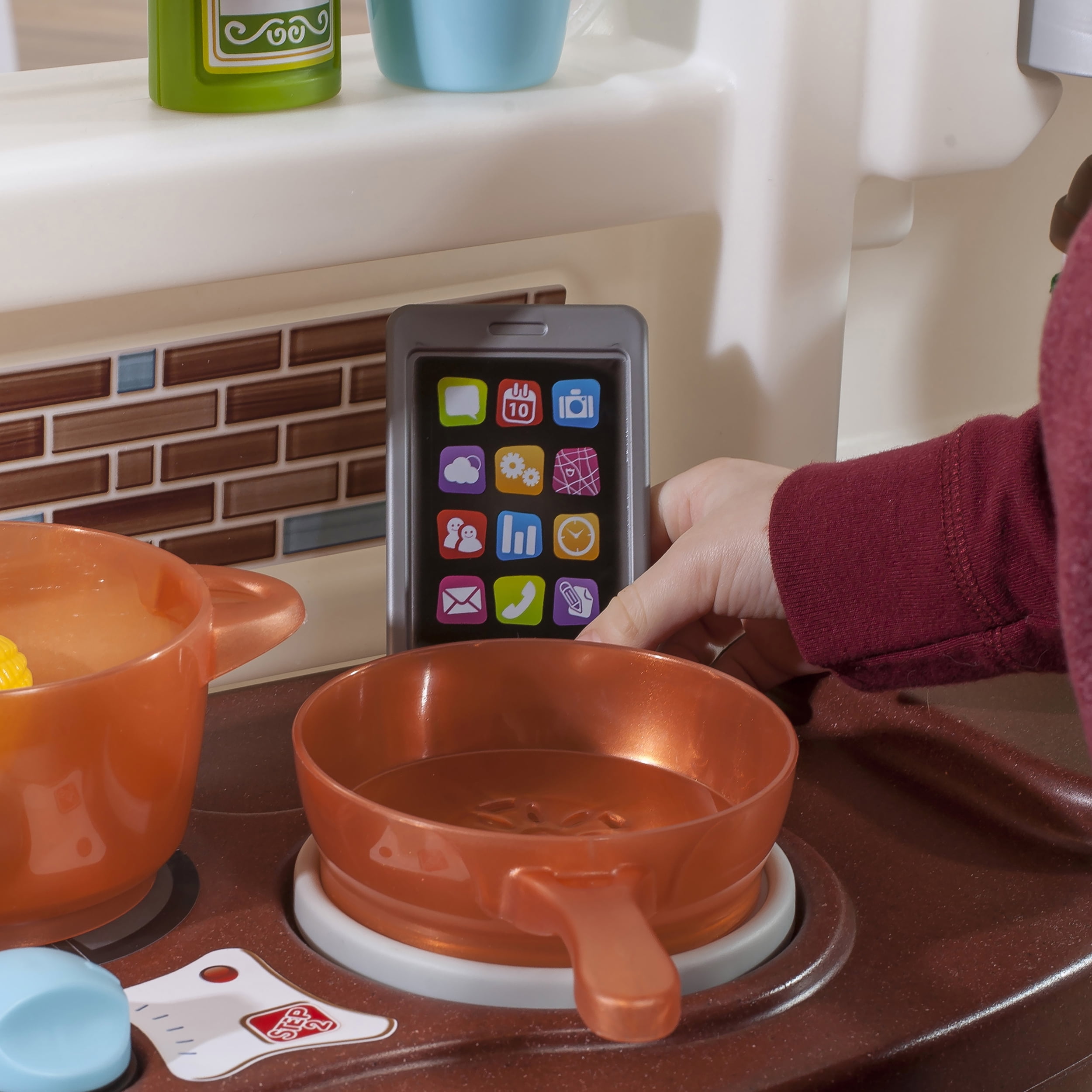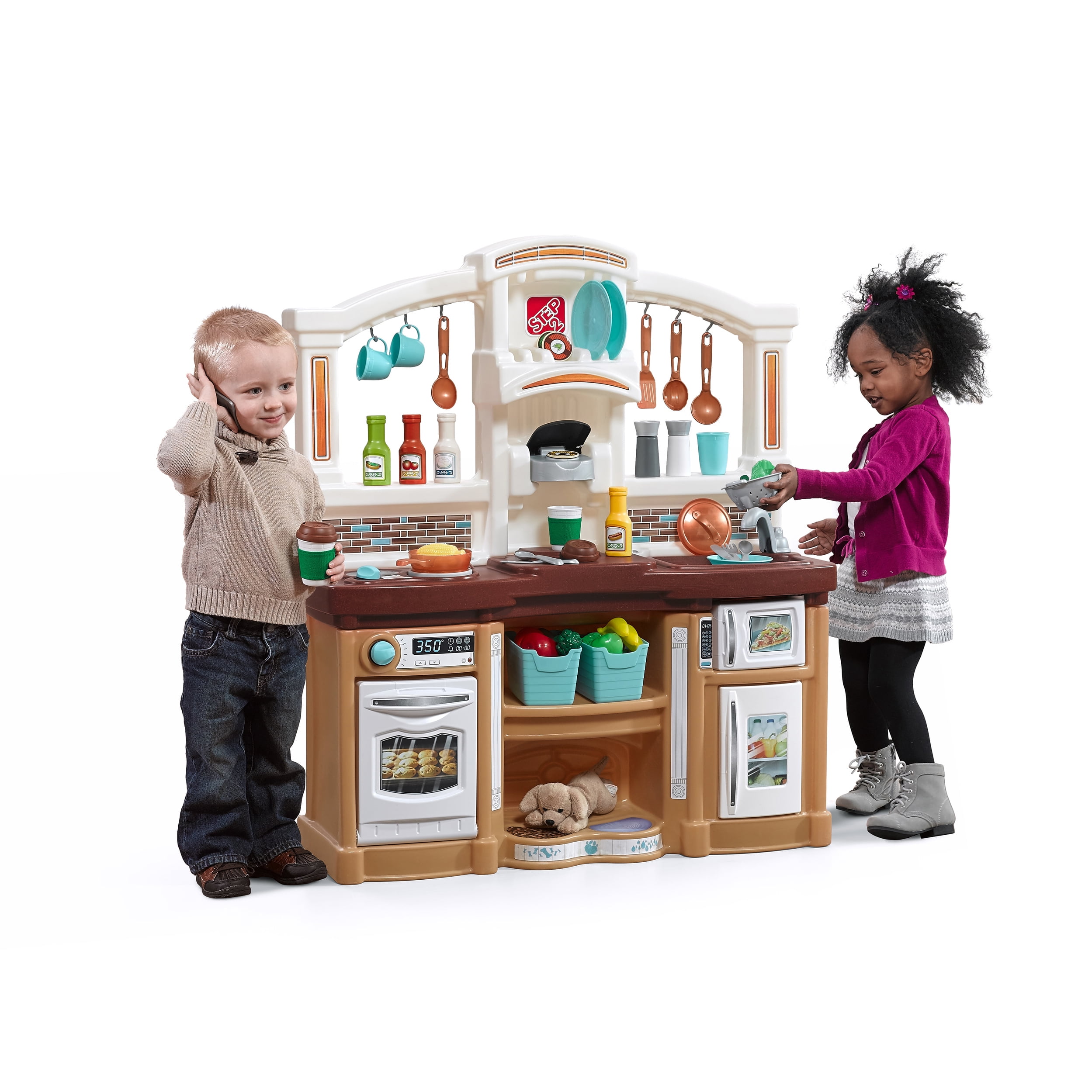 There’s no end to imaginary play with the Step2 Lifestyle Custom Kitchen™, where little chefs can play the day away with realistic kitchen amenities and other exciting features! Reach into the convenient refrigerator for fresh ingredients, and use the pretend water station for a refreshing drink. Activate the stovetop’s electronic lights and sounds with the special cookware to make bubbling and sizzling noises as each dish is prepared! The large countertop space has plenty of room to accommodate multiple kids as they prep meals together, and they can use the microwave with realistic keypad feature to “reheat” leftovers and the molded-in sink for clean-up at the end of each mealtime. A bonus for kids and parents alike, this pretend kitchen playset also incudes lots of storage space, from the dish rack to pull-out cabinet and recycling bin.