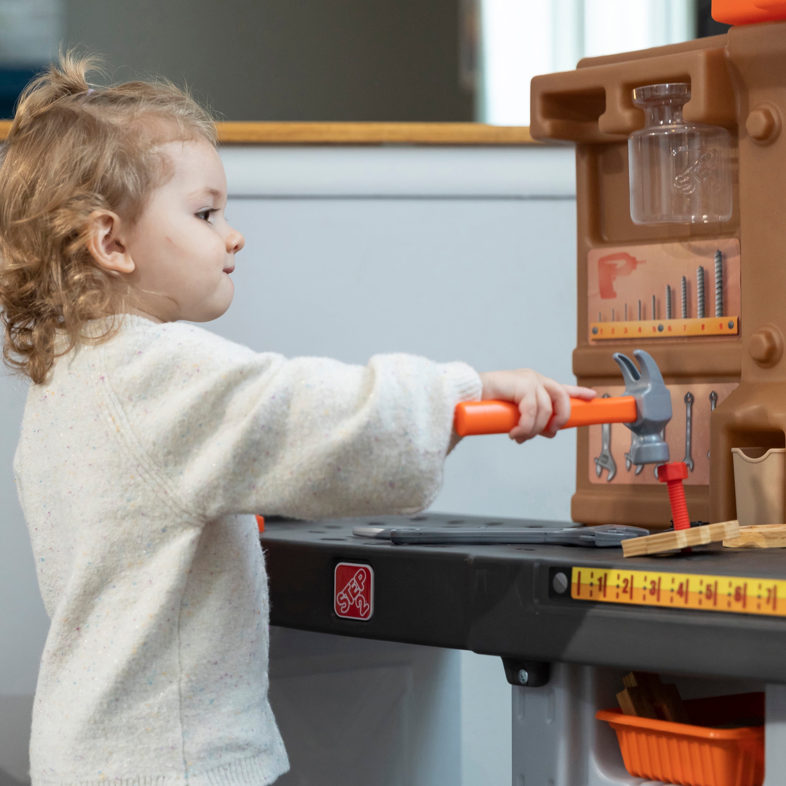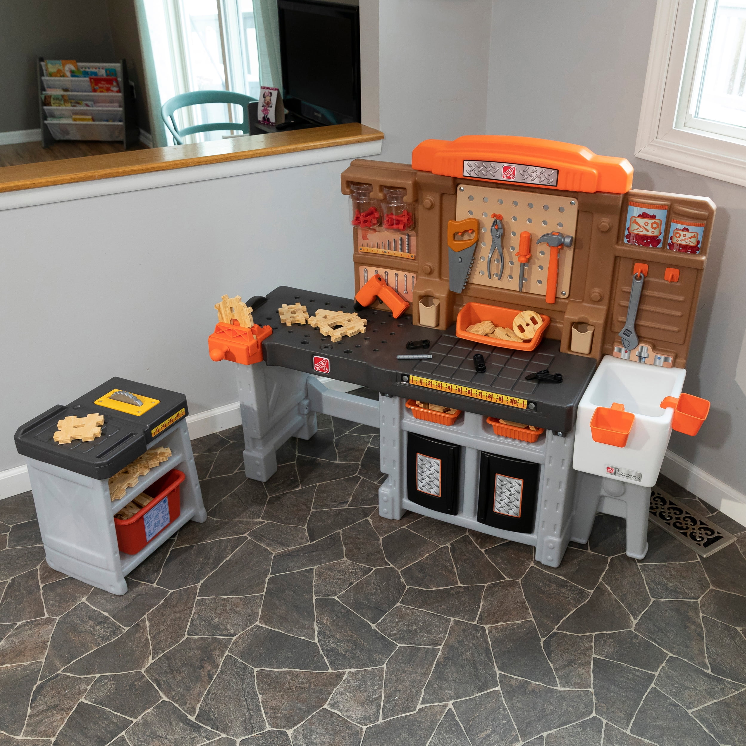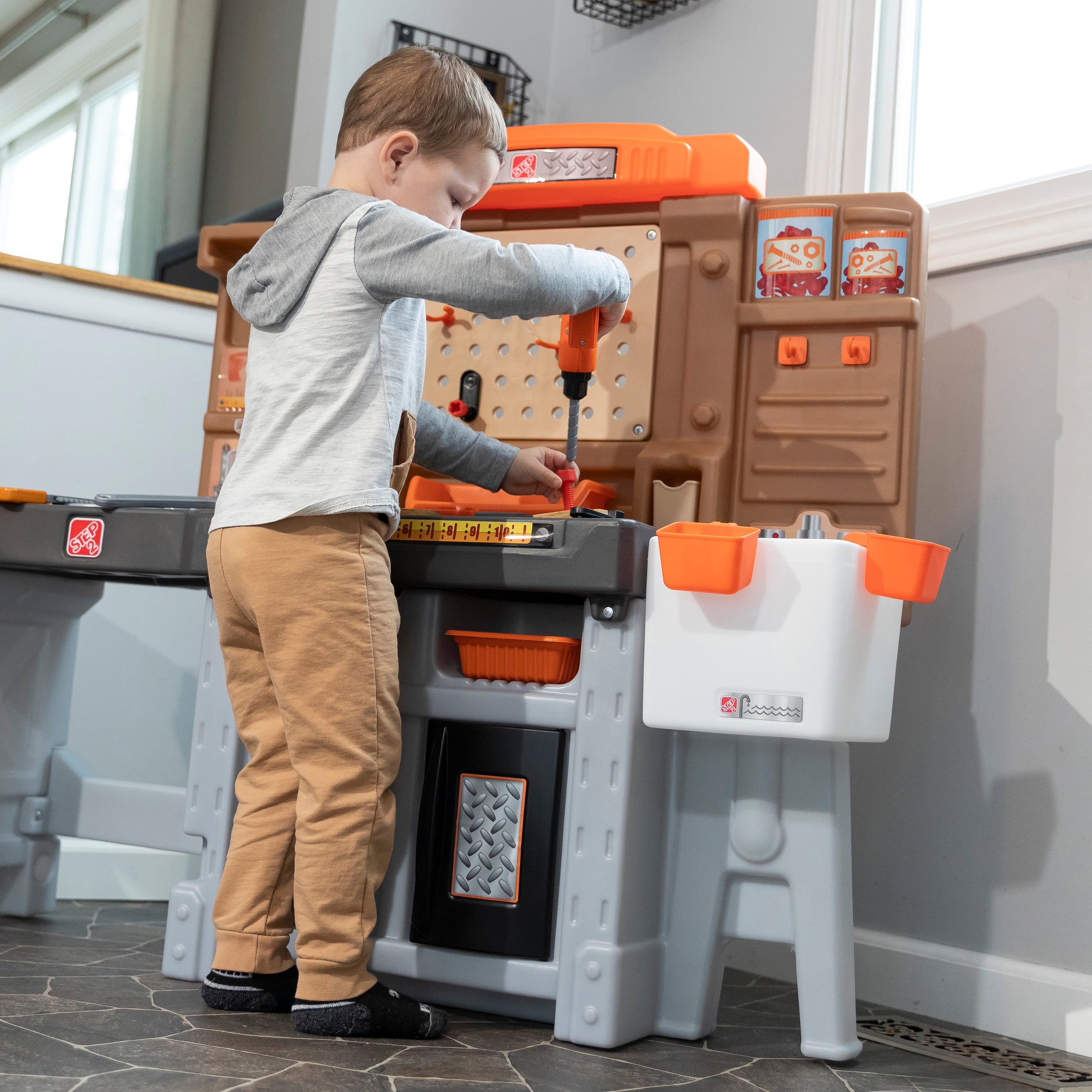 The Step2 Pro Play Workshop and Utility Bench kid’s indoor and outdoor playset is a little builder’s dream! If you are looking for a construction workshop or sturdy workbench for kids aged 3 and up for a boy (or girl) this playset is a must have! With such a large workbench space, pull-out utility bench, and tons of included accessories, multiple kids can explore woodworking together for fun social play. Kids can use the real working spring-action vise to hold the Durafoam™ pieces that look just like real wood as they build their creations! Your little one will always have the right tool for any job with the included battery-operated pretend power drill (requires 2 “AA” batteries, not included) and hammer, hand saw, table are just a few of the accessories included in this 75-piece accessory playset. Pretend play comes to life through fun building projects that flex little builders’ creativity and fine motor skills. And, this workbench playset includes realistic storage space like the pegboard, jars, and bins, just like real workshops! The Pro Play Workshop and Utility Bench made by Step2 will last for a long time, is made with sturdy plastics and even comes with a limited warranty. Adult Assembly Required!