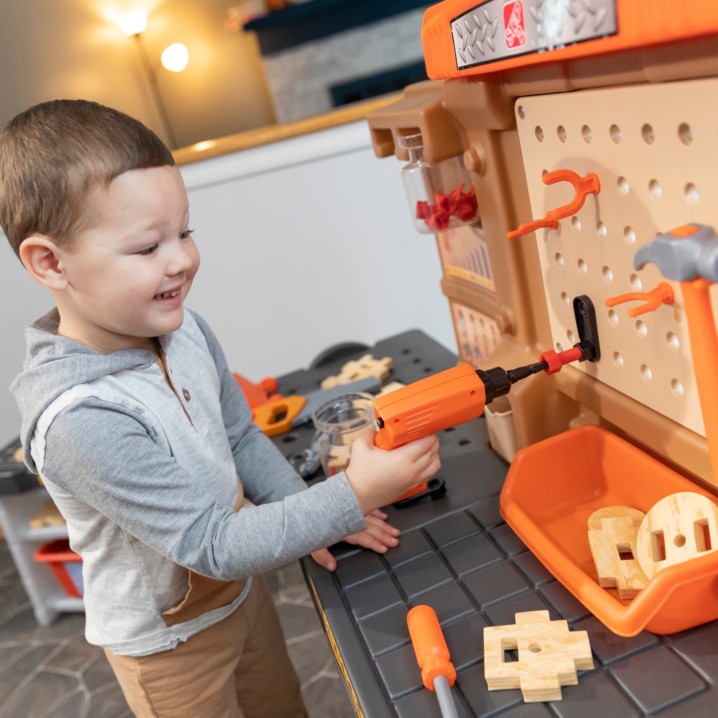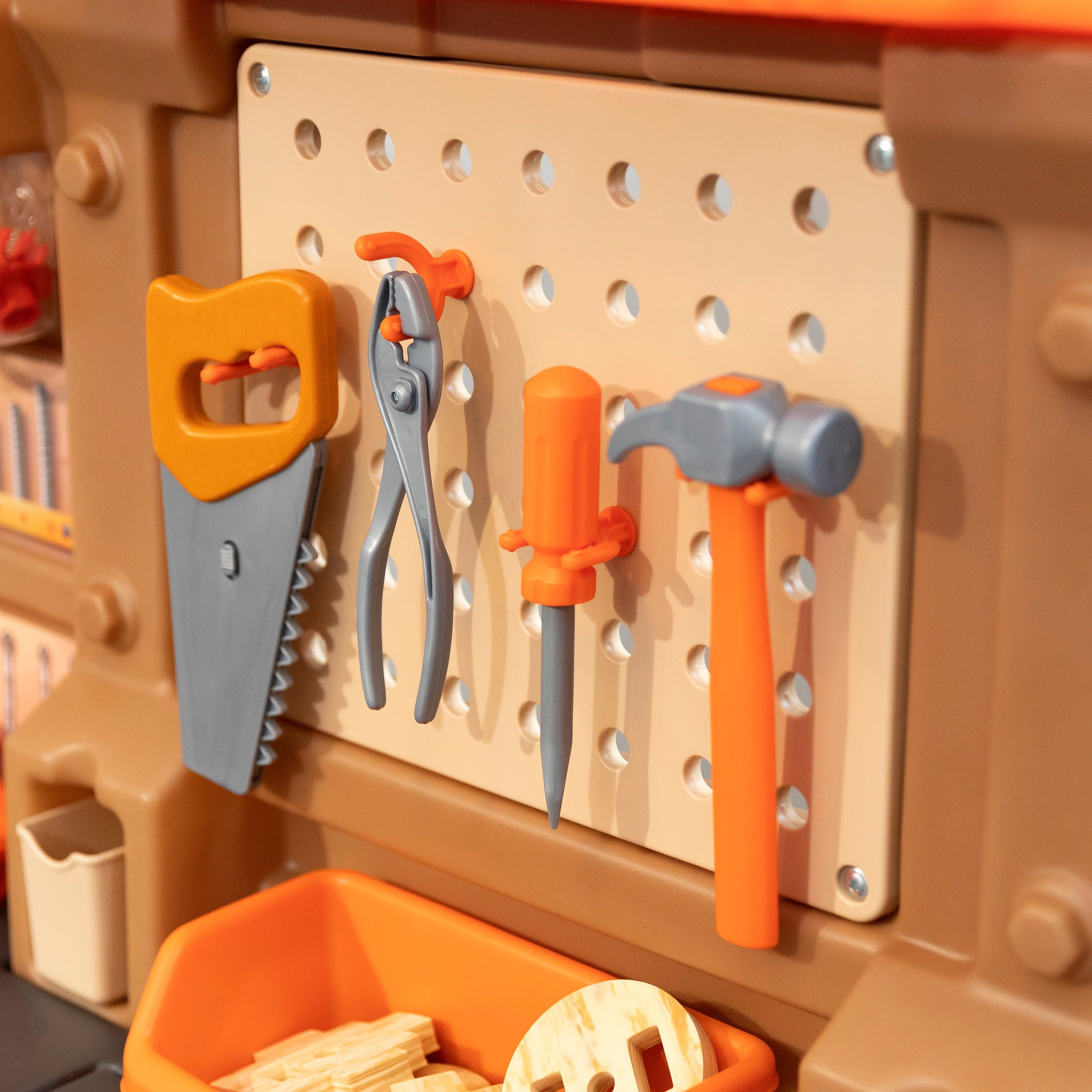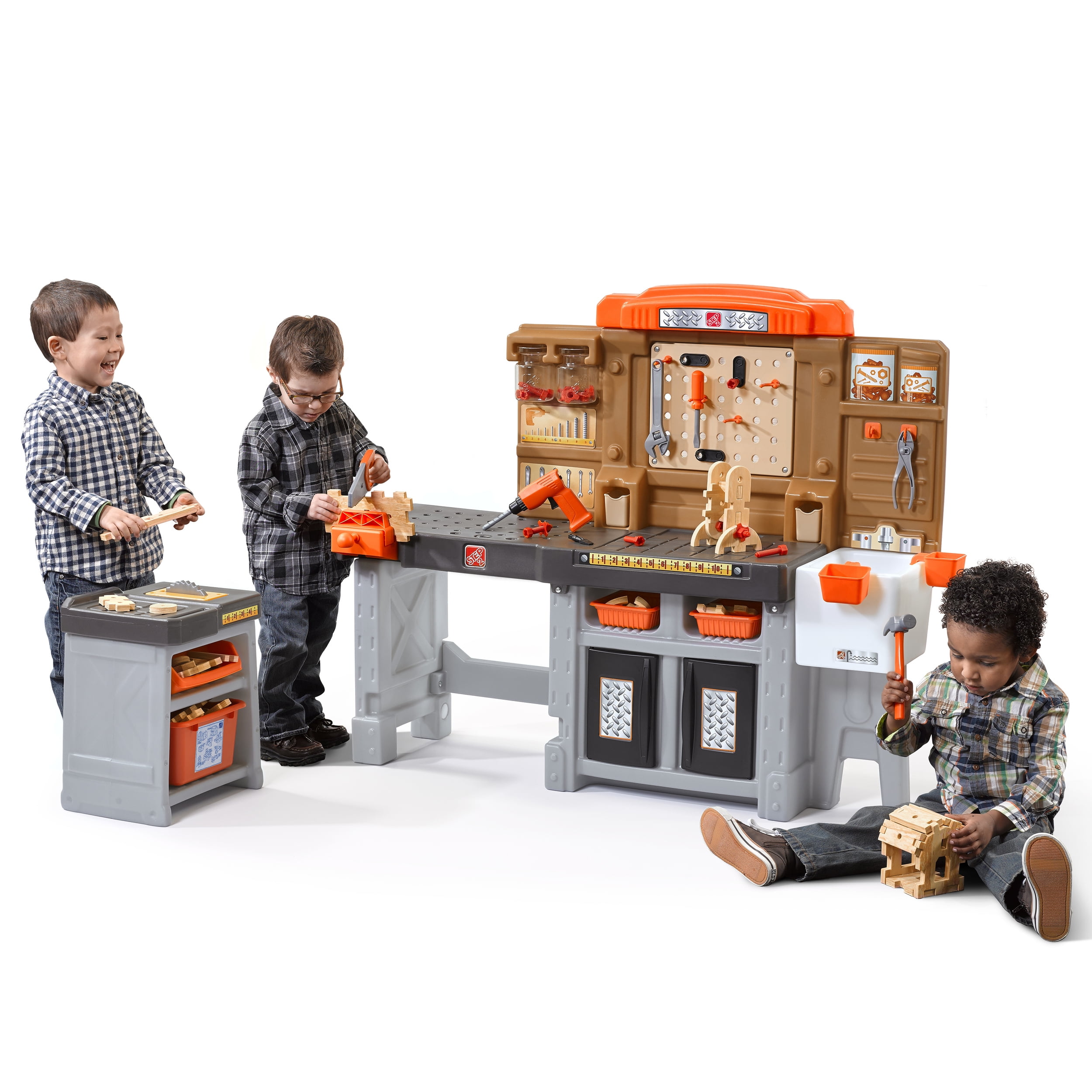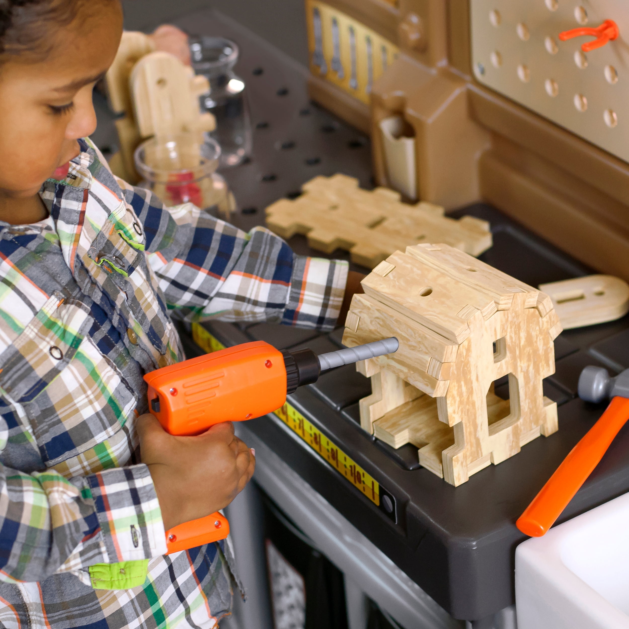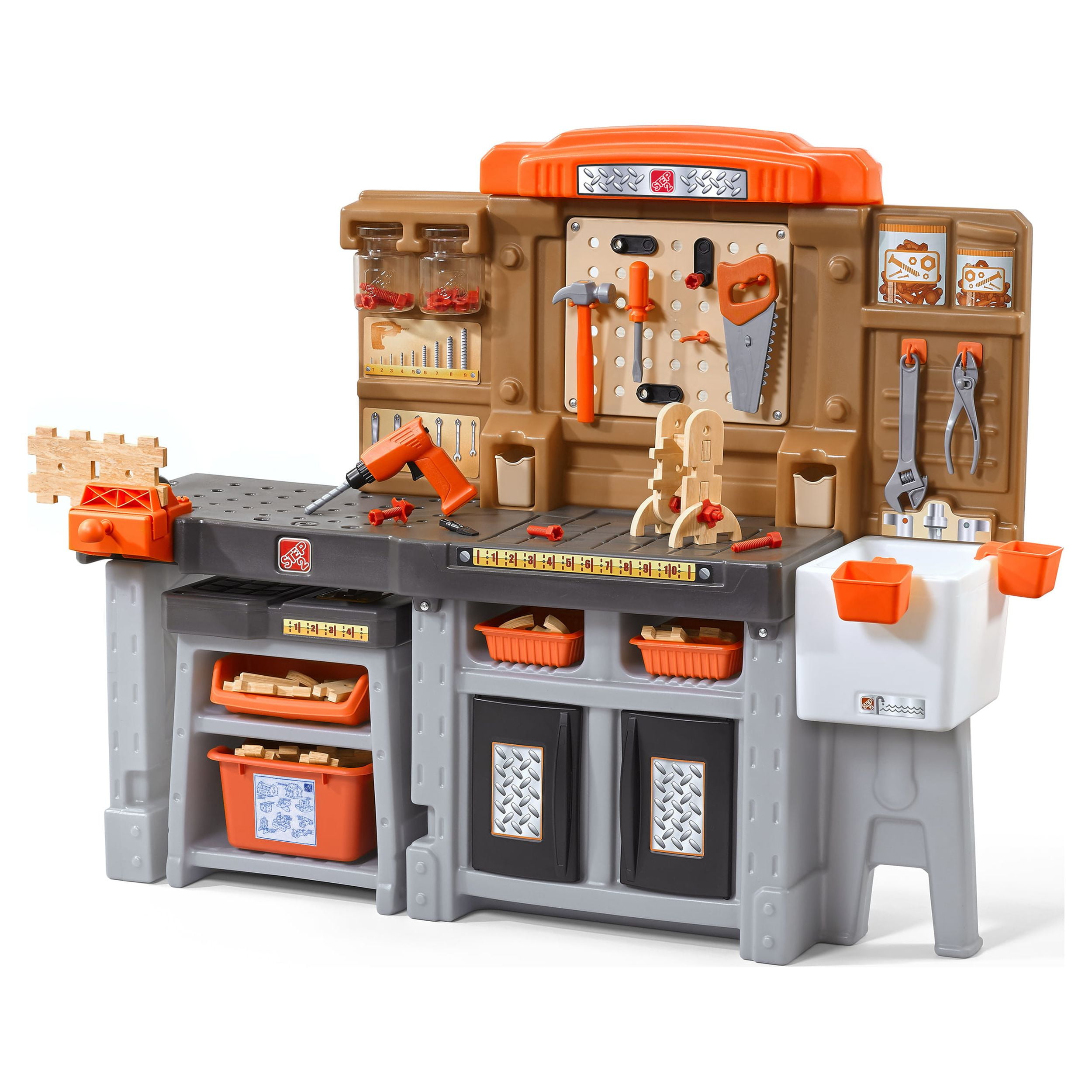Pull-out utility bench creates even more workshop space for little builders to play together. Realistic power drill help little ones “drill” the perfect hole every time (tools require 4 “AA” batteries, not included). Clean up after playtime with the molded-in utility sink, and keep the pretend workbench set looking tidy by storing accessories in the storage jars, cabinets and bins, and hanging tools on the pegboard. Molded-in drill and nail holes on the workbench tabletop help kids practice hand-eye coordination as they build. Use the working vise to hold the faux wood pieces steady as little ones work. Workshop playset includes Durafoam™ pieces for kids to build their own creations. Adult assembly required. Easy to clean! Use disinfectant wipes or household cleaners whenever you want! In the box: Workbench playset with 75-piece accessory set that includes faux wood pieces, storage bins and jars, and pretend toolkit.
