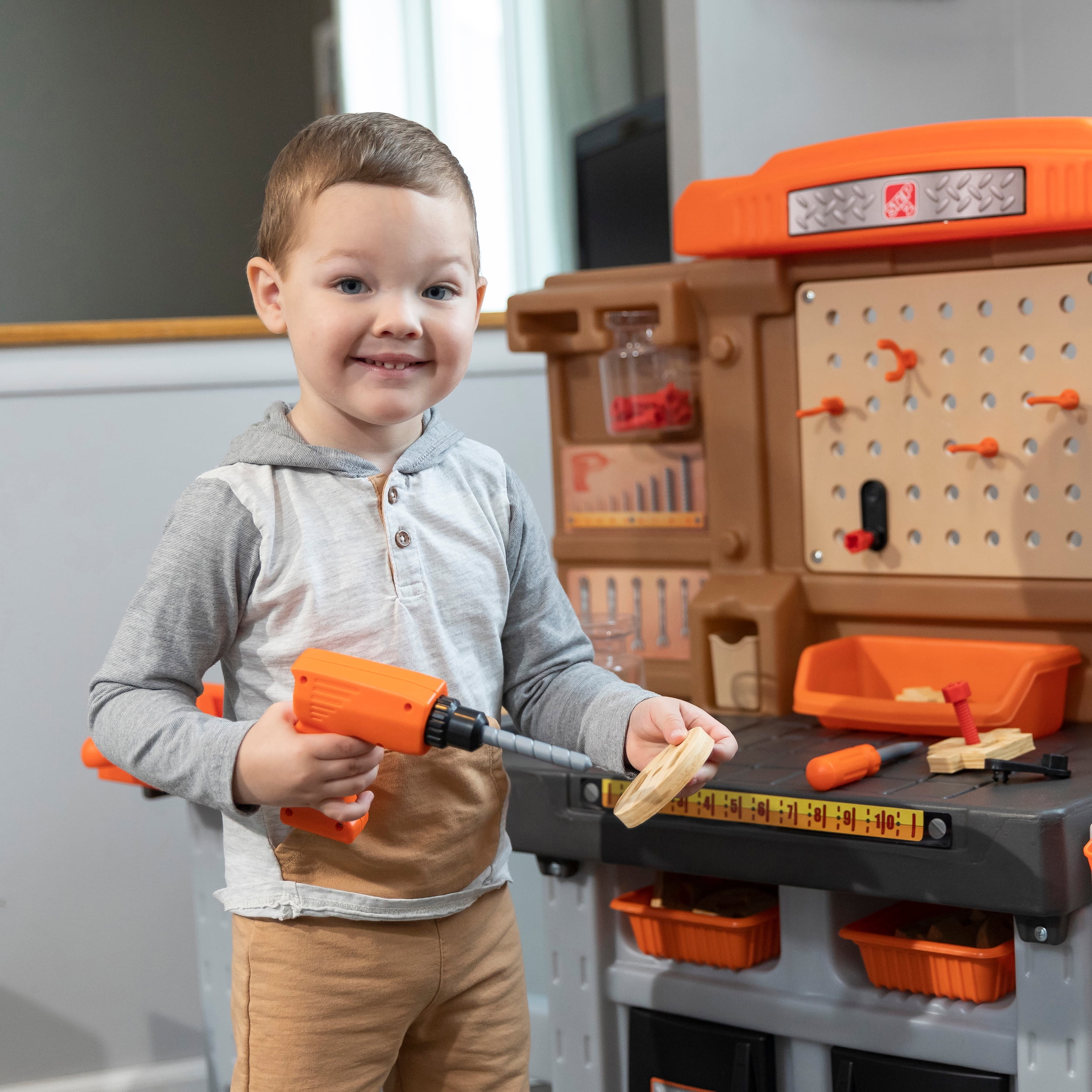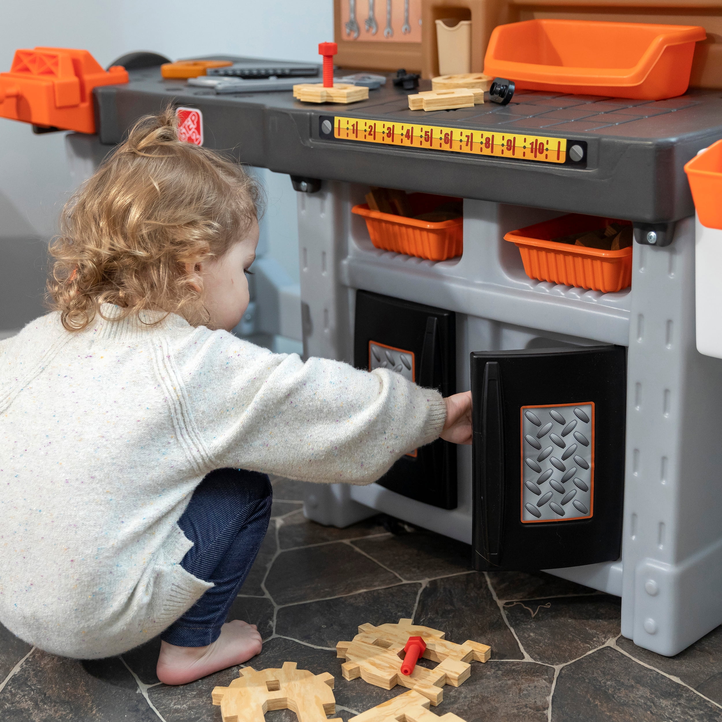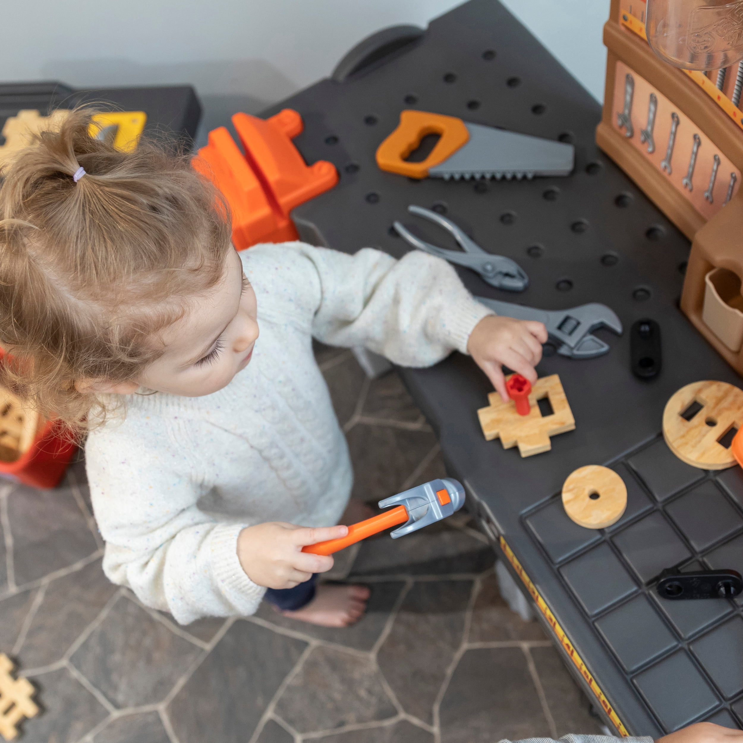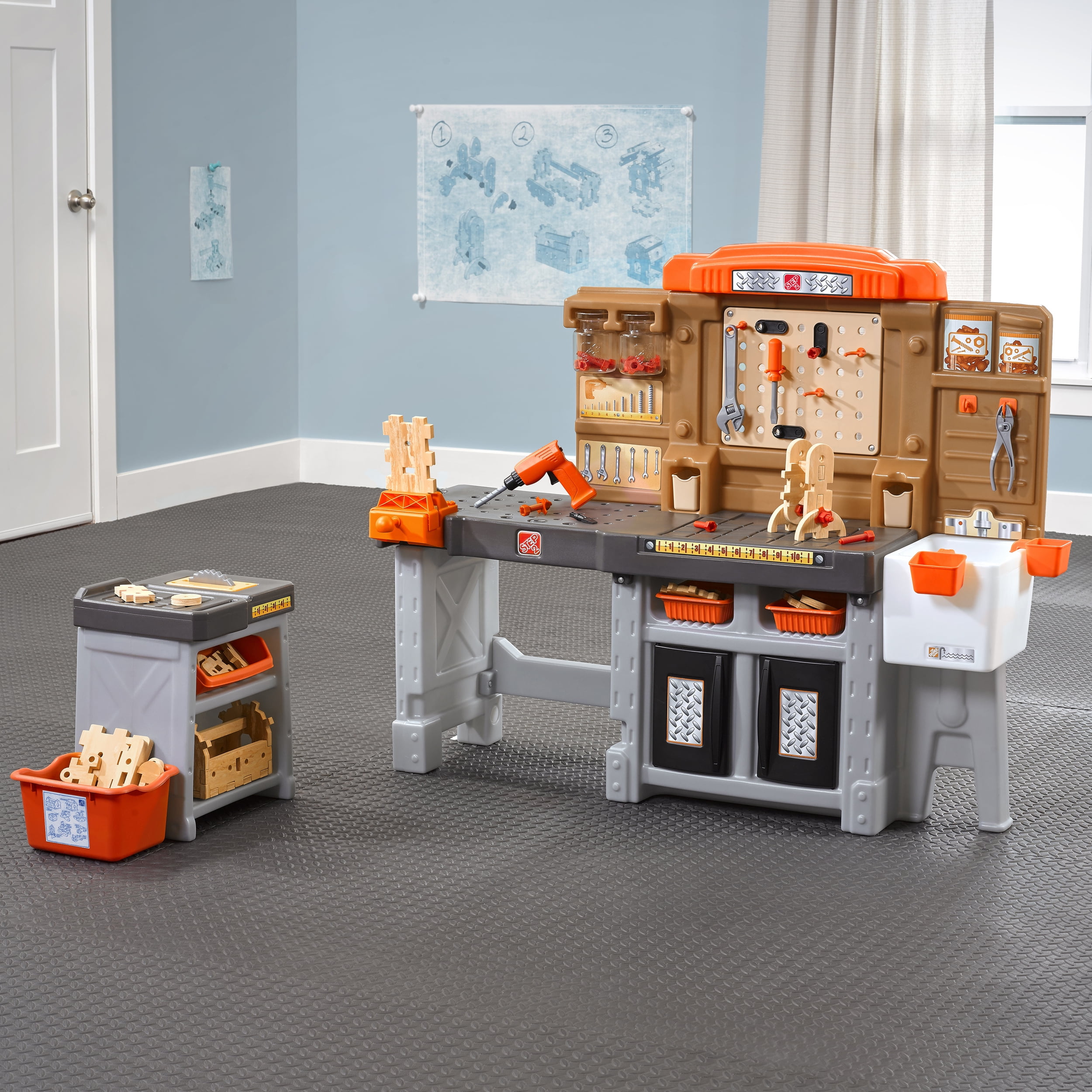 Pull-out utility bench creates even more workshop space for little builders to play together. Realistic power drill help little ones “drill” the perfect hole every time (tools require 4 “AA” batteries, not included). Clean up after playtime with the molded-in utility sink, and keep the pretend workbench set looking tidy by storing accessories in the storage jars, cabinets and bins, and hanging tools on the pegboard. Molded-in drill and nail holes on the workbench tabletop help kids practice hand-eye coordination as they build. Use the working vise to hold the faux wood pieces steady as little ones work. Workshop playset includes Durafoam™ pieces for kids to build their own creations. Adult assembly required. Easy to clean! Use disinfectant wipes or household cleaners whenever you want! In the box: Workbench playset with 75-piece accessory set that includes faux wood pieces, storage bins and jars, and pretend toolkit.