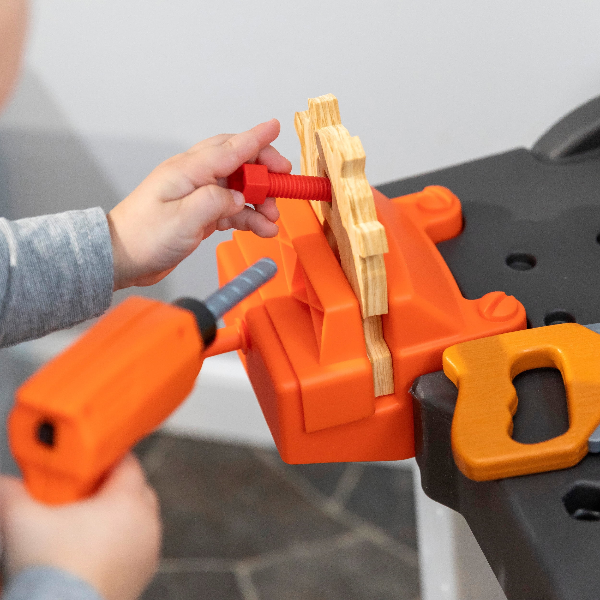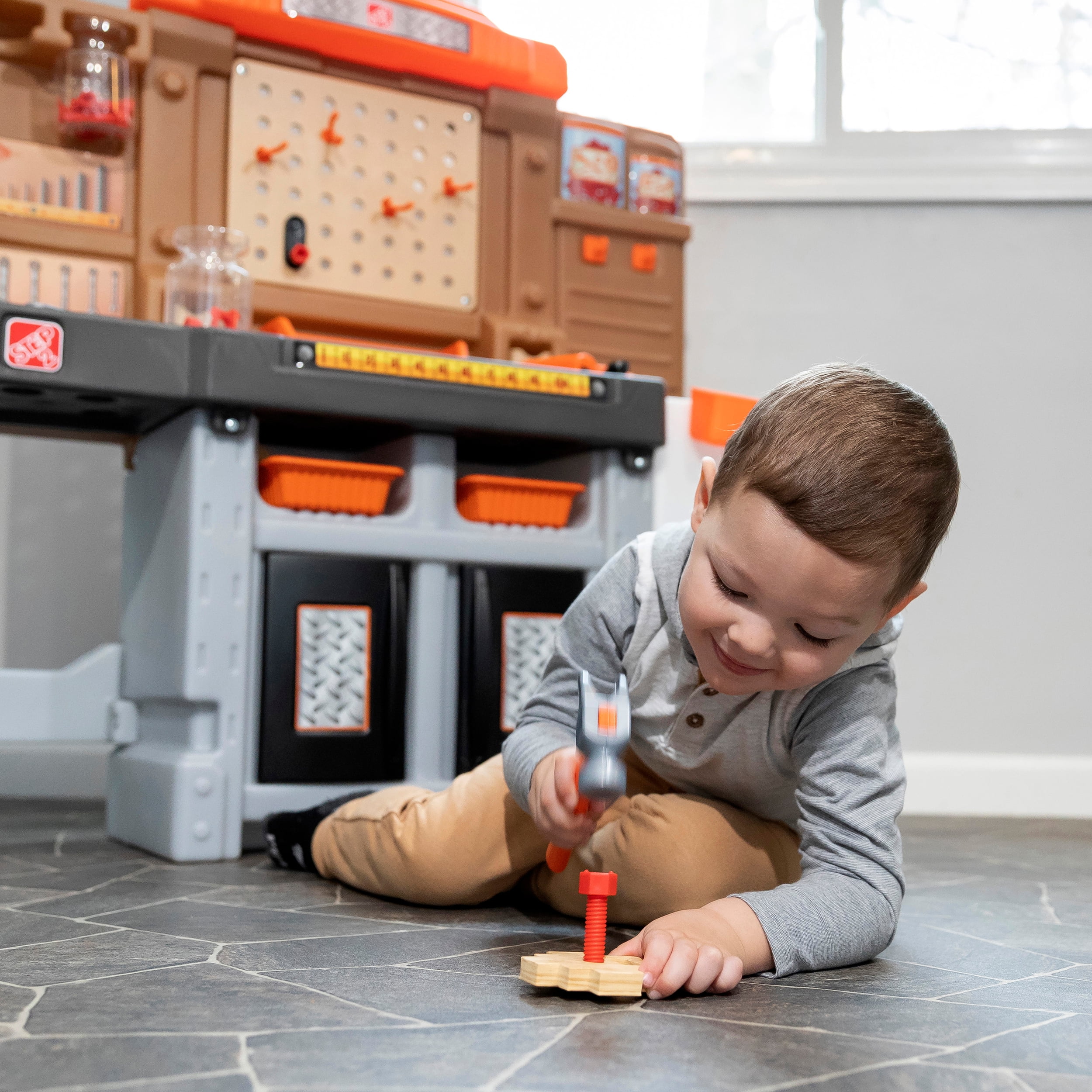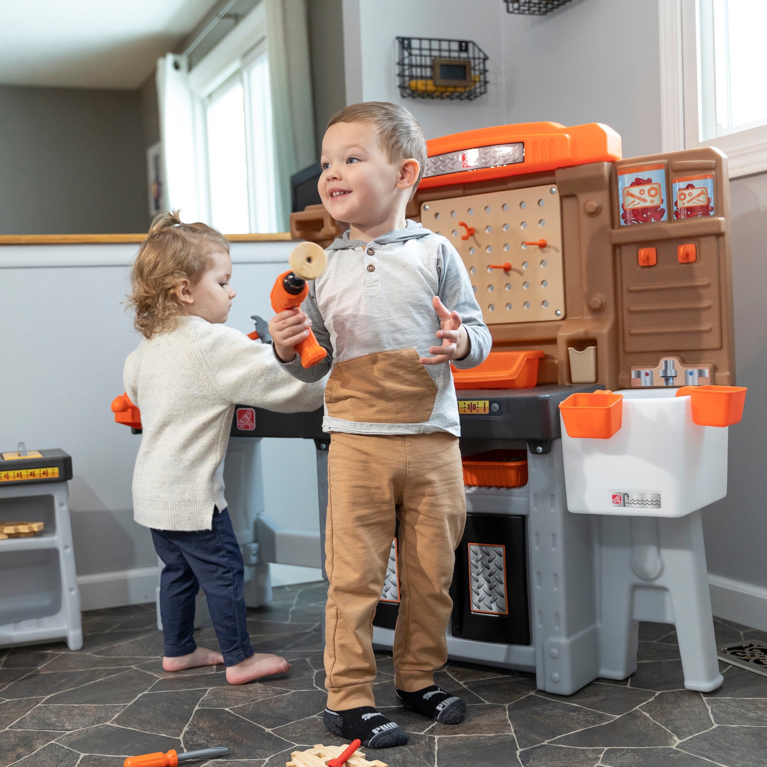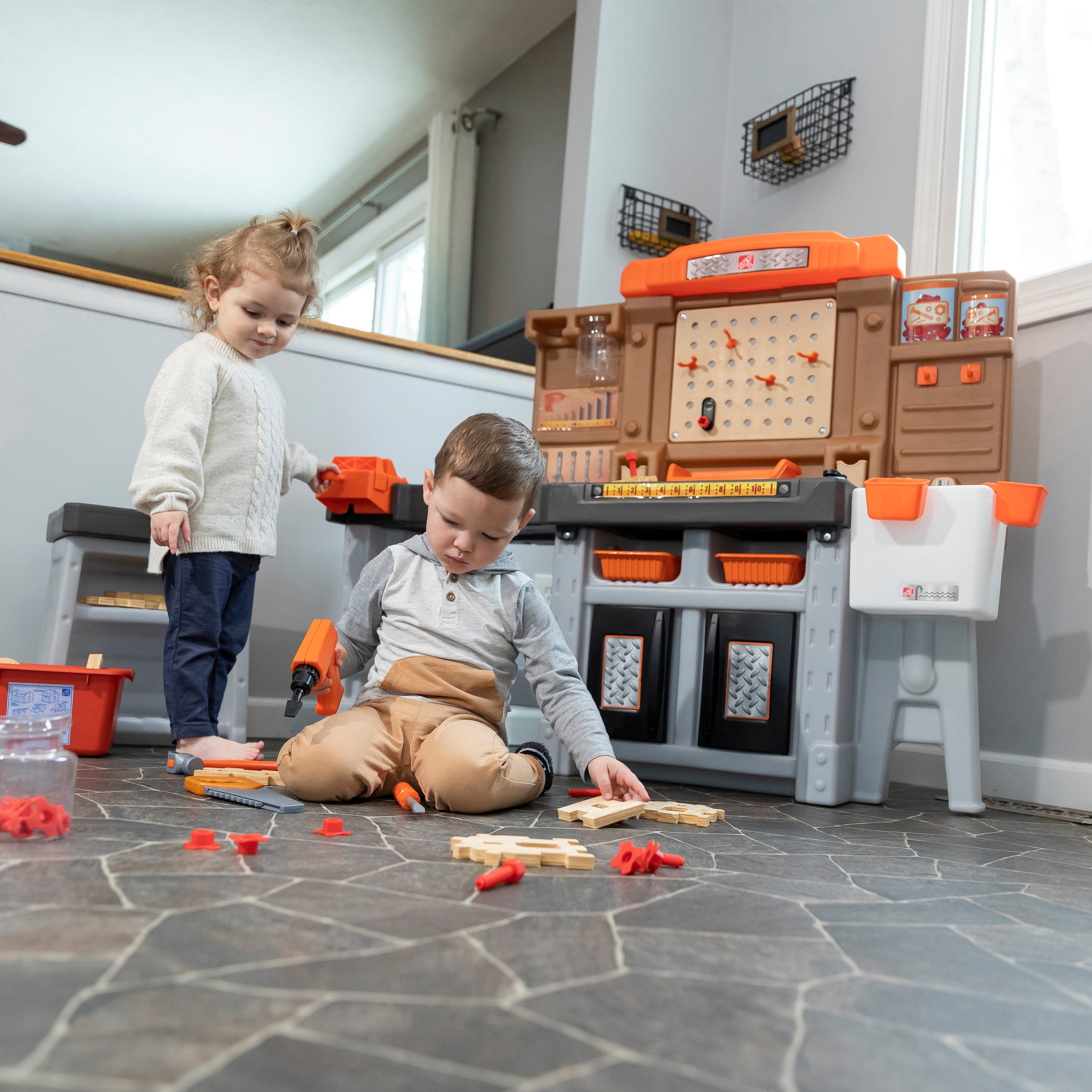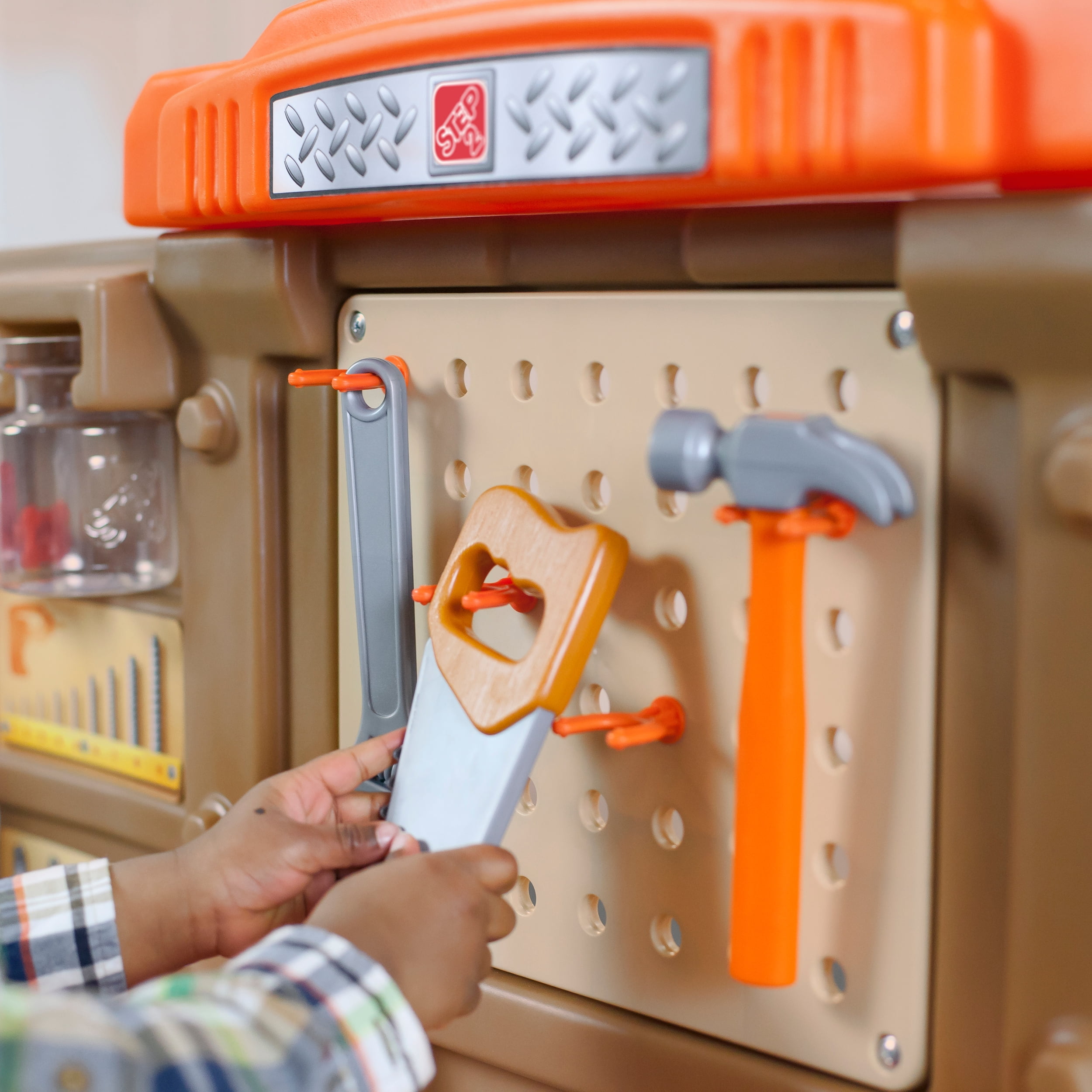 Pull-out utility bench creates even more workshop space for little builders to play together. Realistic power drill help little ones “drill” the perfect hole every time (tools require 4 “AA” batteries, not included). Clean up after playtime with the molded-in utility sink, and keep the pretend workbench set looking tidy by storing accessories in the storage jars, cabinets and bins, and hanging tools on the pegboard. Molded-in drill and nail holes on the workbench tabletop help kids practice hand-eye coordination as they build. Use the working vise to hold the faux wood pieces steady as little ones work. Workshop playset includes Durafoam™ pieces for kids to build their own creations. Adult assembly required. Easy to clean! Use disinfectant wipes or household cleaners whenever you want! In the box: Workbench playset with 75-piece accessory set that includes faux wood pieces, storage bins and jars, and pretend toolkit.