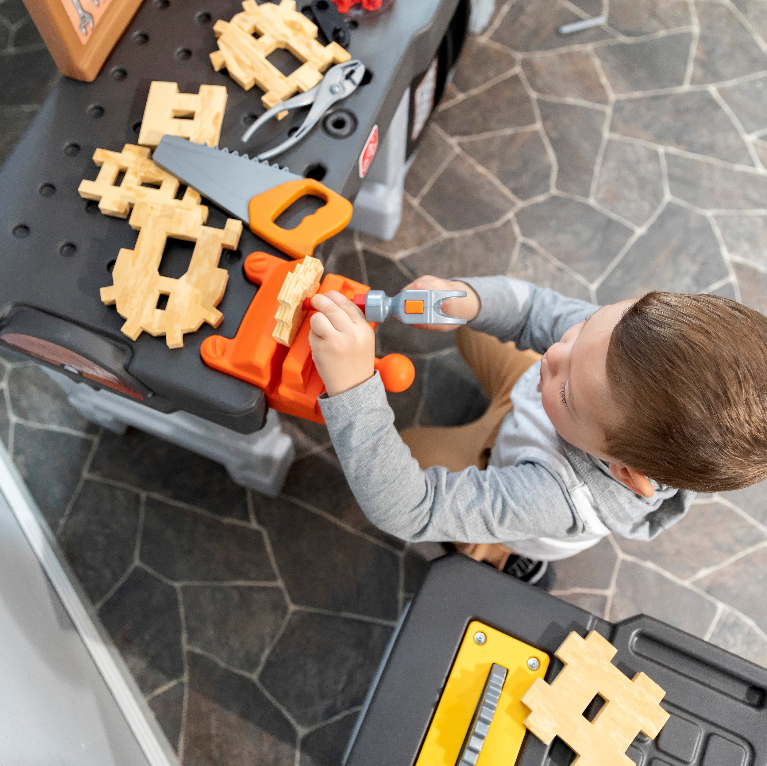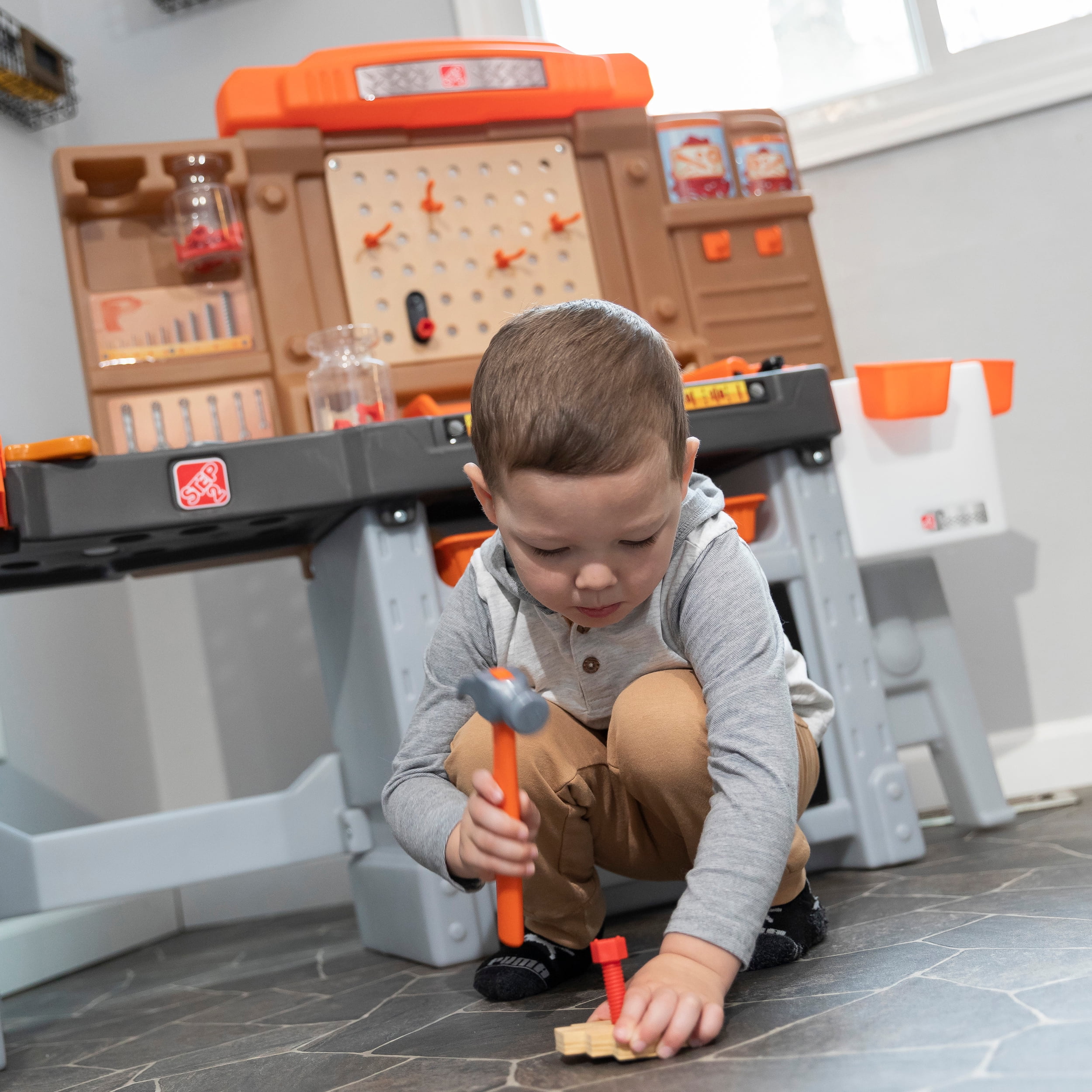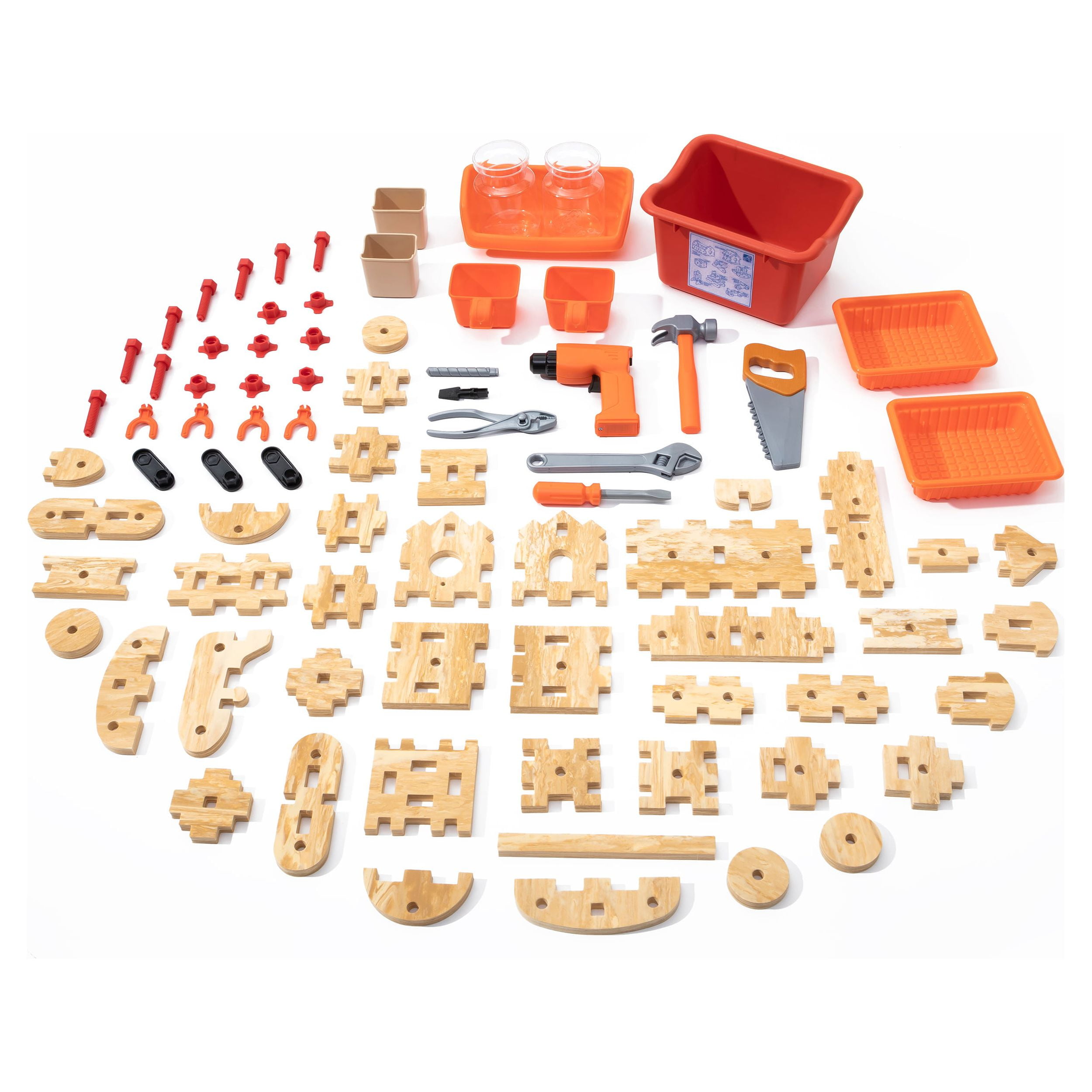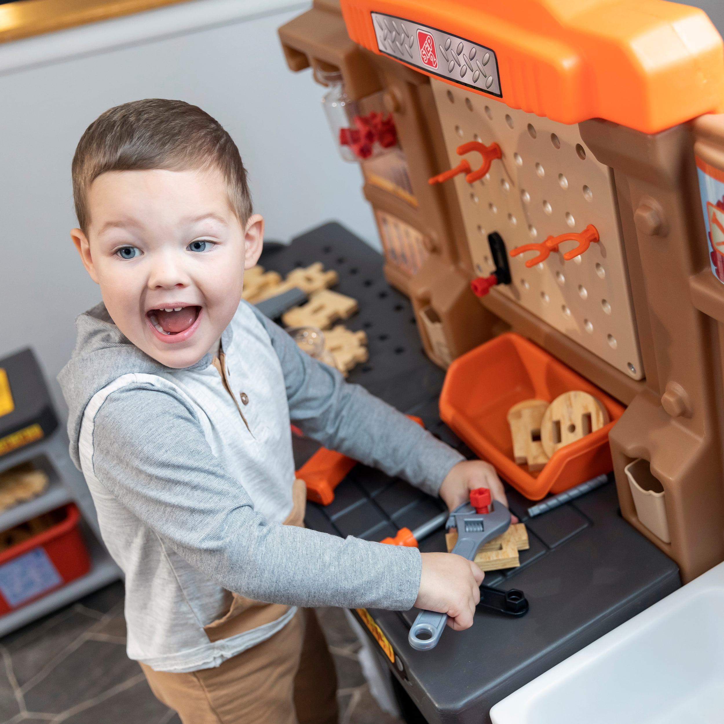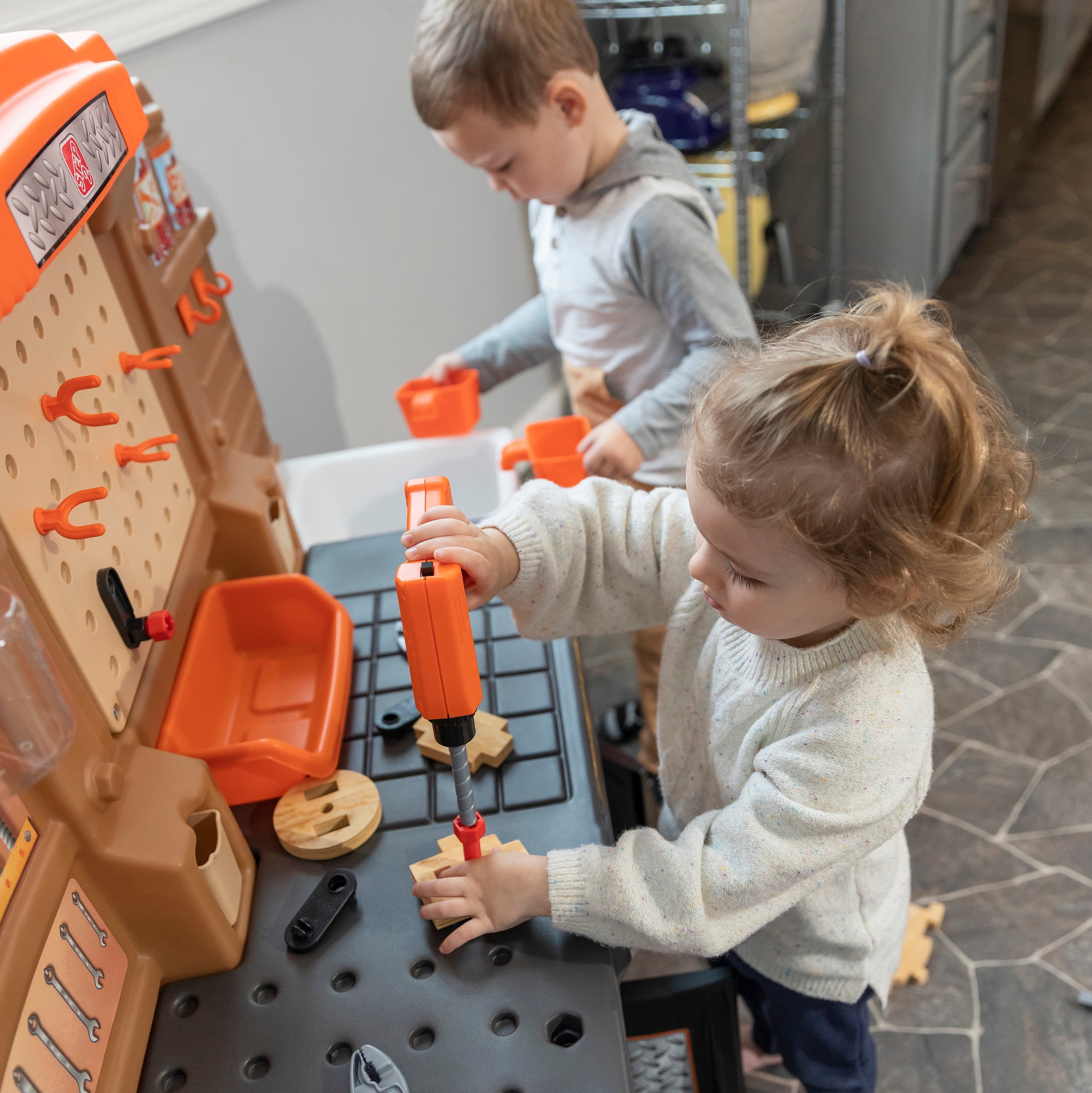 Pull-out utility bench creates even more workshop space for little builders to play together. Realistic power drill help little ones “drill” the perfect hole every time (tools require 4 “AA” batteries, not included). Clean up after playtime with the molded-in utility sink, and keep the pretend workbench set looking tidy by storing accessories in the storage jars, cabinets and bins, and hanging tools on the pegboard. Molded-in drill and nail holes on the workbench tabletop help kids practice hand-eye coordination as they build. Use the working vise to hold the faux wood pieces steady as little ones work. Workshop playset includes Durafoam™ pieces for kids to build their own creations. Adult assembly required. Easy to clean! Use disinfectant wipes or household cleaners whenever you want! In the box: Workbench playset with 75-piece accessory set that includes faux wood pieces, storage bins and jars, and pretend toolkit.