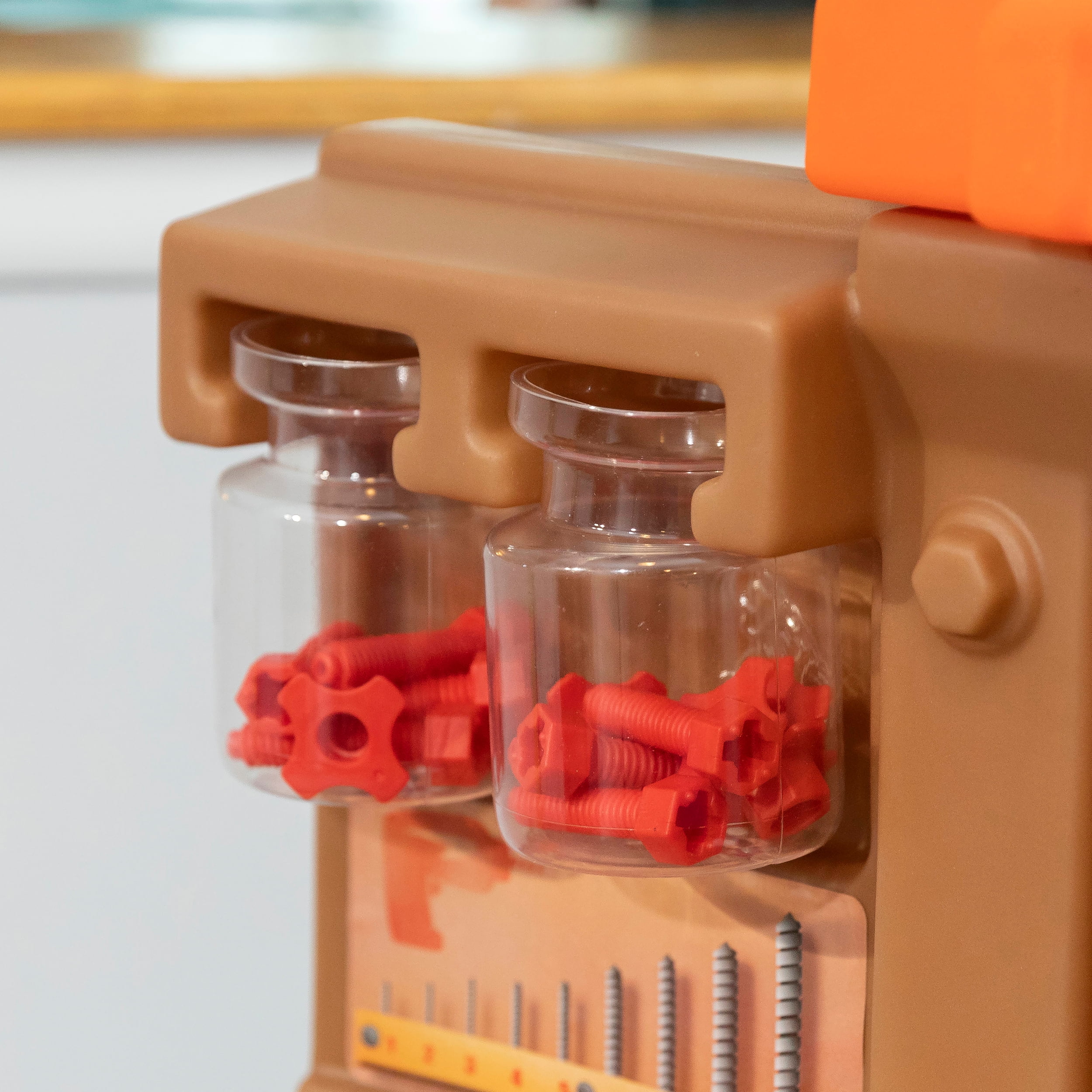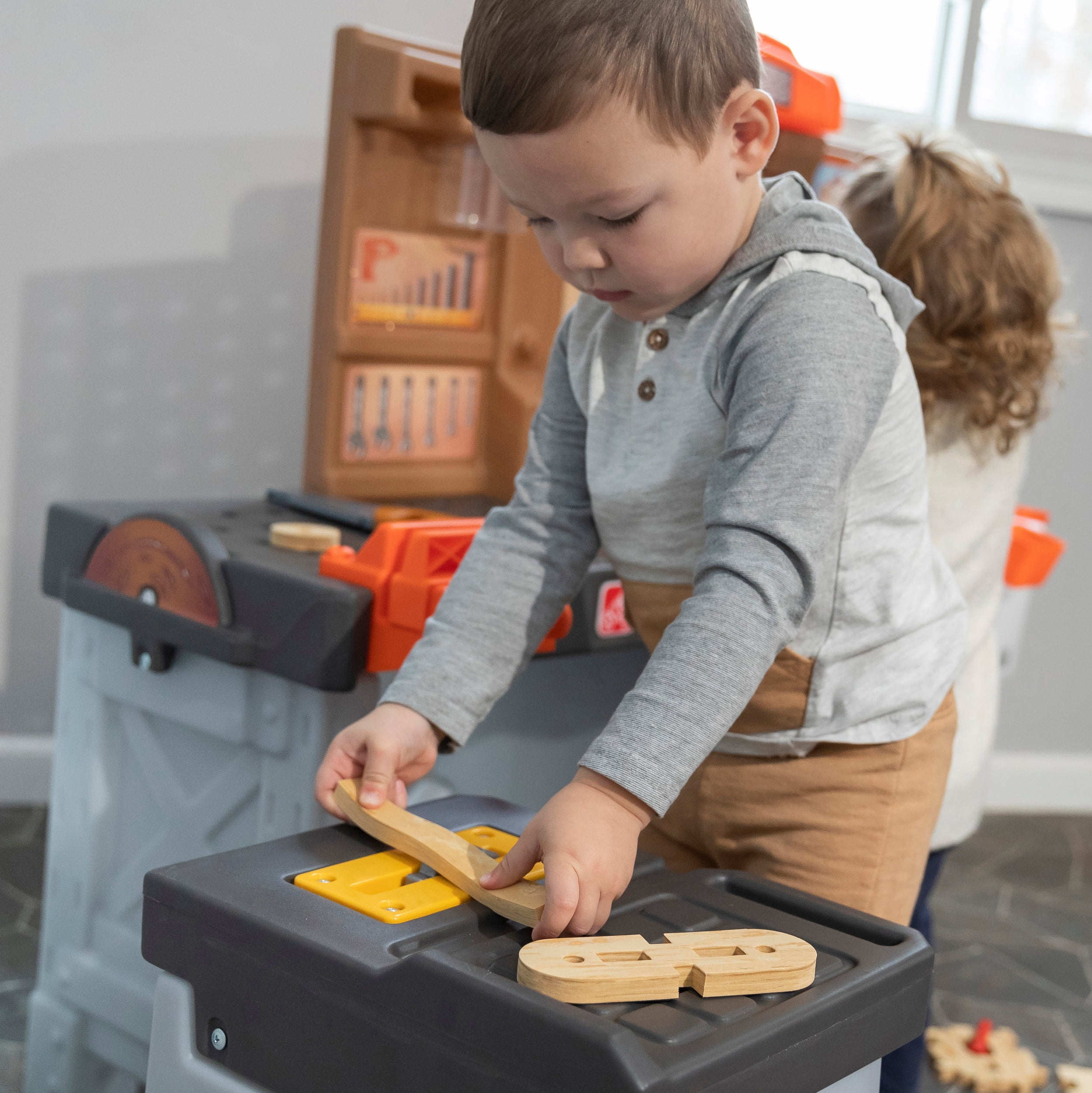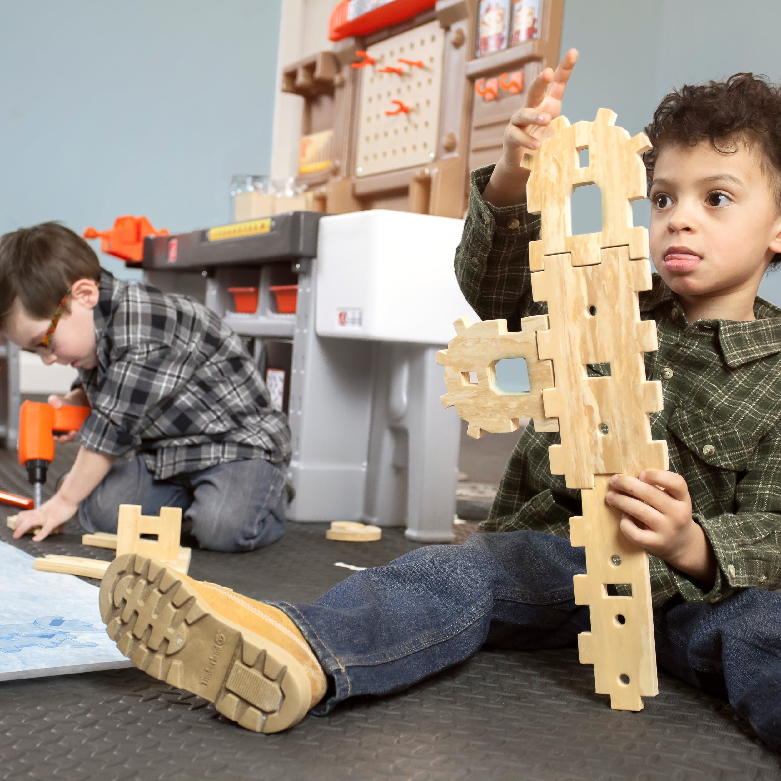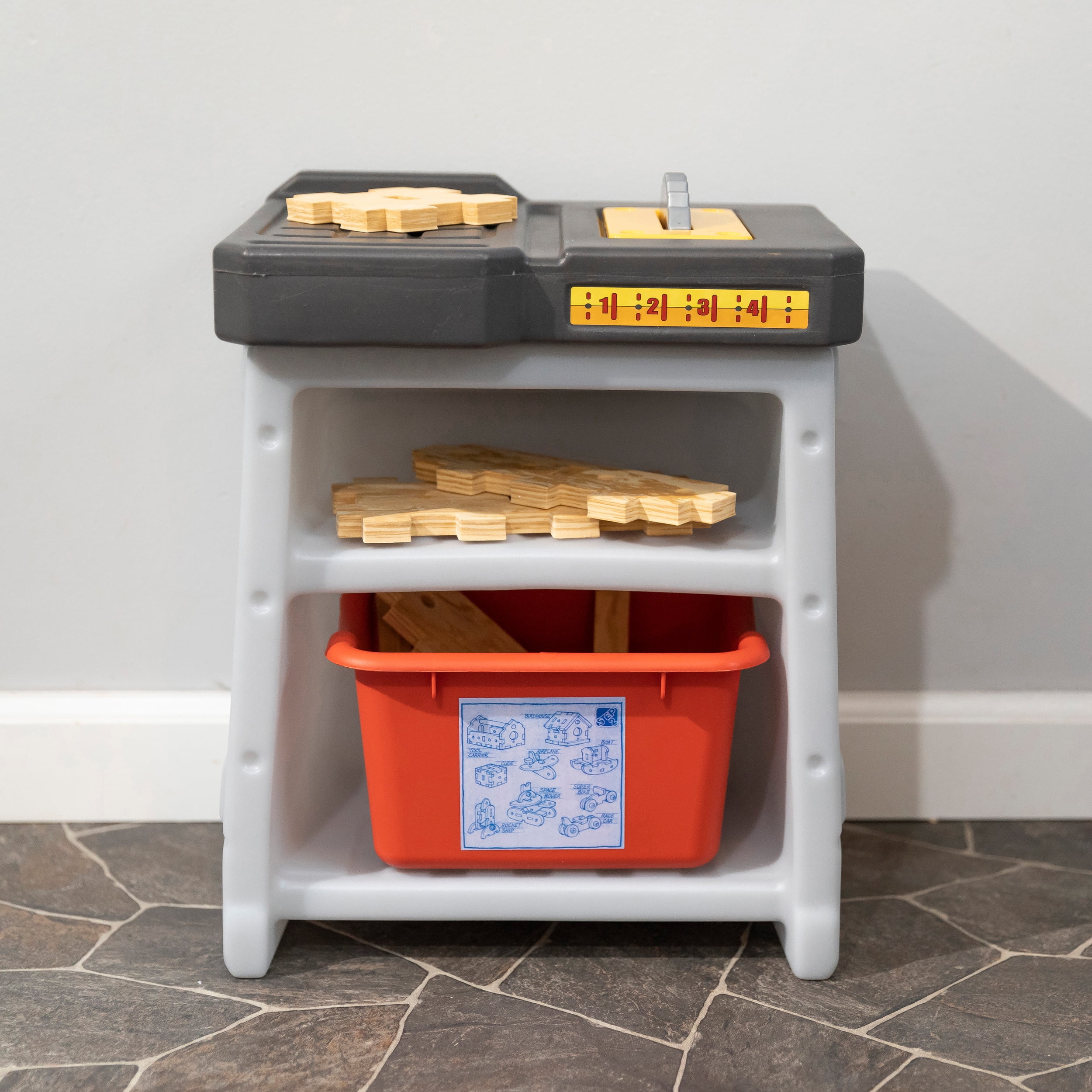 Pull-out utility bench creates even more workshop space for little builders to play together. Realistic power drill help little ones “drill” the perfect hole every time (tools require 4 “AA” batteries, not included). Clean up after playtime with the molded-in utility sink, and keep the pretend workbench set looking tidy by storing accessories in the storage jars, cabinets and bins, and hanging tools on the pegboard. Molded-in drill and nail holes on the workbench tabletop help kids practice hand-eye coordination as they build. Use the working vise to hold the faux wood pieces steady as little ones work. Workshop playset includes Durafoam™ pieces for kids to build their own creations. Adult assembly required. Easy to clean! Use disinfectant wipes or household cleaners whenever you want! In the box: Workbench playset with 75-piece accessory set that includes faux wood pieces, storage bins and jars, and pretend toolkit.
