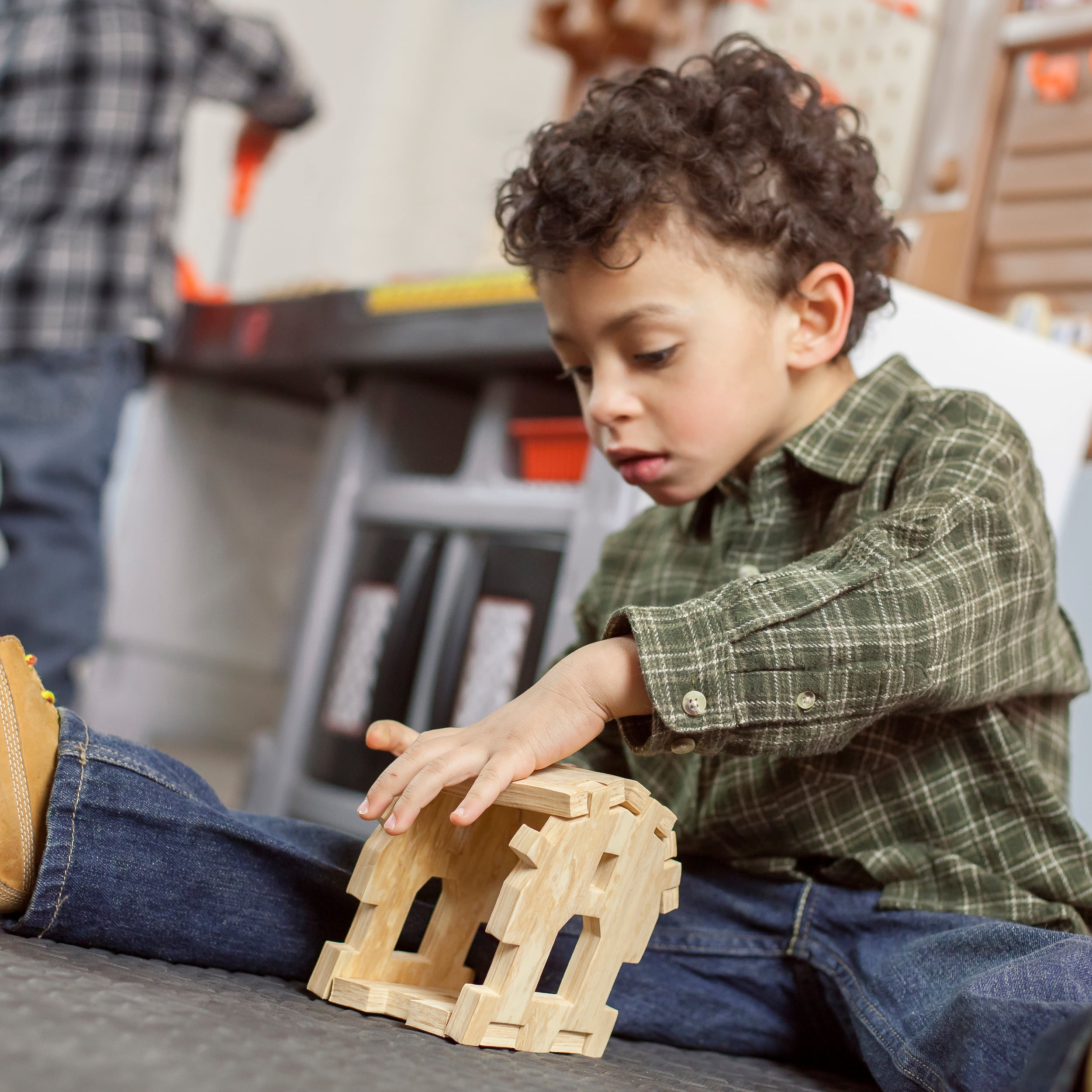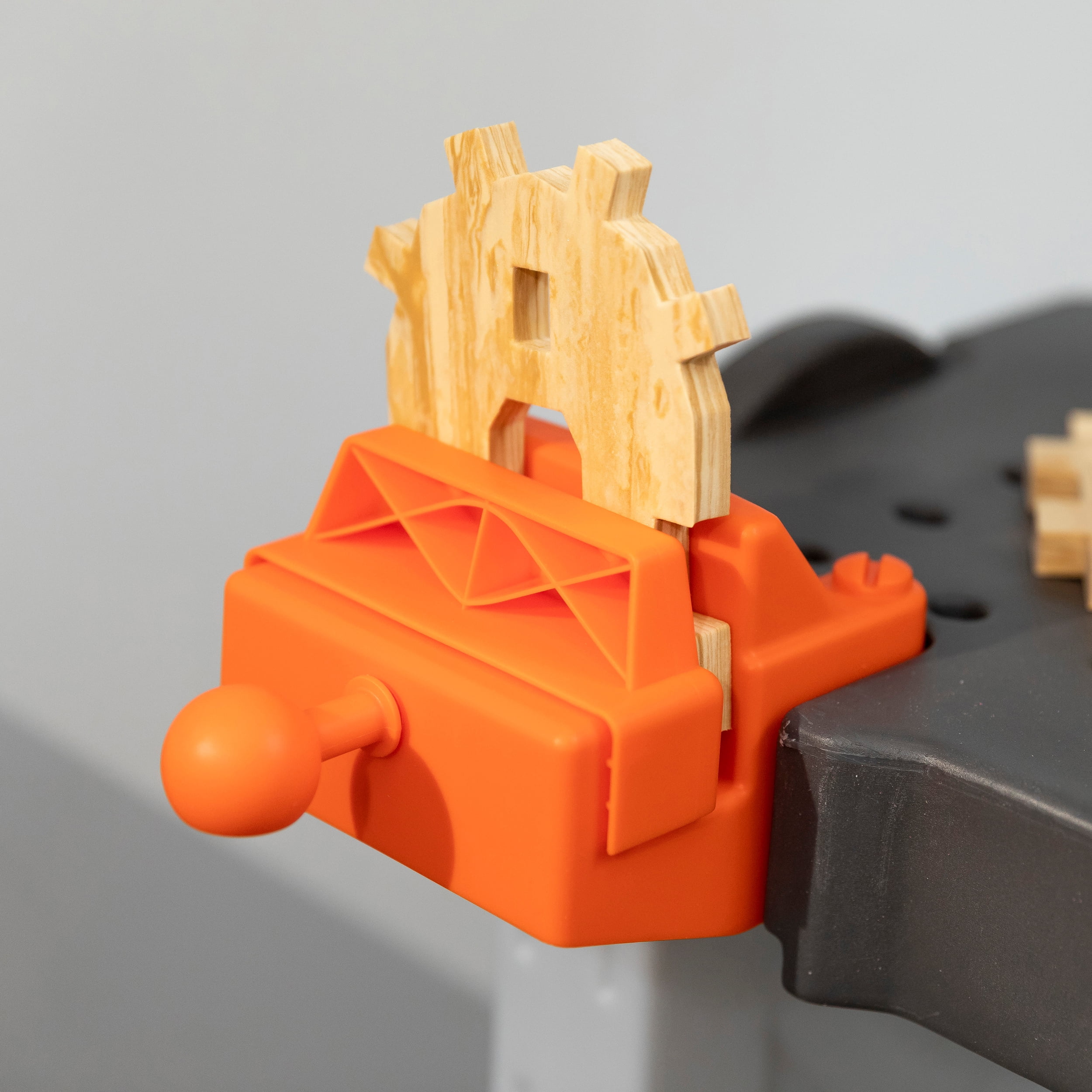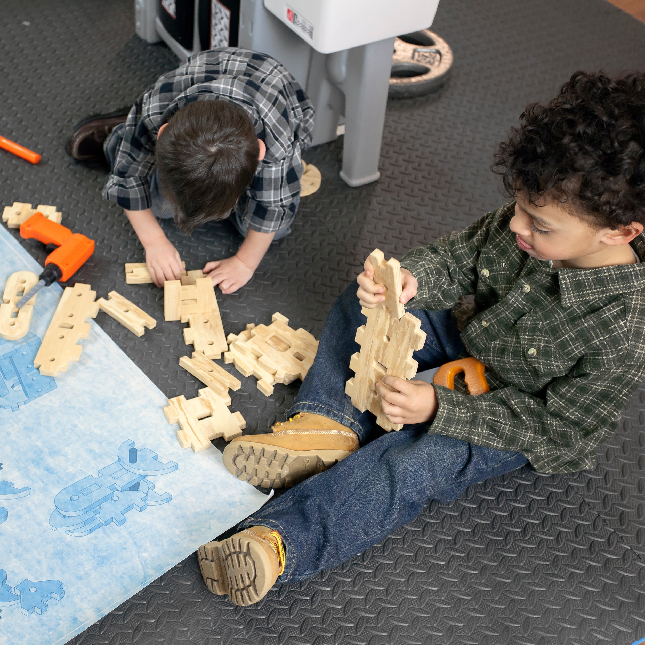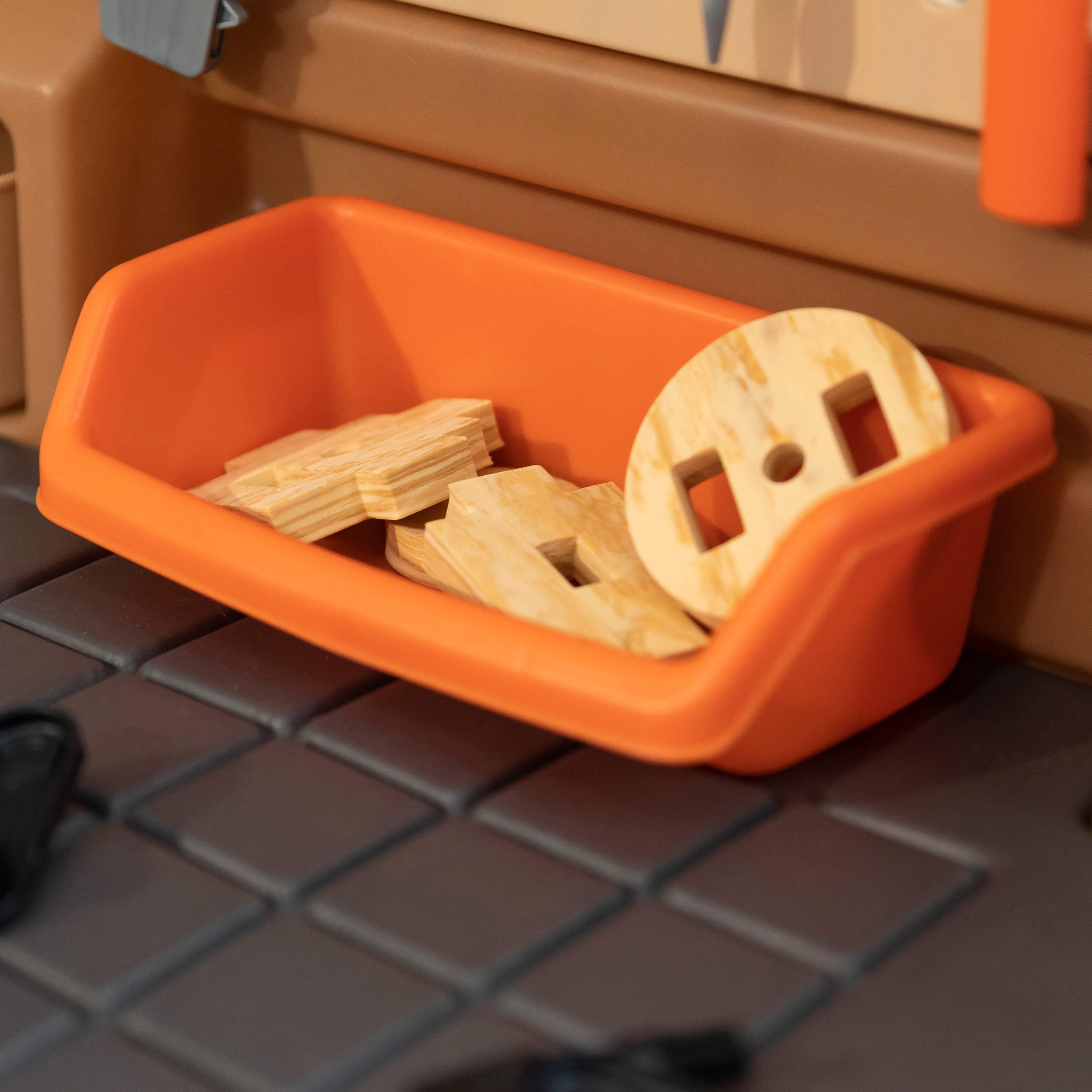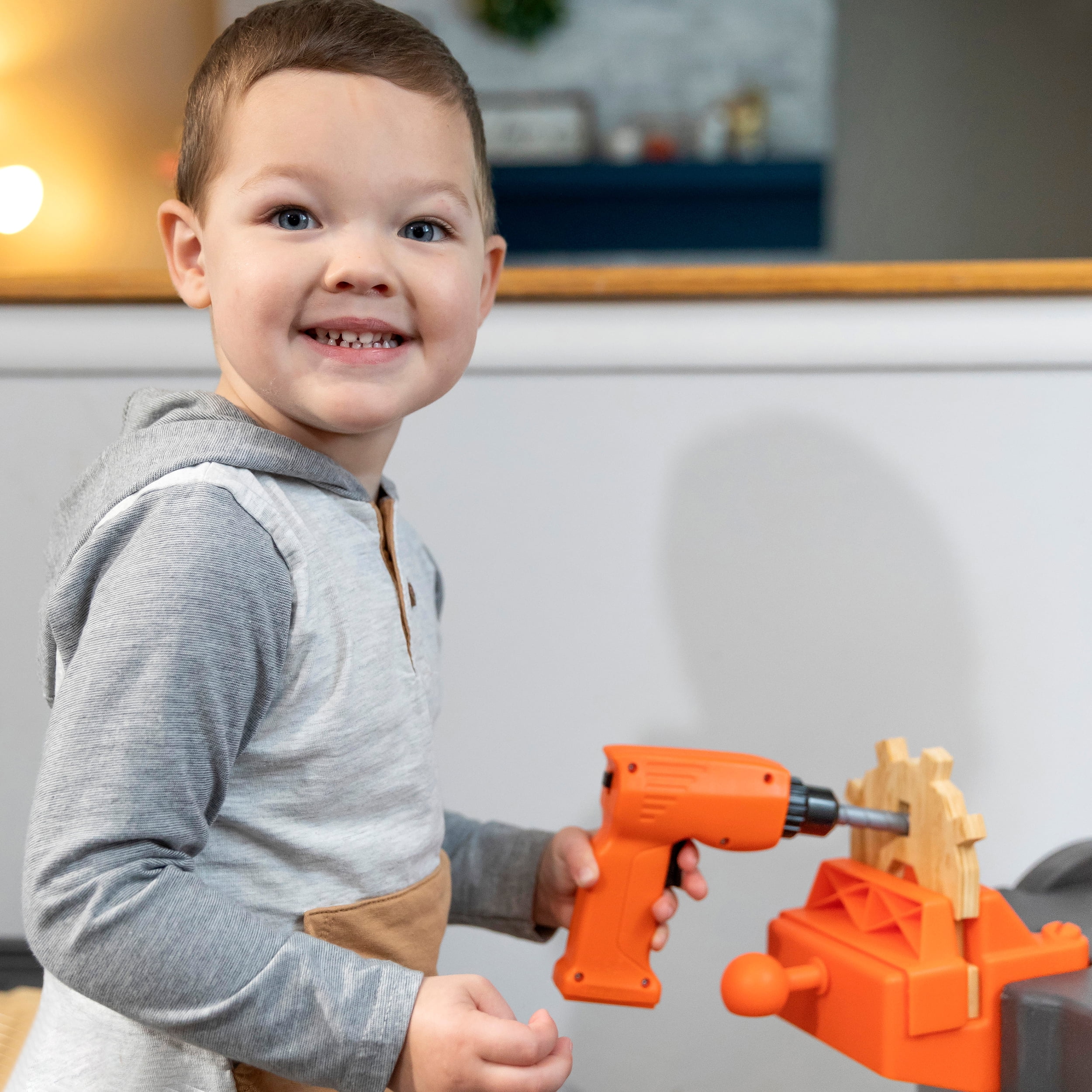 Pull-out utility bench creates even more workshop space for little builders to play together. Realistic power drill help little ones “drill” the perfect hole every time (tools require 4 “AA” batteries, not included). Clean up after playtime with the molded-in utility sink, and keep the pretend workbench set looking tidy by storing accessories in the storage jars, cabinets and bins, and hanging tools on the pegboard. Molded-in drill and nail holes on the workbench tabletop help kids practice hand-eye coordination as they build. Use the working vise to hold the faux wood pieces steady as little ones work. Workshop playset includes Durafoam™ pieces for kids to build their own creations. Adult assembly required. Easy to clean! Use disinfectant wipes or household cleaners whenever you want! In the box: Workbench playset with 75-piece accessory set that includes faux wood pieces, storage bins and jars, and pretend toolkit.