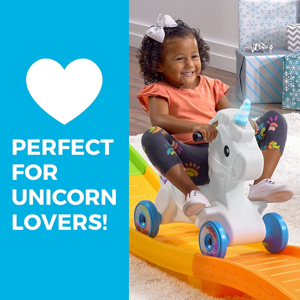 The Step2 Unicorn Up & Down Roller Coaster™ is a magical toddler coaster parents and toddlers will enjoy for many years! This Step2 coaster can be an outdoor magical thrill ride designed for toddlers to school-aged children between the ages of 2 to 5 years. Or an indoor rainbow coaster that will keep our little one playing for hours at a time. A cool feature the Unicorn coaster has is the Unicorn’s horn lights up (3 “AAA” batteries required, not included) to add to the excitement this magical coaster will provide. This Step2 kid coaster is designed with your child’s safety in mind and features two non-slip steps that lock securely into the 3-piece track with access to the platform from both sides. The recessed retainer wells hold the coaster car safely in place until your little one is ready to roll. Coaster car is an ATV with a high back, handrail and foot rests for a secure ride each and every time. With the up and down coaster track spanning 9 feet this toddler roller coaster will put the thrill in their ride each time they ride and re-ride for hours at a time. Another benefit of the Unicorn Up & Down Roller Coaster™ made by Step2 is the coaster was designed to be sturdy, safe and a great addition to any indoor playroom or backyard fantasy land. This coaster was also developed to aid in your toddler’s development by promoting gross motor skills by pushing the Unicorn car back up the track, hand-eye coordination and works on your child’s balance. Adult Assembly Required.