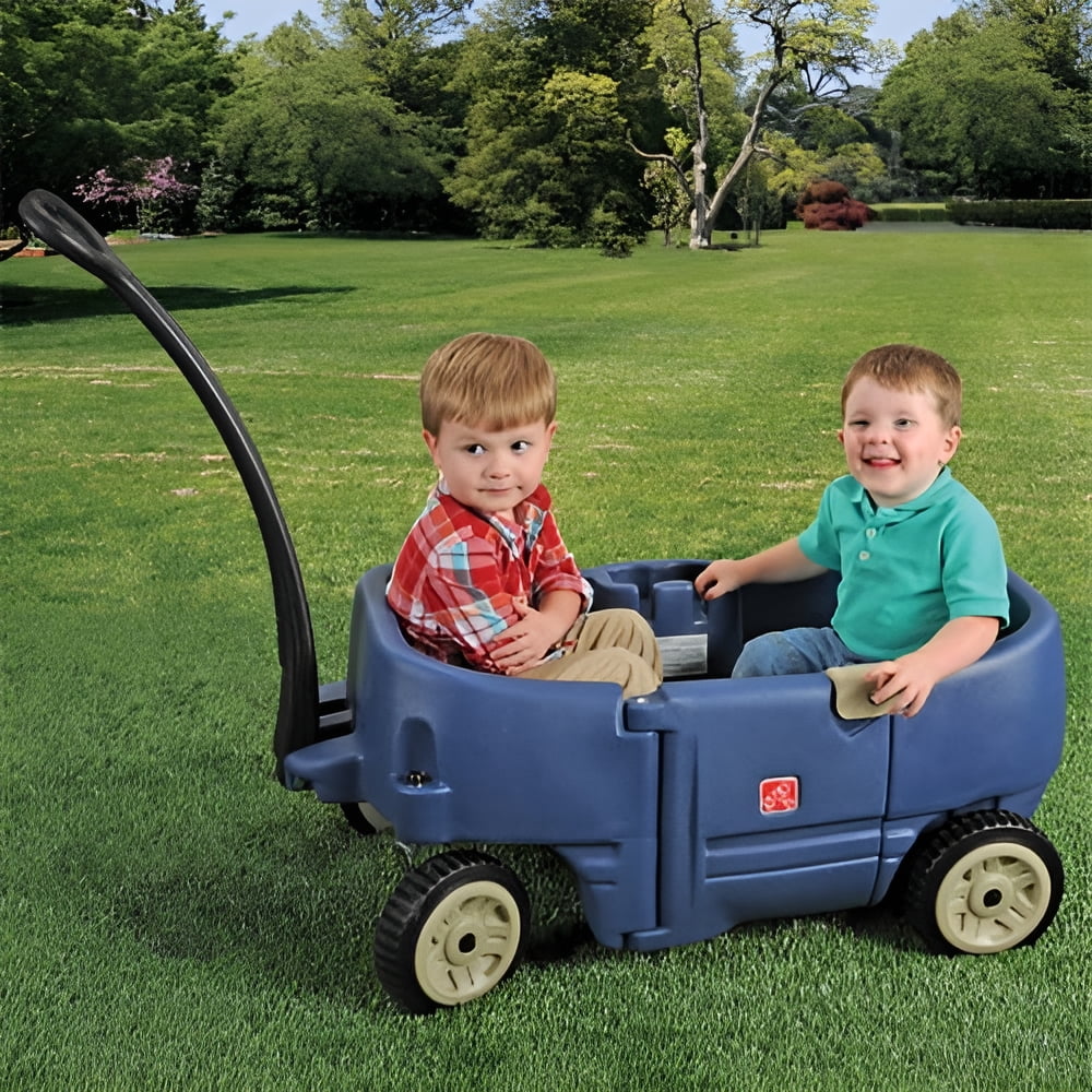 The Step2 Wagon for Two Plus is a blue wagon for kids made to easily transport your toddler or school-aged children when out on a family outing at the park, zoo or just out on a walk. This Step2 kids wagon features a light, but strong plastic construction so you know it is safe and sturdy to transport your little one within this toddler wagon. Easy-latch door provides piece of mind knowing you child will not fall out of this plastic wagon. For a ride on toy the quiet-ride wheels and two contoured seats allow for a quiet and comfortable ride while out shopping. When developing this wagon for kids Step2 designed it with your child’s safety as most important. Therefore, this toddler wagon seat belts to protect your little girl or boy and deep foot wells for a safe and secure ride. This kids wagon can also be viewed as wagon stroller because it also offers a storage compartments underneath the seats providing parents a place to store diapers, snacks, spare clothes and more in case of emergencies. With an extra-long handle that folds underneath. The Wagon for Two Plus made by Step2 can be transported in the car on trips to see grandma or easily stored at home. Plus, another wonderful feature is the molded-in floor drain holes for accidental spills or easy drainage if left out in the rain. With the Step2 logo on the side of this wagon you know your child’s safety was top of mind, the wagon was made with sturdy plastics and will last a long time but also comes with a limited warranty. Adult Assembly Required!