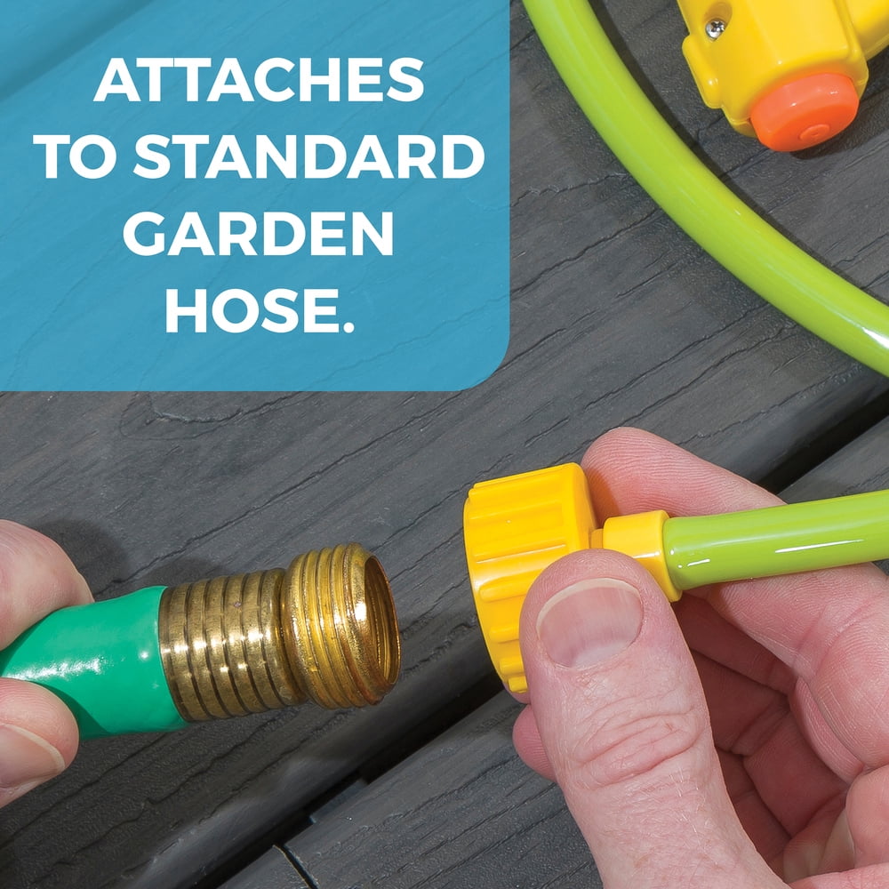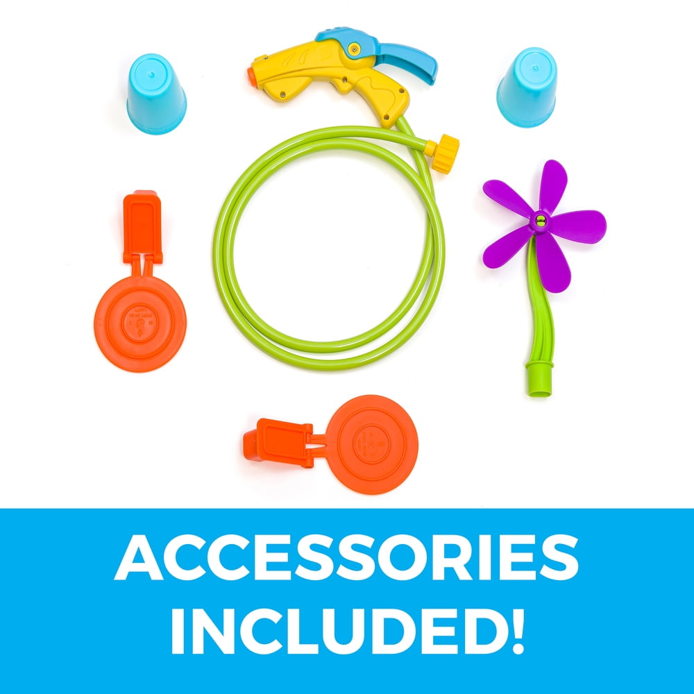 Practice hand-eye coordination and fine motor skills with the water blaster to shoot water at the targets. Targets include knock-down cups, spinning paddles, duck hunt flippers, and a pinwheel. Bullseye target funnels water into a fill-and-spill bucket, that spills into the basin below. Targets are secured on a sturdy wall with a wide base for extra stability and to catch the water. Water blaster with hose attaches easily to a standard garden hose. Made EverTough™, the Waterpark Arcade features unmatched strength and durability, ready to outlast hours of playtime fun! Easy to clean! Use disinfectant wipes or household cleaners whenever you want! In the box: Arcade wall with targets and basin, accessories include water blaster with hose attachment, two cups, spinners, and more.