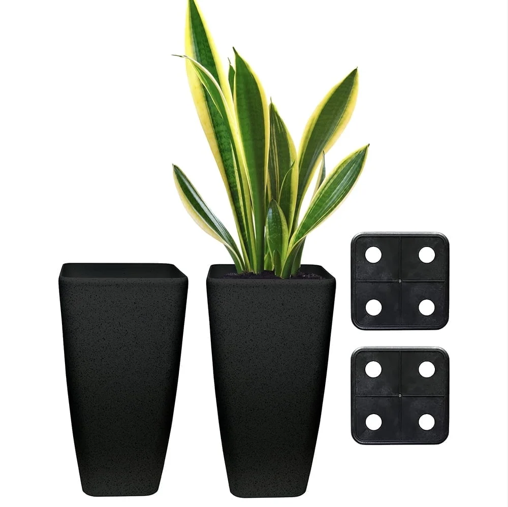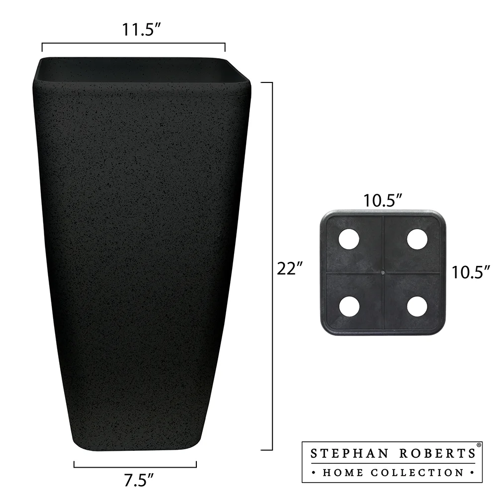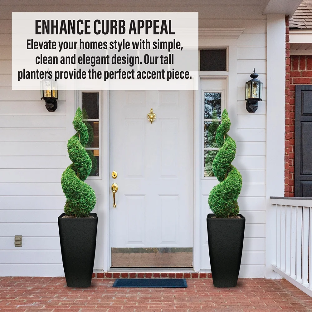 Set of 2 black tall planters that add height and dimension to your garden or home decor Eco-friendly tall plant pot made from recycled resin, stone powder, and wood fibers for a sustainable choice Weather resistant design allows for use in both indoor and outdoor settings 4 raised drain holes to filter out excess water and keep your plants healthy Compact size of 7.5″ x 11.5″ x 22″ fits well in corners, next to tables, on staircases, and in entryways