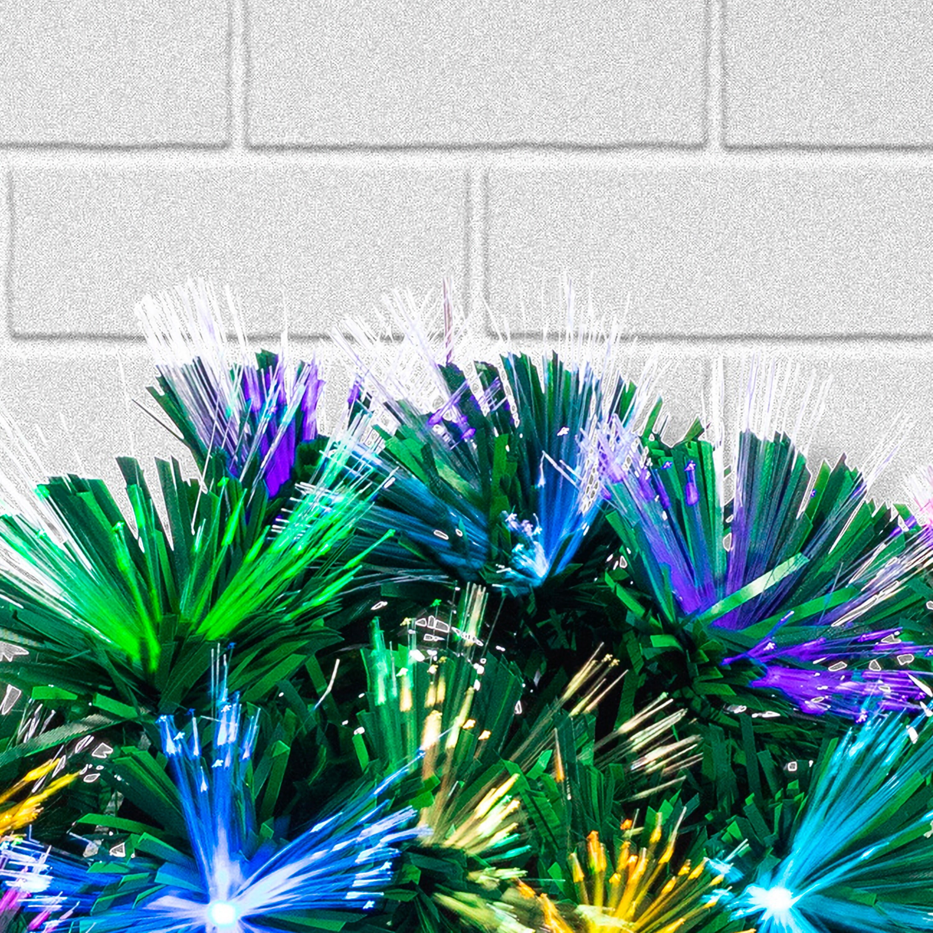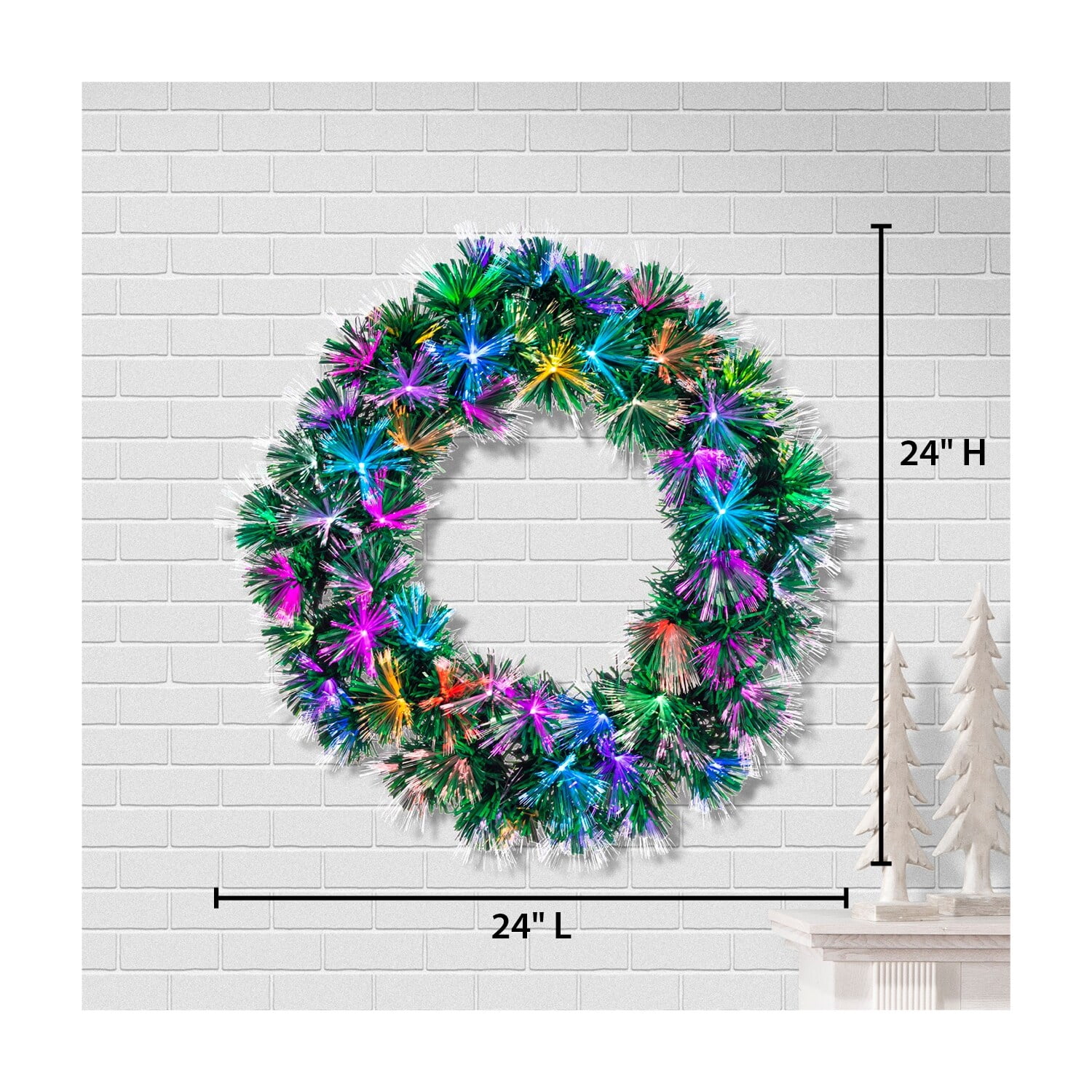 Bring color into your holiday decor with this electric fiber optic wreath, it measures 24-inch in diameter This lovely wreath is powered by a UL-Listed cord for your safety 75 color changing fiber optic lights illuminate this wreath Made from PVC this pine wreath provides a green background for the pretty colors Ready to easily hang on your wall or door, this wreath will delight family and guests Use this alone on a mantel to brighten up your hearth, or add seasonal decor for an outstanding display
