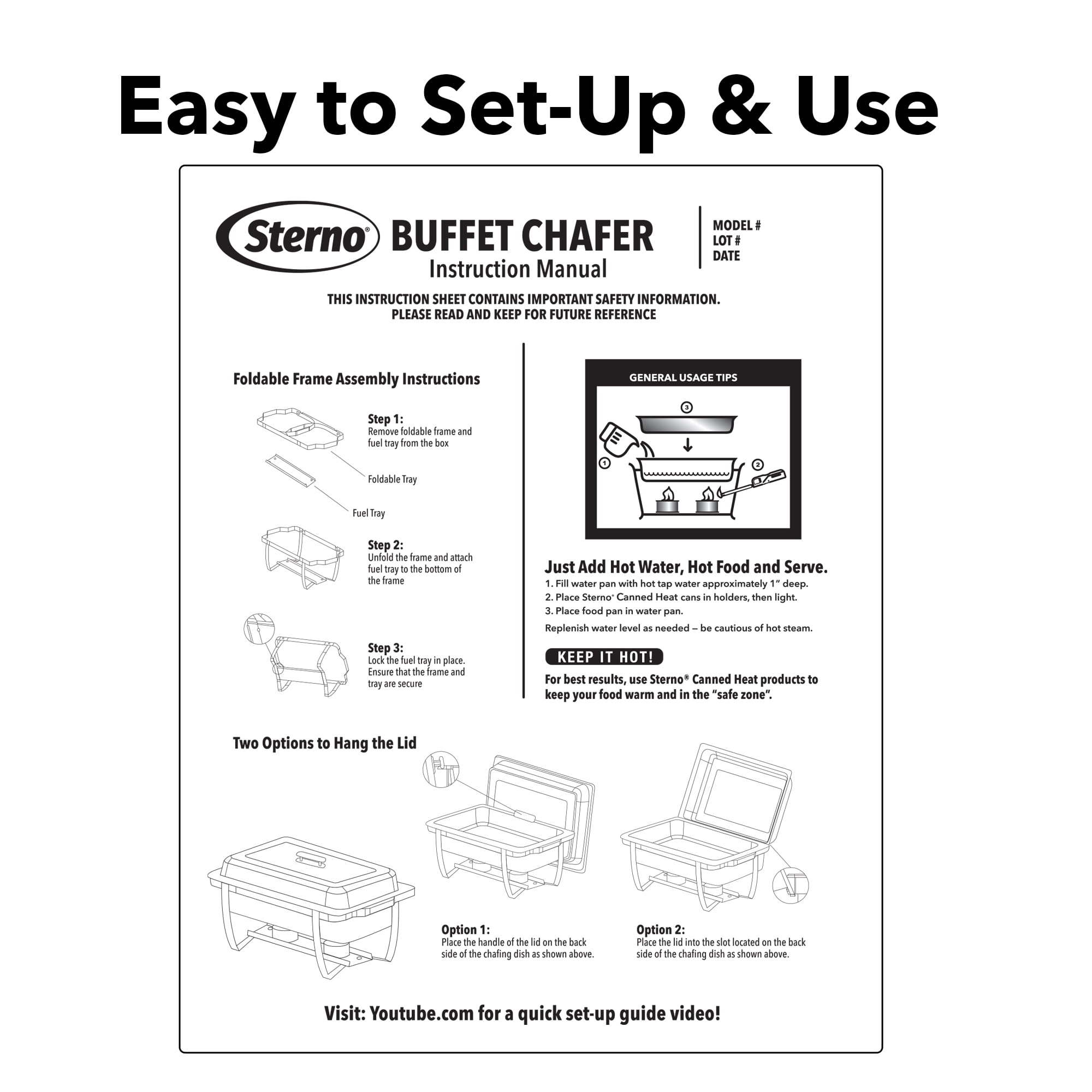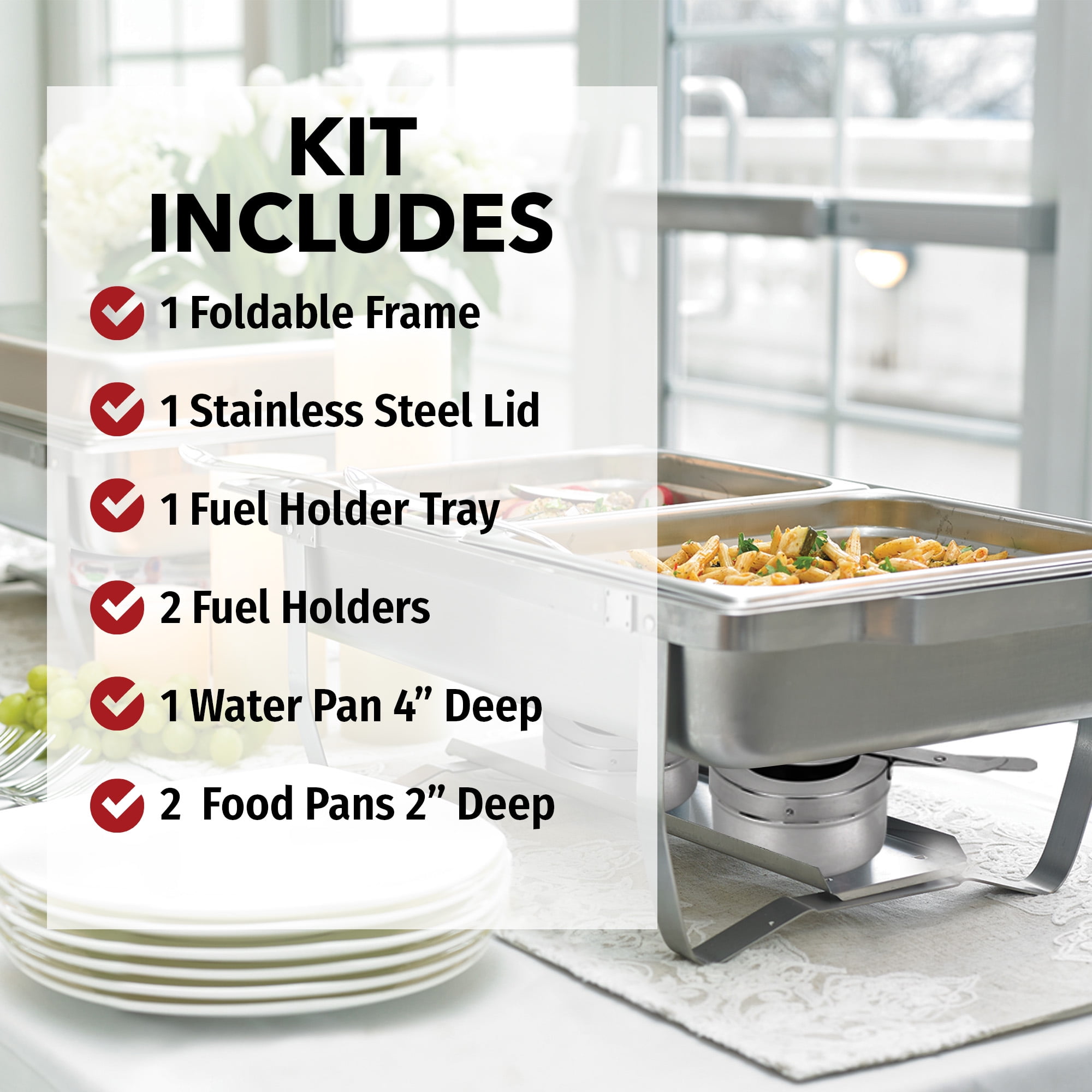 The perfect choice for catering and food service Set comes with (1) foldable frame, (1) lid, (1) Fuel Holder Tray, (2) Fuel Holders, (1) – 4″ Deep Water Pan and (2) – 2″ Deep Food Pans Foldable frame makes it easy to transport and store High-quality stainless steel construction Great for professionals or home cooks Use Sterno Chafing Fuels for best results (sold separately) 8 Quart Chafing Dish