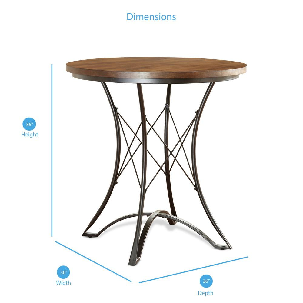Dimensions: 36 diam. x 36H in. Metal frame with birch veneers top Hand-applied burnished wood finish Arched table base with wire stretchers Counter height dining table Seats 4 people Use in indoor dining or kitchen area