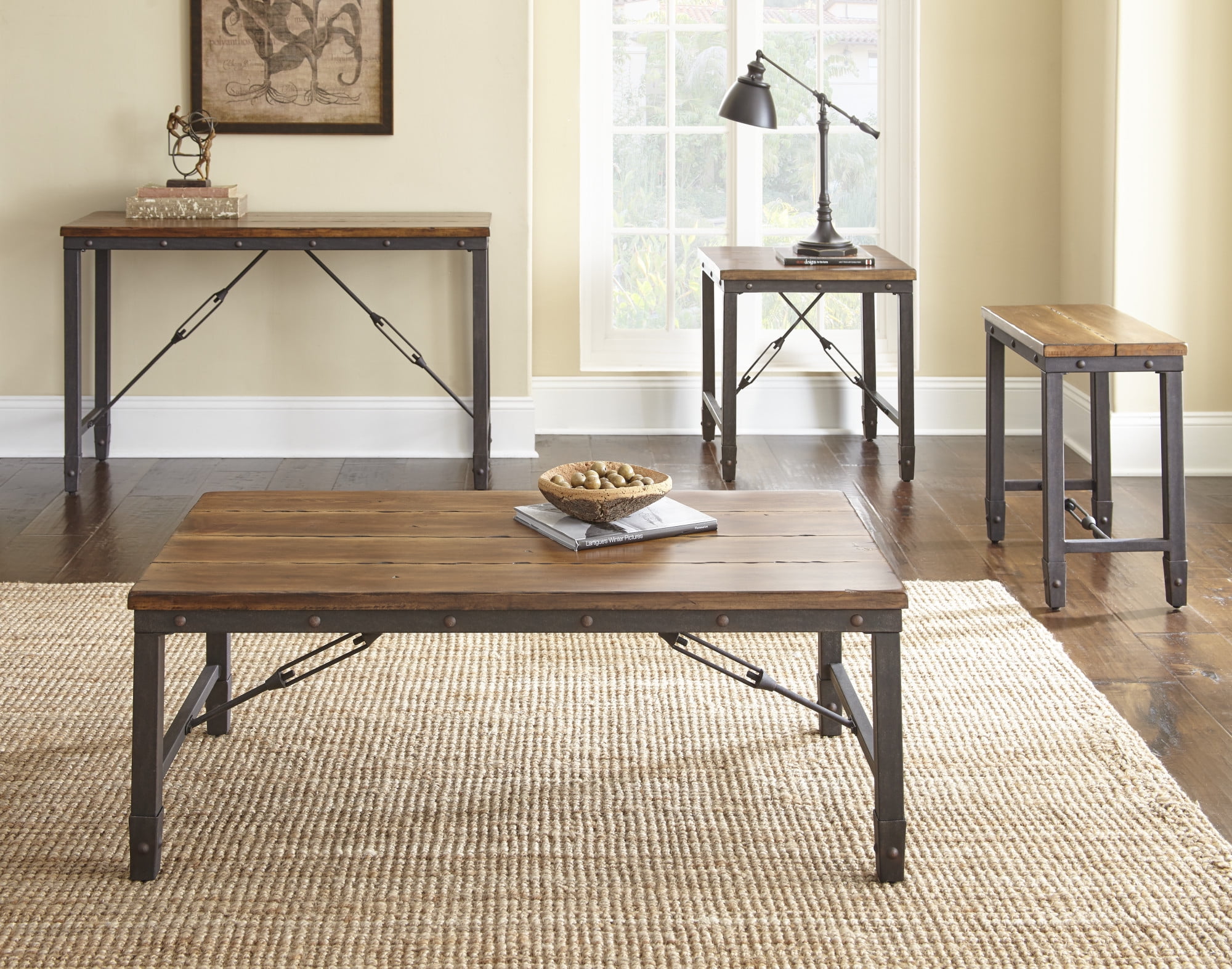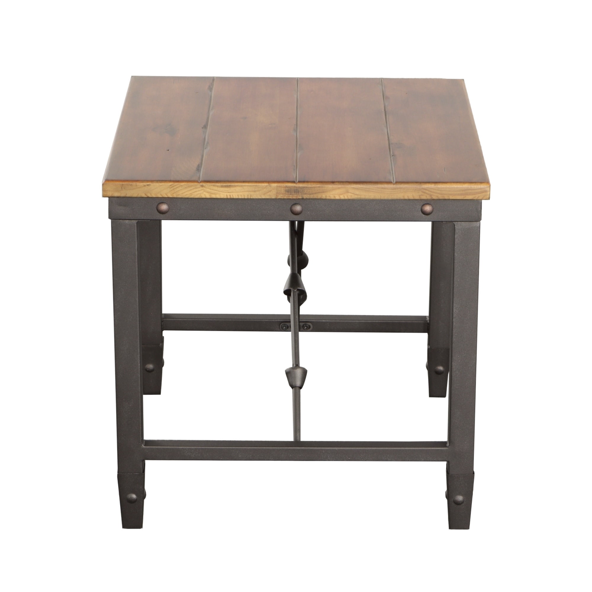 Finish: Antiqued Honey Brown Constructed of pine solids and iron Nailhead trim Plank effect top Cable stretchers Product Dimensions: 24″ H x 23″ W x 23″ D