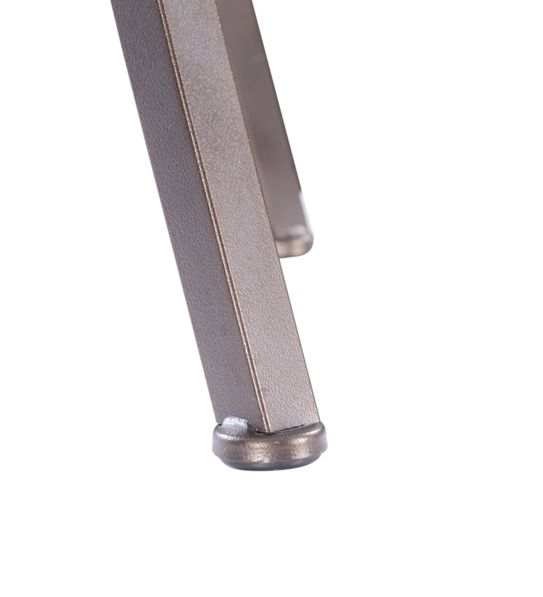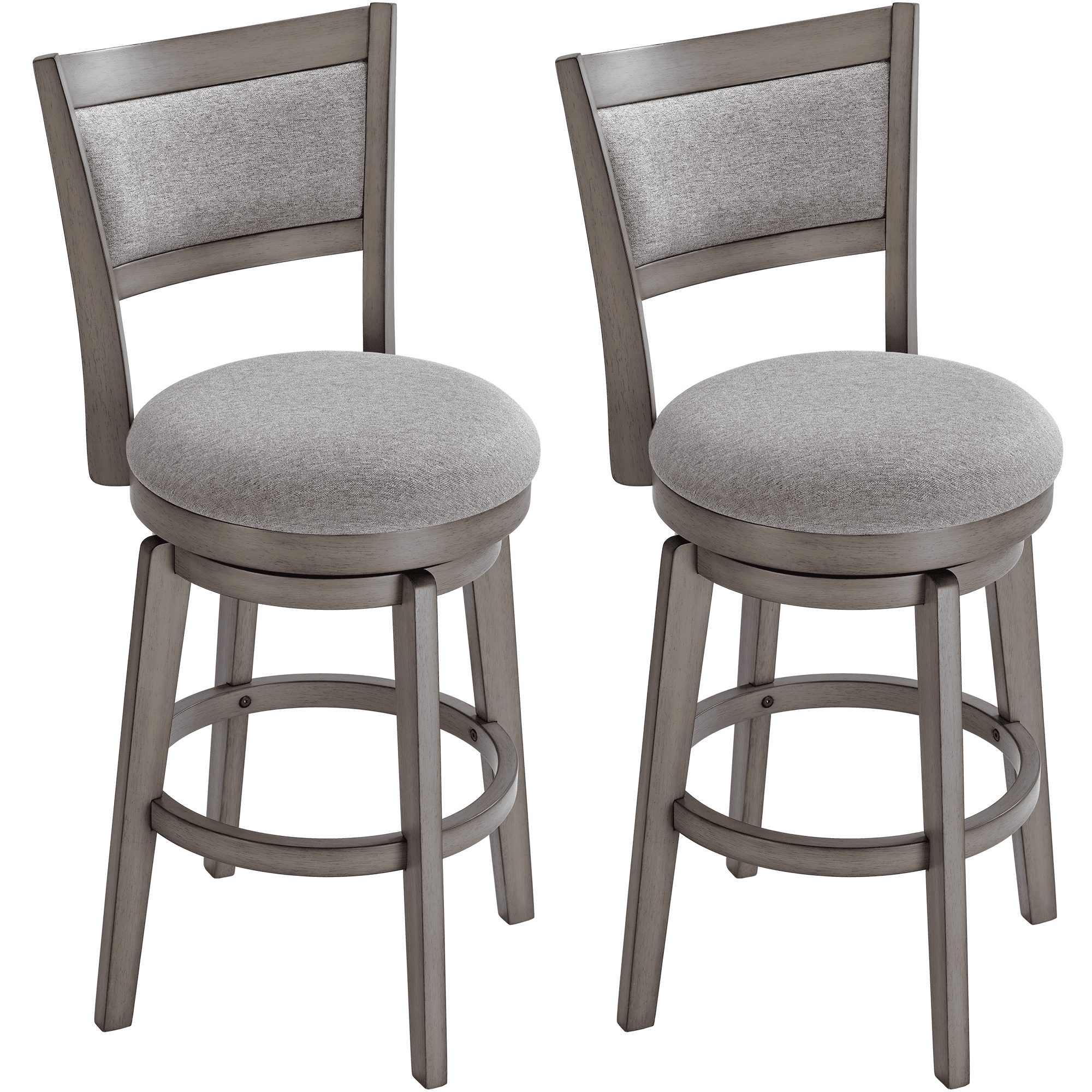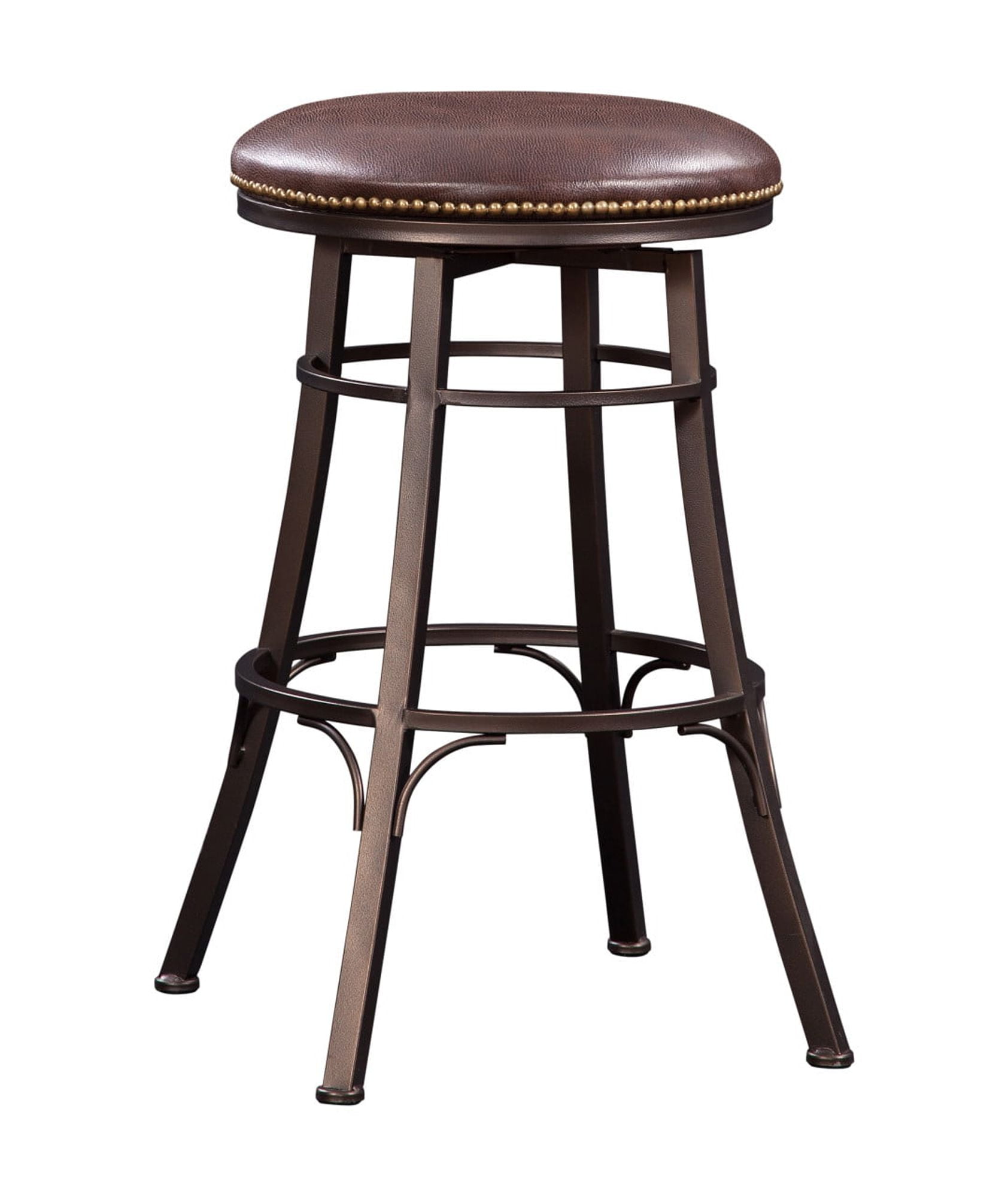 Dimensions: 18W x 18D x 30H in. 360-degree swivel seat with nailhead trim Leather upholstered padded seat, metal frame Transitional style with flared legs Brown bonded leather upholstery Backless design with built-in footrest ring Nail Head Detail