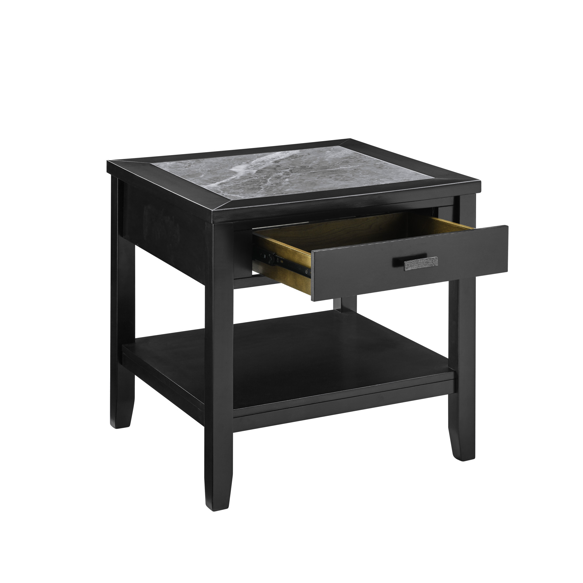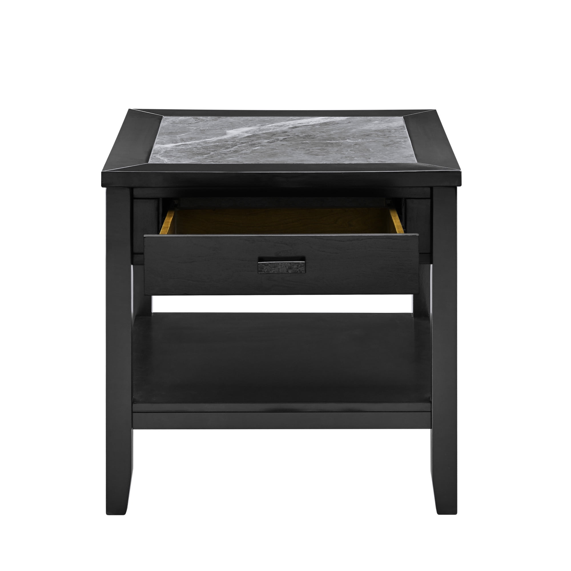 Garvine End Table Transitional styling with a dark, smoky design, the Garvine End Table dresses up a living area or bedroom with easy care style. A gray sintered stone top adds an elegant easy-care accent with enhanced performance features including moisture, scratch and heat resistance. A bottom shelf offers display or storage options while a convenient drawer offers valuable storage for remotes, electronics or other items. Your purchase includes one end table. Sintered stone is manufactured from natural stone, is non-porous, never needs to be to be sealed and is extremely durable and beautiful Sintered stone inlay offers enhanced performance features including moisture, scratch and heat resistance Transitional styling with tapered legs and clean lines Bottom shelf adds structural stability to the table One drawer with metal side glides Hammered oil-rubbed nickel hardware Top Color: Gray sintered stone
