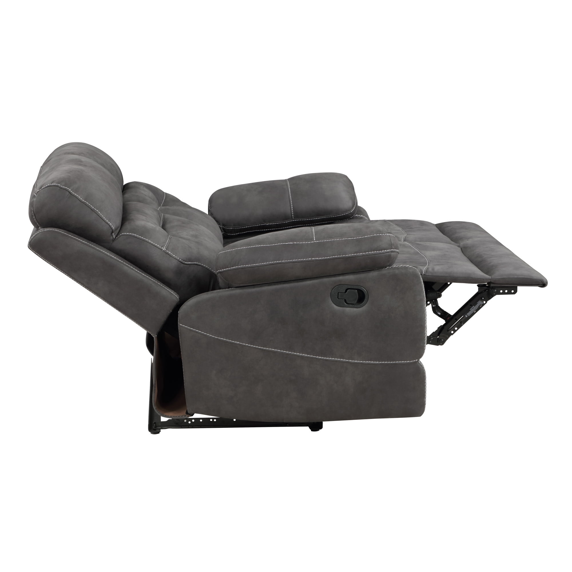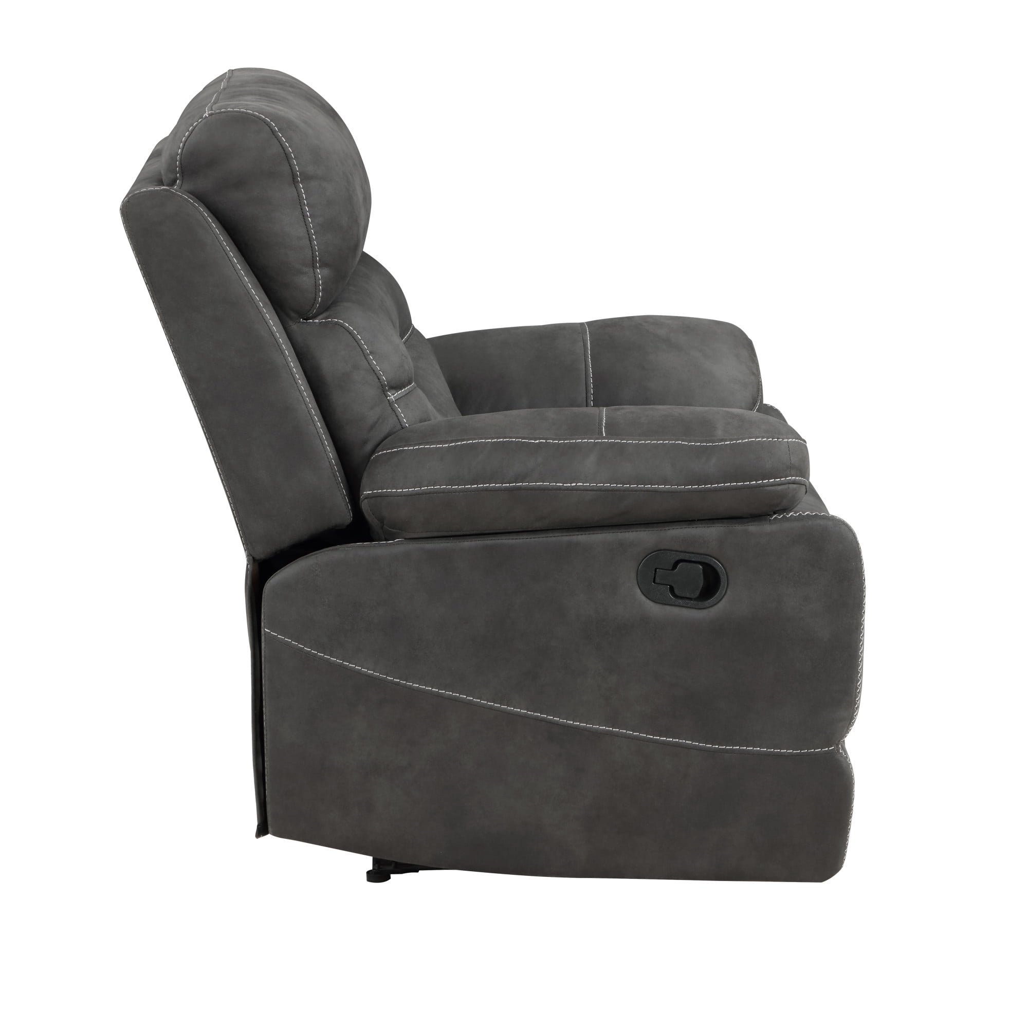 Constructed from fiber wrapped foam encased in a bomber jacket micro-suede for durability and comfort Effortless one-pull manual reclining motion to your preferred position Removable backs offer ease in transporting through small hallways and doorways No-sag steel sinuous springs provide cushioning and strength Contrasting baseball stitching adds a stylish detail to the design Gray micro-suede cover offers a rugged yet refined look Plastic glides help prevent scratches on your floors