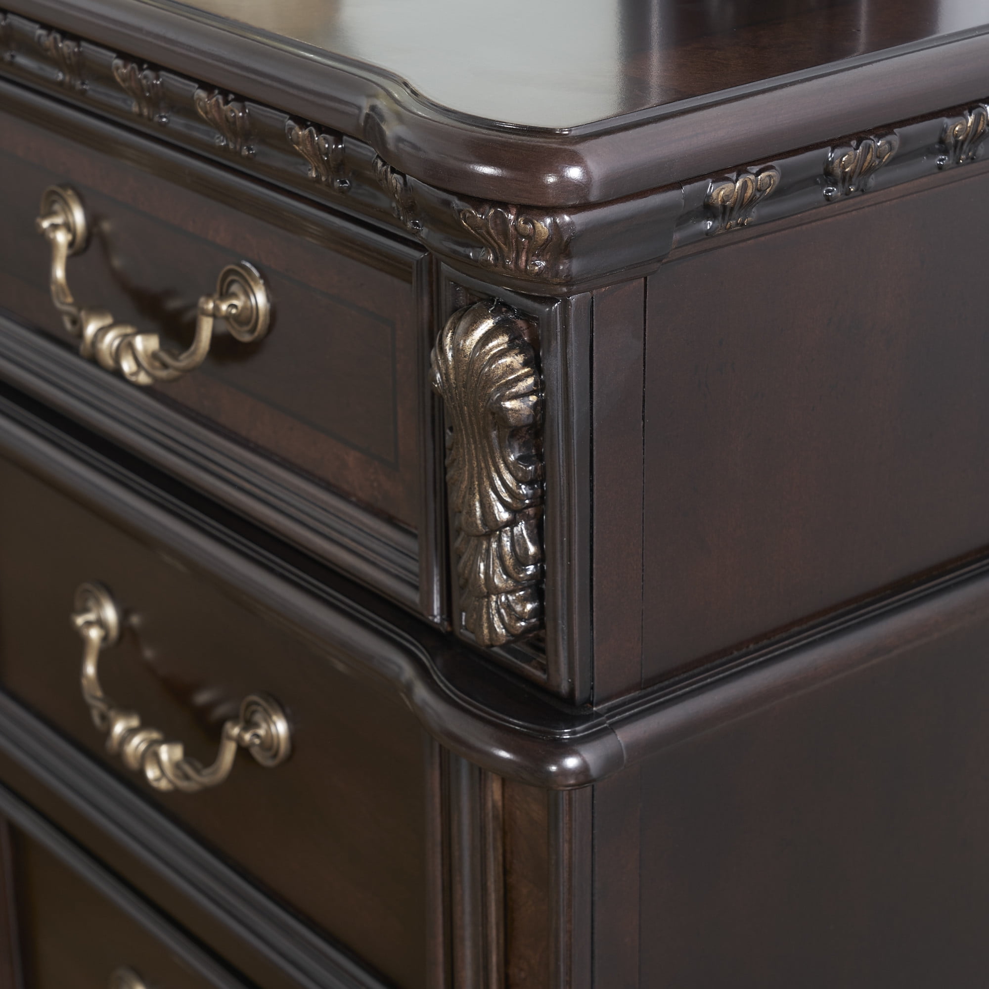 Constructed of Cherry and veneers, poplar solids and man-made components Rich cocoa finish Dovetail drawer construction with smooth gliding metal side mounted drawer glides Dust proof panel under bottom drawer Felt lined top drawer Intricately designed antique brass hardware Shaped front embellished with floral carving details highlighted by elegant gold tipping Carved bun feet Product Dimensions: 29.5″H x 29″W x 18″D