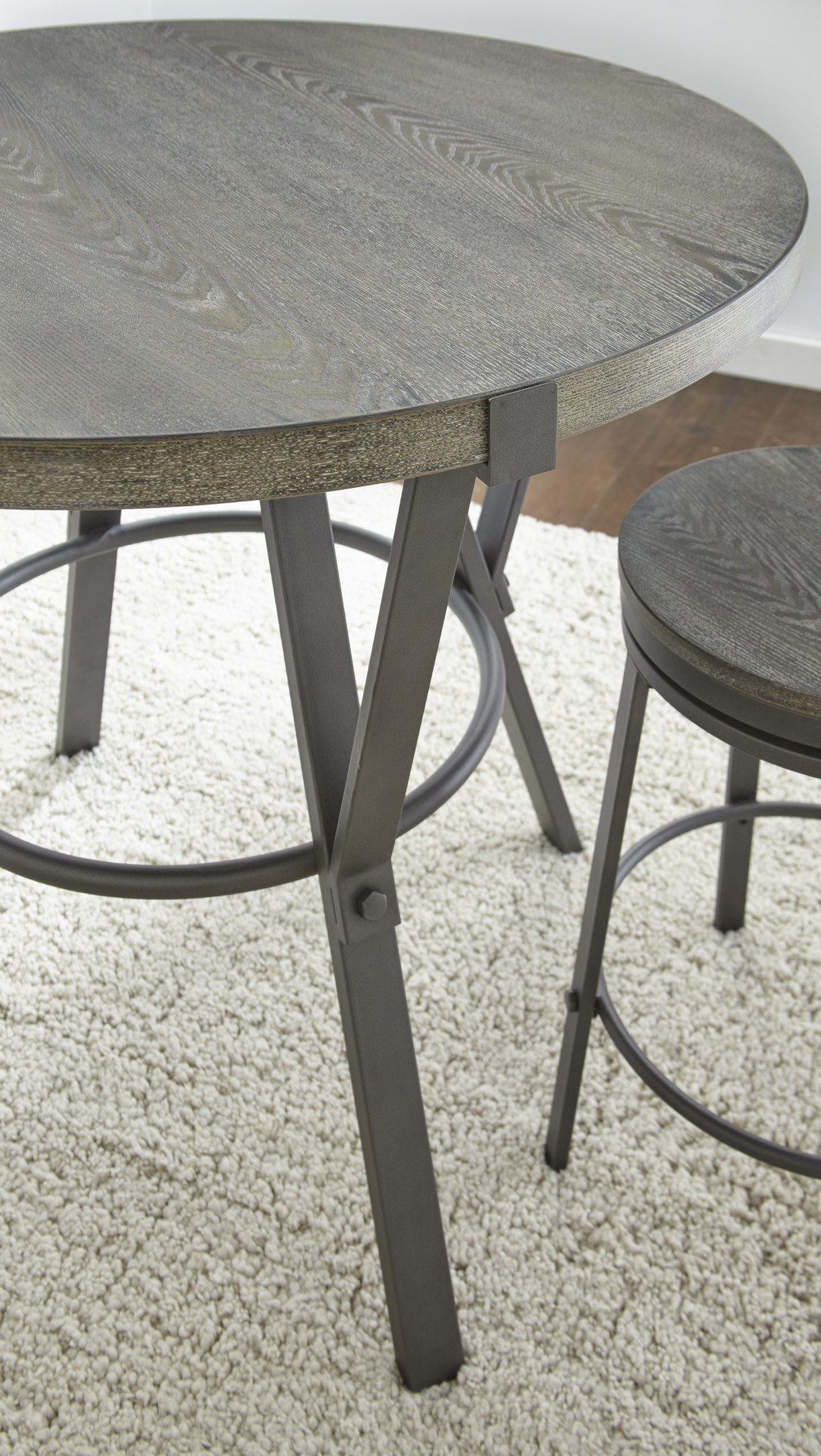 Industrial design in a compact size make the Portland Round Counter Height Dining a great addition to your home. The Counter Height Swivel Stools are constructed with an ash veneer seat in a grey-brown finish with a powder coated iron base in a gray finish. Features include a swivel seat while the circular stretcher provides comfort and stability. Floor glides are included to protect your floors. Matching counter height dining table is available for purchase separately. Your purchase includes 2 counter height swivel stools.