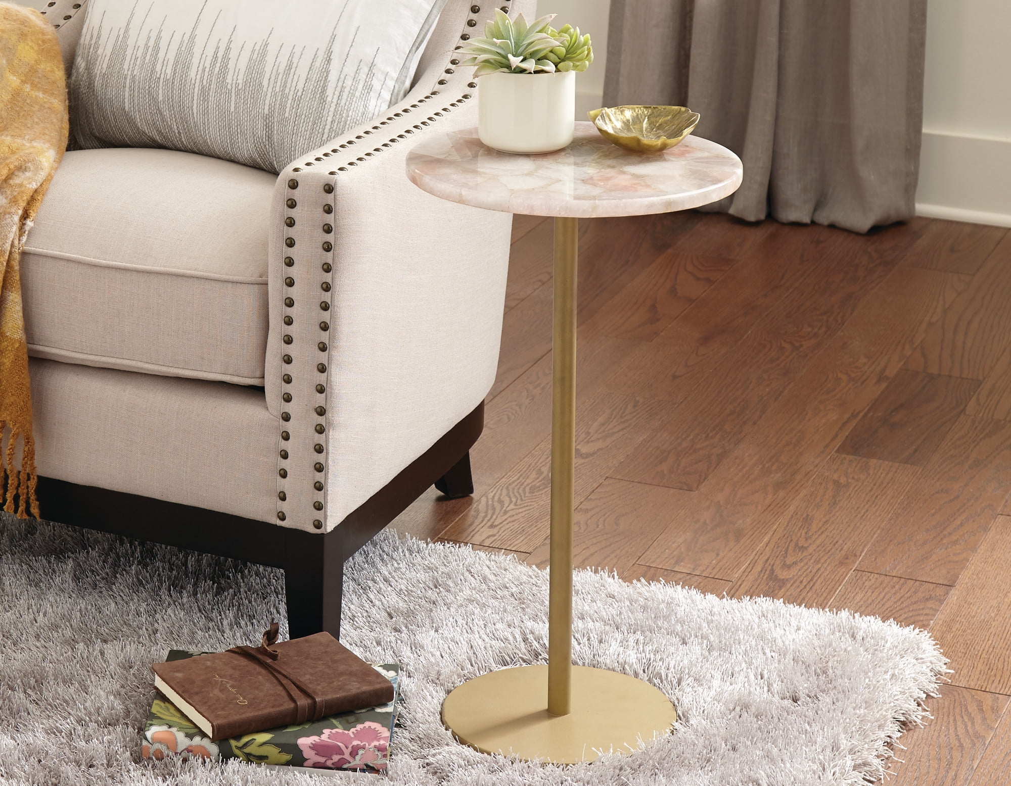 Finish: Rose quartz/Brass Rose Quartz, Powder coated iron Top colors vary slightly with the natural coloring of the stone Pedestal base is powder coated in a flat brass finish and resists scratches and rust Small size makes it versatile