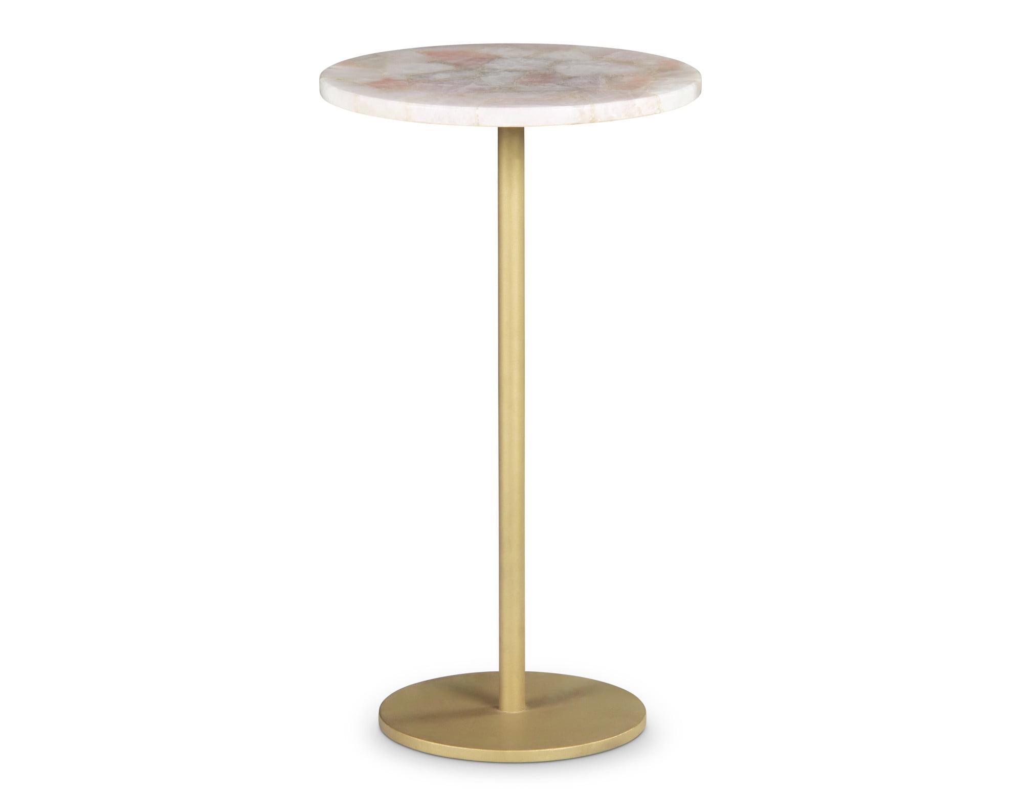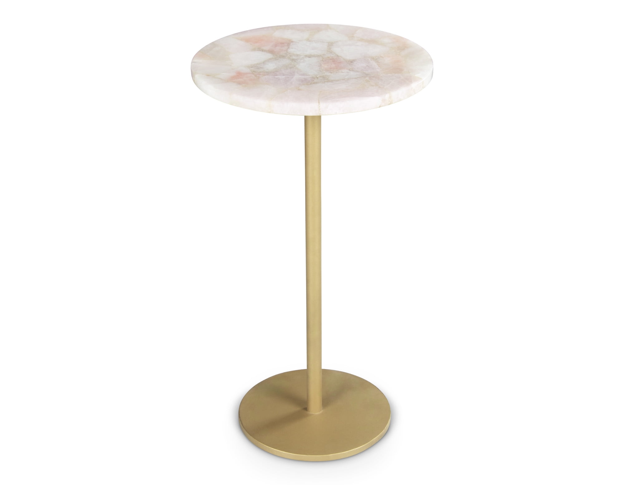 Adding a touch of glam in a small space is easy with the Rosie Round Chairside Table. The rose quartz top exudes soft elegance while the powder coated brass finish of the iron base adds flair. Perfect landing place for the current book you are reading or your favorite drink. Your purchase includes one round accent table. Features: Finish: Rose quartz/Brass Rose Quartz, Powder coated iron Top colors vary slightly with the natural coloring of the stone Pedestal base is powder coated in a flat brass finish and resists scratches and rust Small size makes it versatile Specifications: Product Dimensions: 25″H x 14″W x 14″D Product Weight: 26.51 lbs