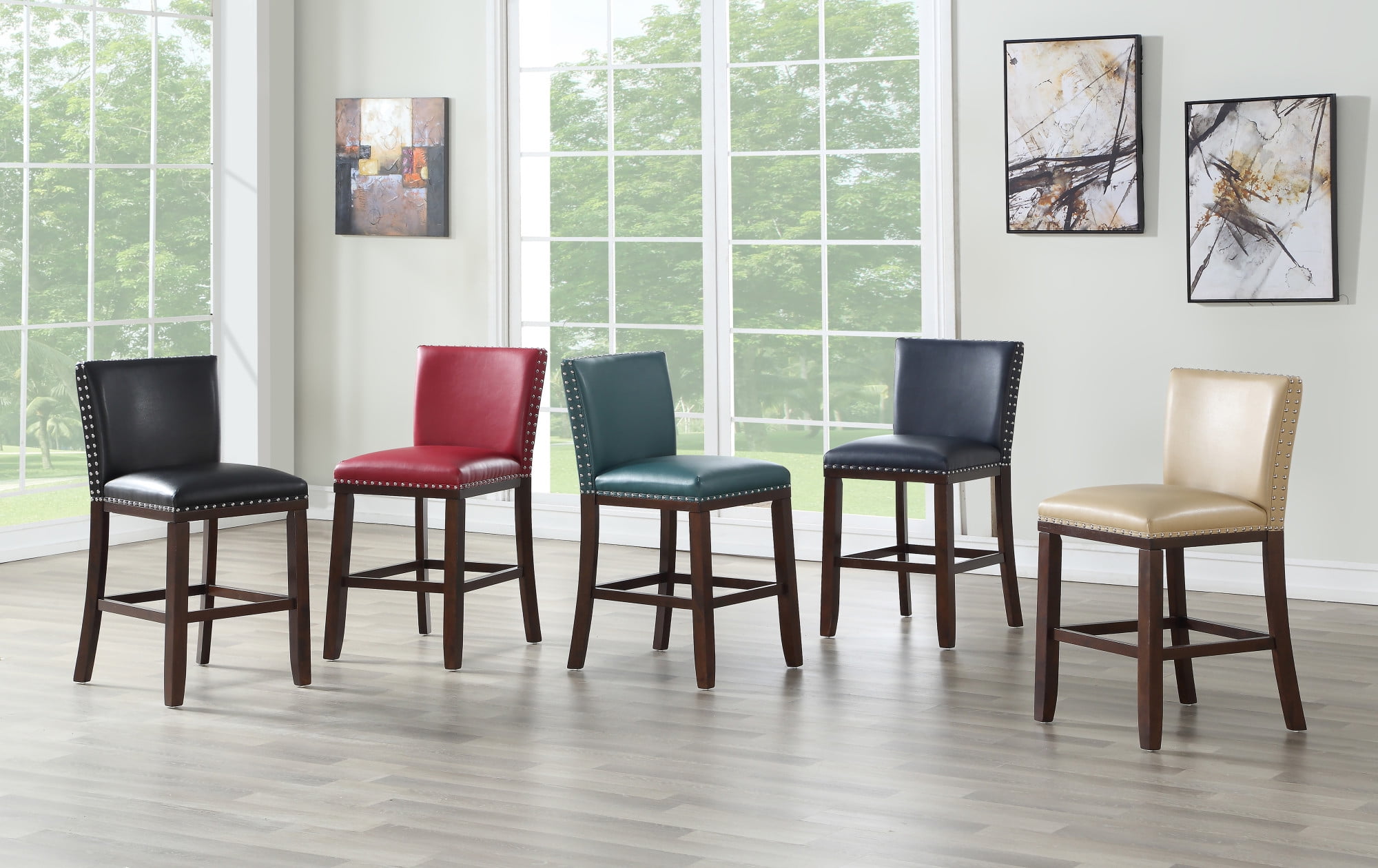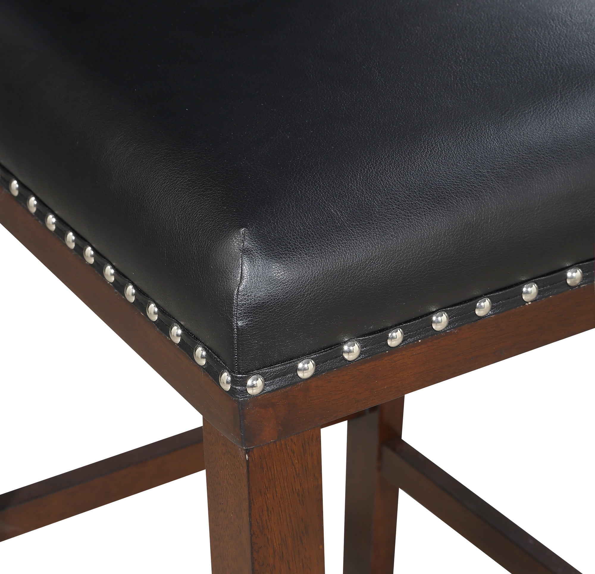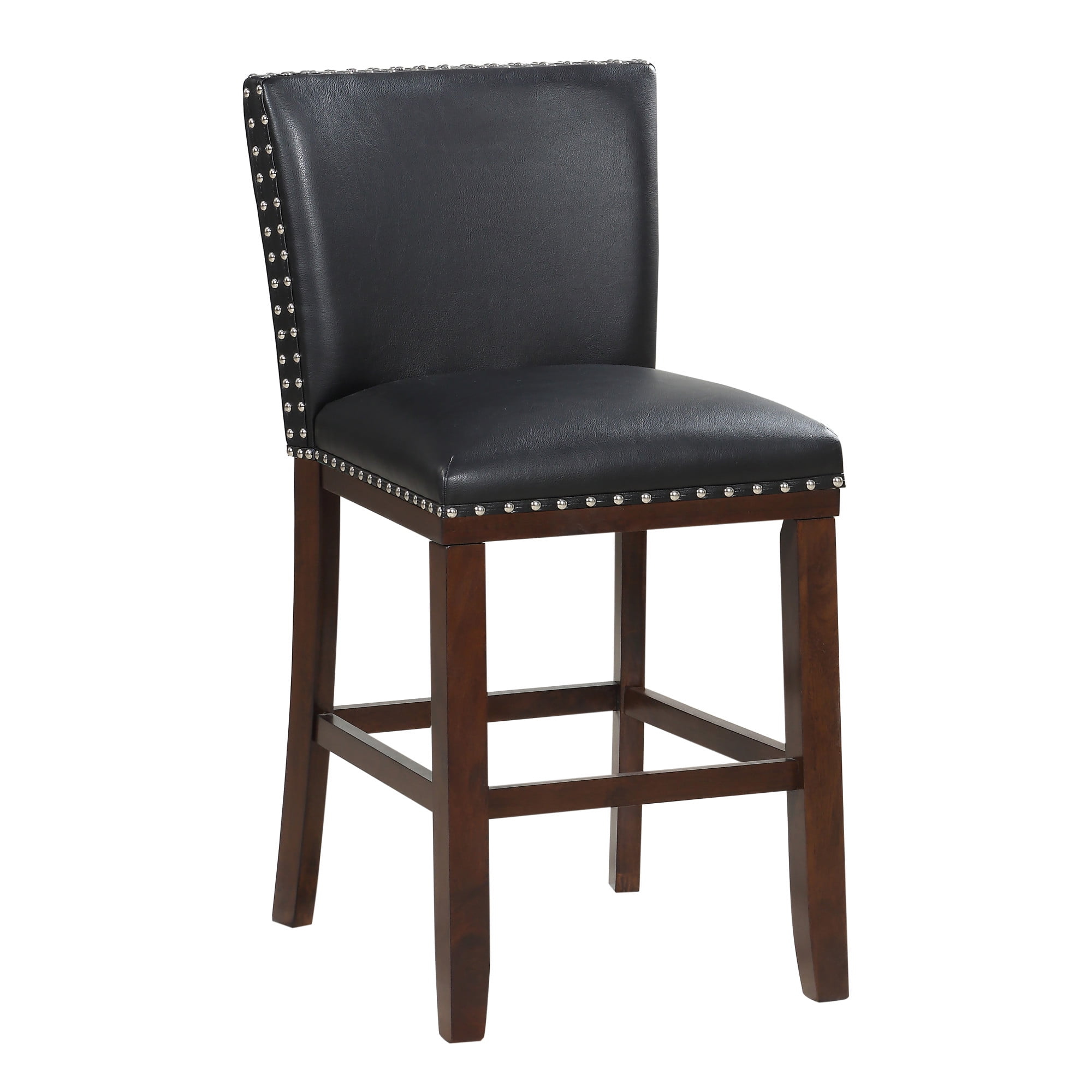 Dimensions: 18W x 22D x 37H in. Seat height: 24 in. Constructed from solid wood and faux leather Wood frame features in a black finish Choose from available upholstery finish options Features faux leather upholstery Decorative nailhead trim Minimal Assembly required