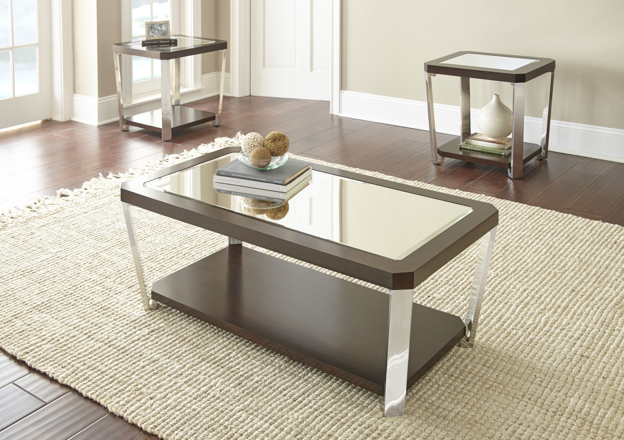 Glass mirrored top Stainless steel legs Beveled Mirrored tops Espresso wood frames the glass top Mixed materials of wood, steel and glass Bottom shelf of espresoo finish and wood offers area for Canted legs for a beautiful display Use in indoor living areas