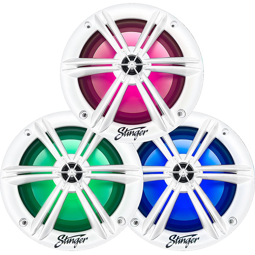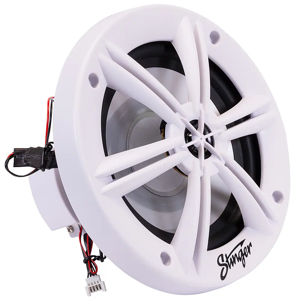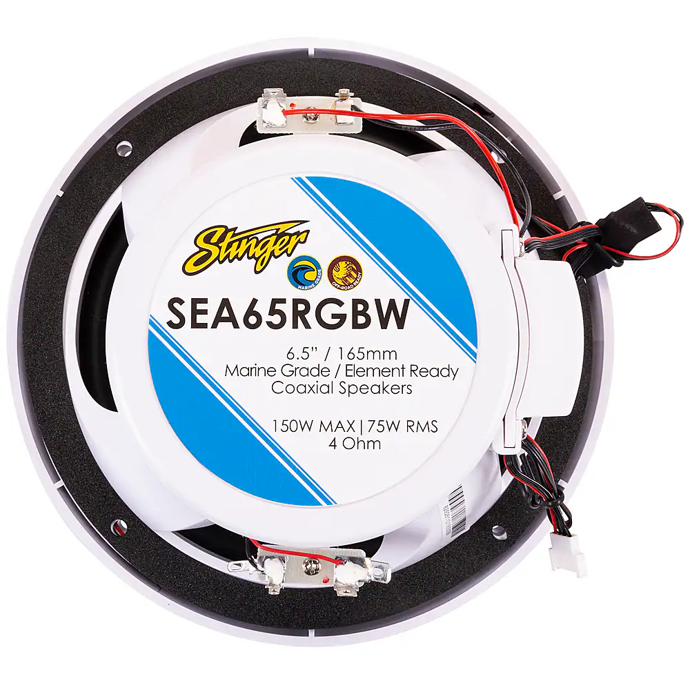 Take your audio outdoors with a pair of 6.5” 2-Way Marine Coaxial LED Illuminated Speakers with Poly Carbon Cones by Stinger. Customize your speakers with fully adjustable full spectrum LED lighting using the included wireless remote controller. These element-resistant speakers feature precision non-corrosive terminals, splash resistant sealed motors, and UV treated molded polymer to ensure long-lasting use for all of your marine and powersports applications. The SEA65RGBW can handle up to 150W peak power (75W RMS) and features a built-in crossover to deliver powerful sounding audio.