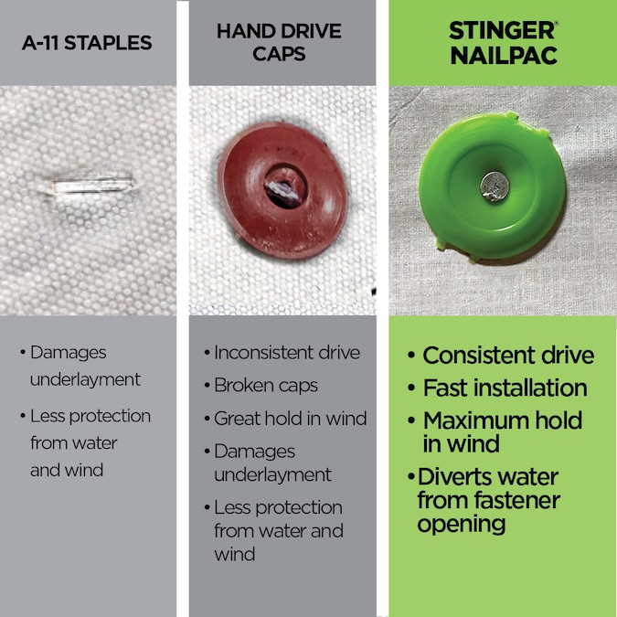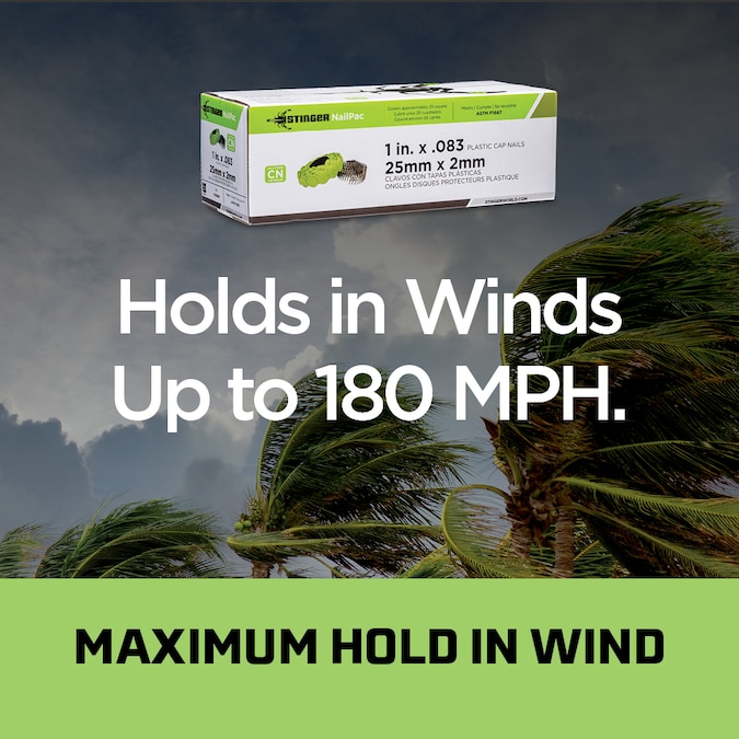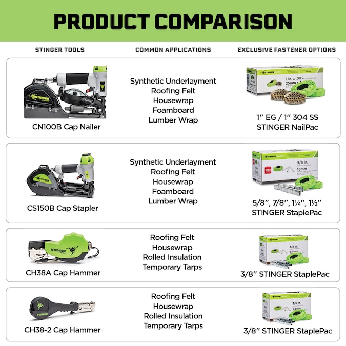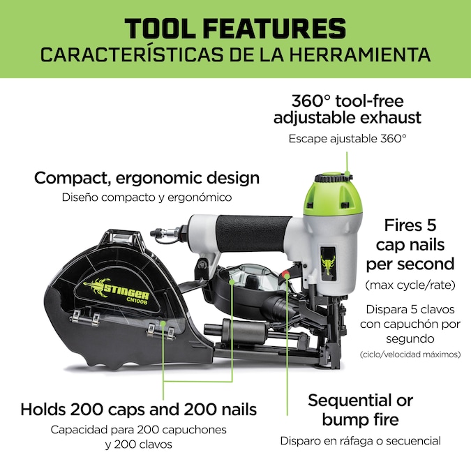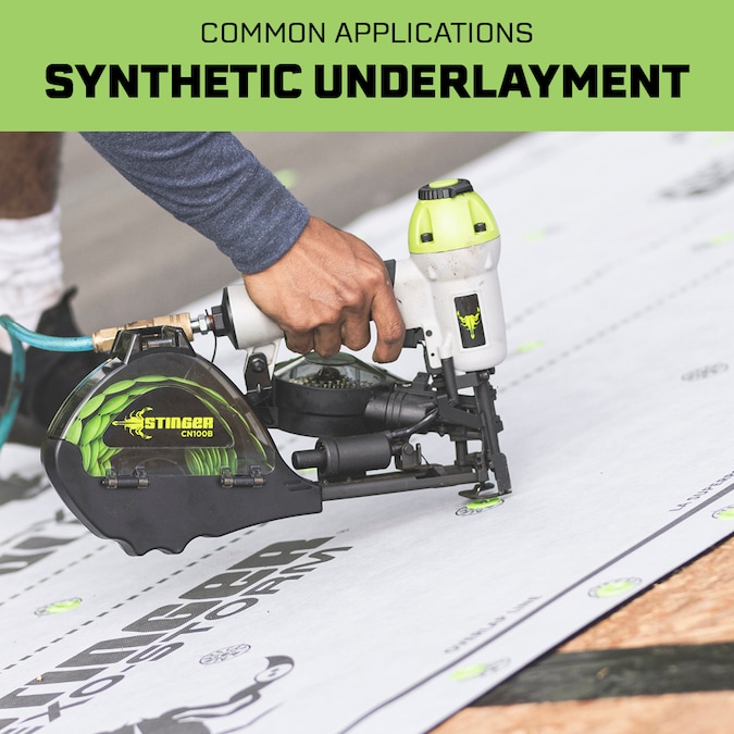 STINGER CN100B Cap Nailer, 136252, is a best practice pneumatic tool for securing roofing underlayment, felt and house wrap where nails are required and speed is vital. The CN100B delivers code compliant cap nails featuring 1 in. nails with a 1 in. plastic collated cap that pass 2012 ICC Building Codes. Each plastic cap offers superior holding power to the traditional staple, while also diverting water away from the fastener opening. This means more secure underlayment and extra protection against wind and water damage. With each STINGER CN100B you will also receive a durable plastic case and protective eyewear.