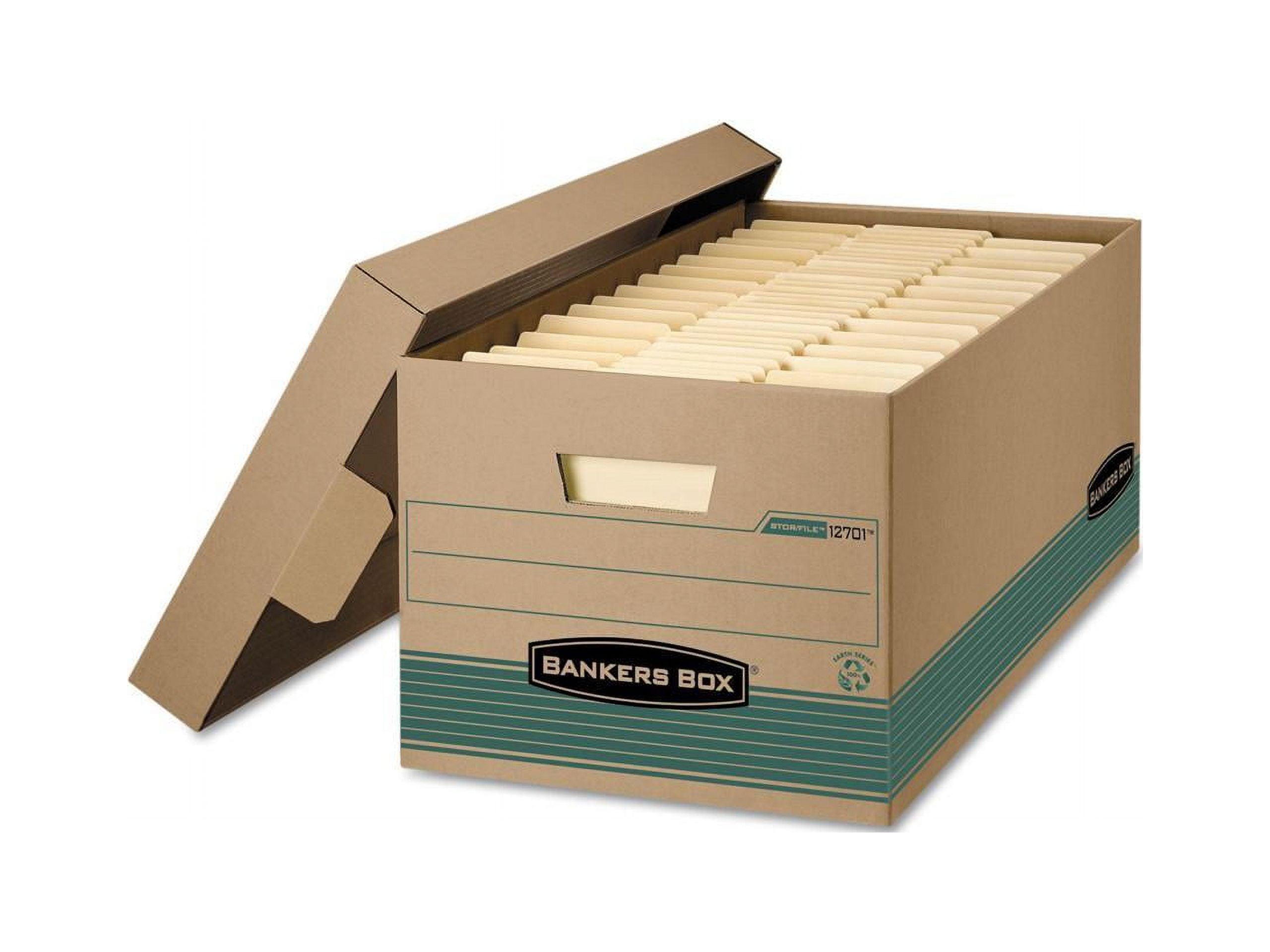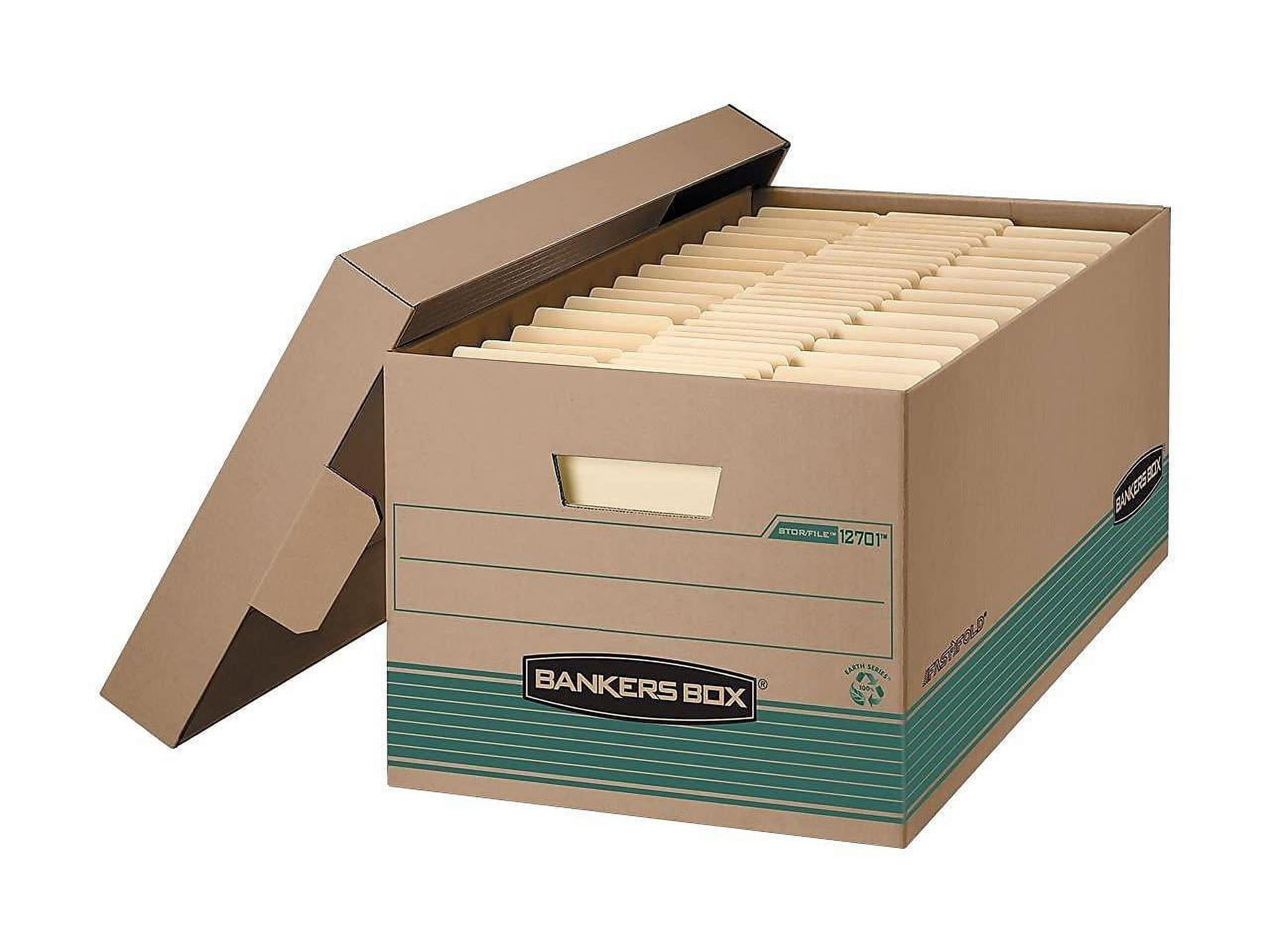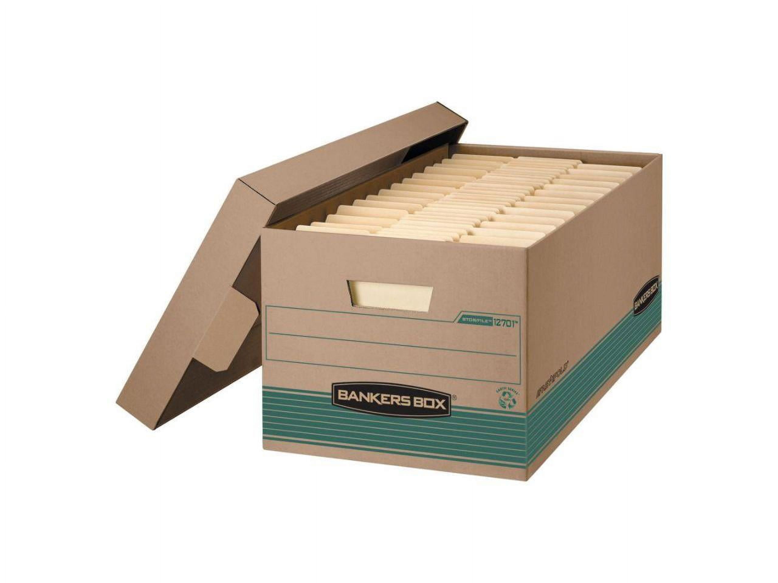 Bankers Box? STOR/FILE? Medium-Duty 100% Recycled Storage Boxes Double-end, single-side construction. Medium-duty for use with or without shelving. FastFold? quick and easy assembly. Deep, locking, lift-off lid stays in place for secure file storage. Value Pack?Stock up and save! Box Type: Stackable File Storage; Box Style: FastFold? Quick & Easy Assembly; Strength: Medium-Duty; File Size Format: Letter.