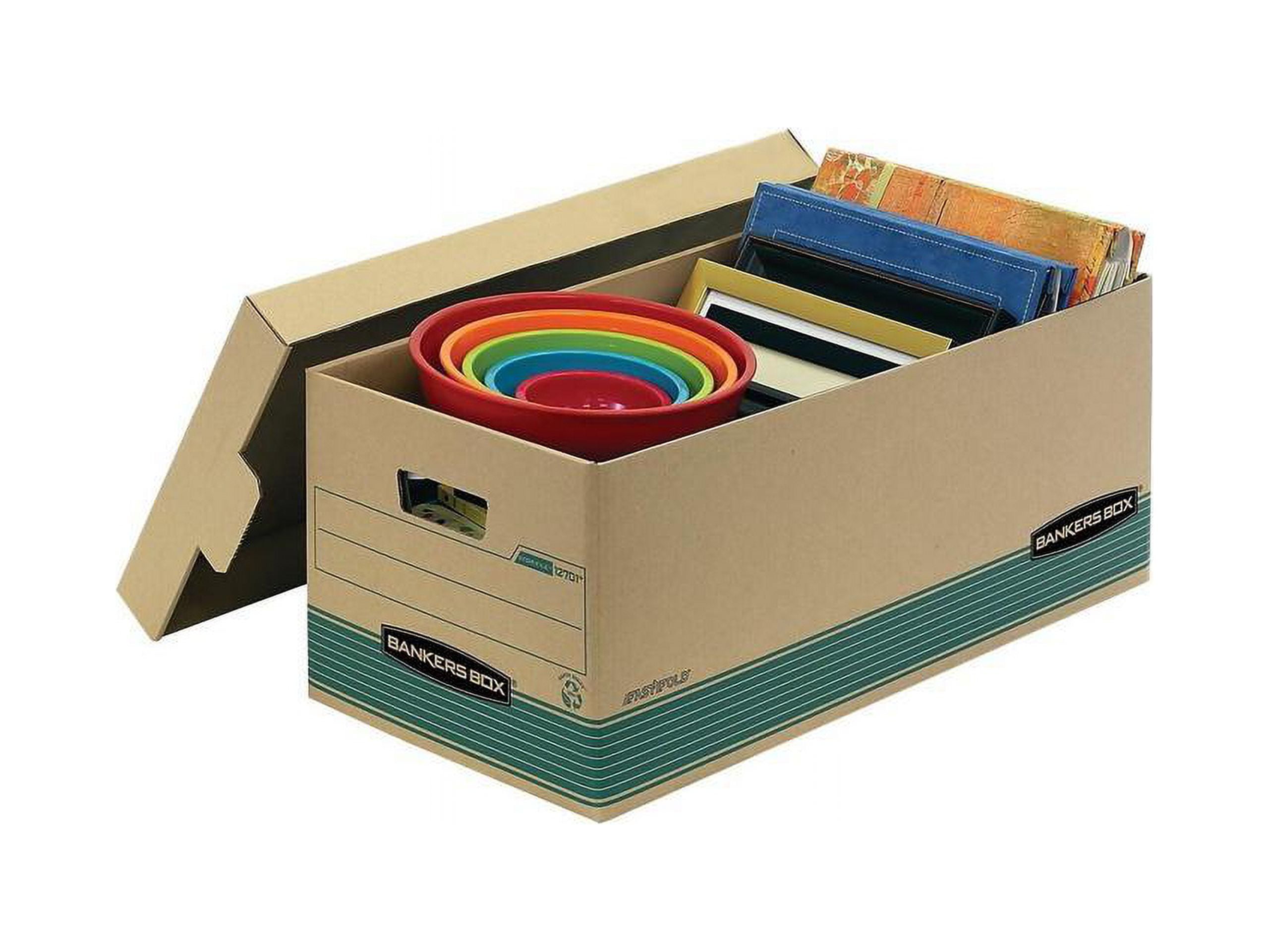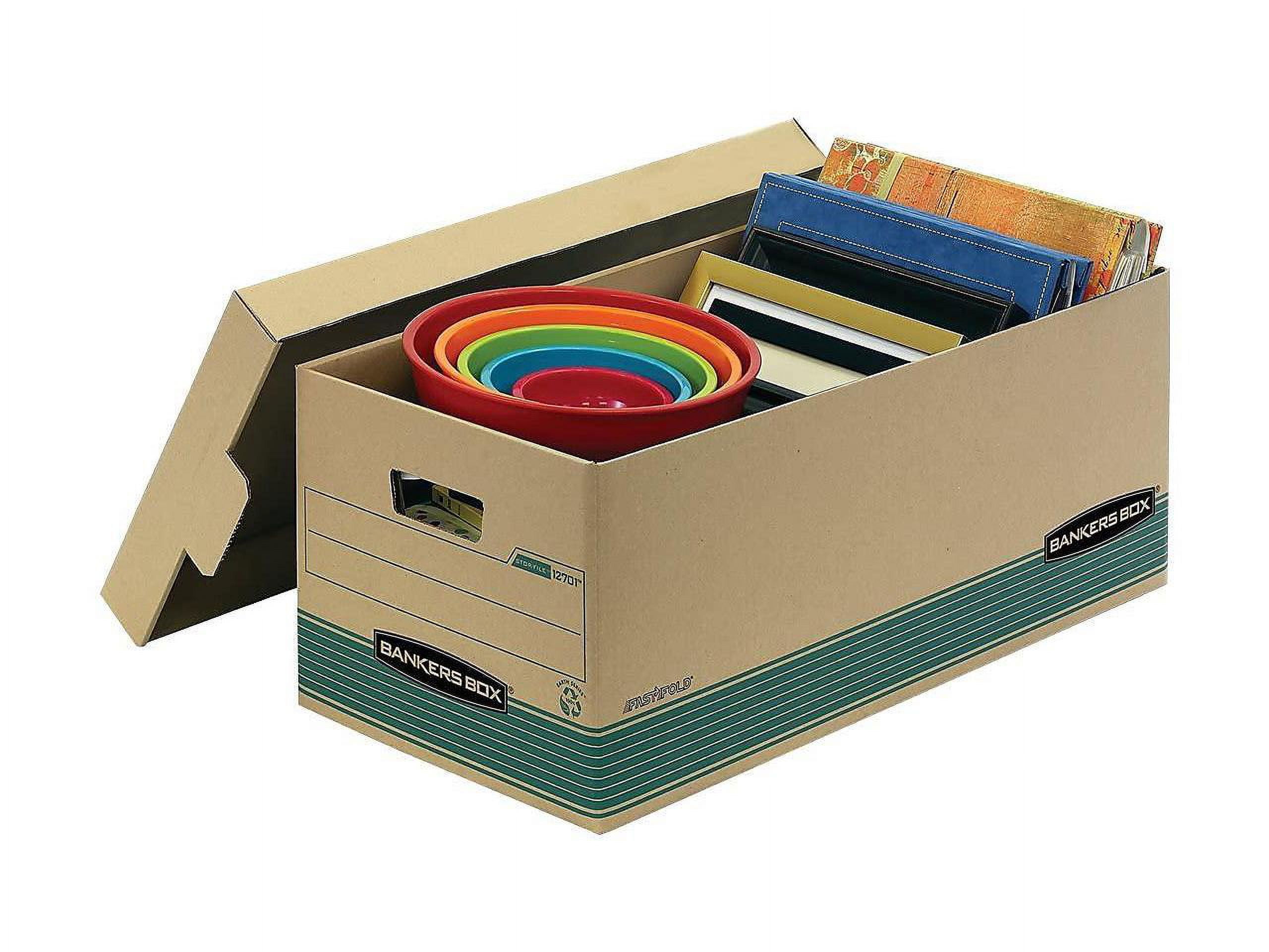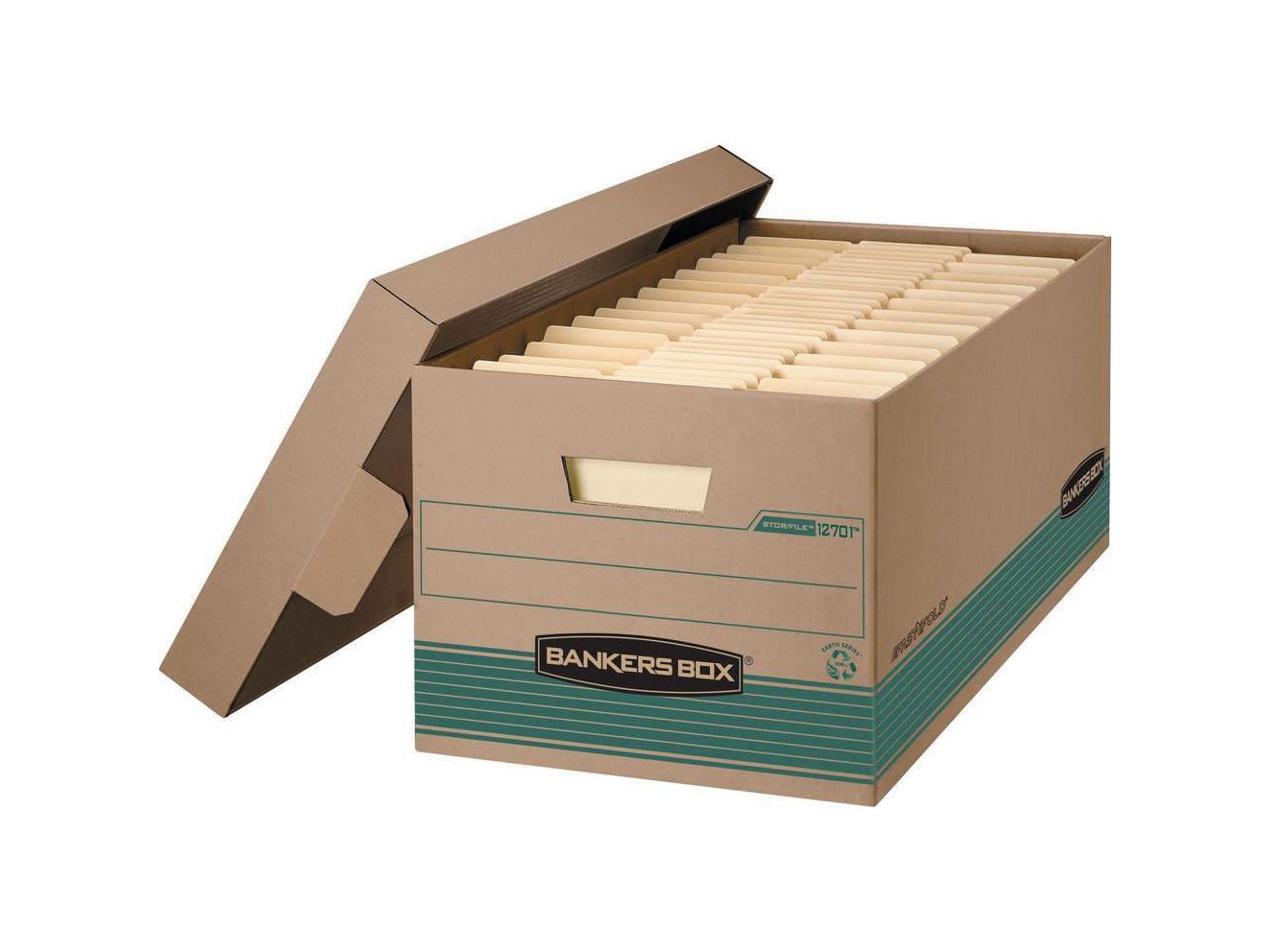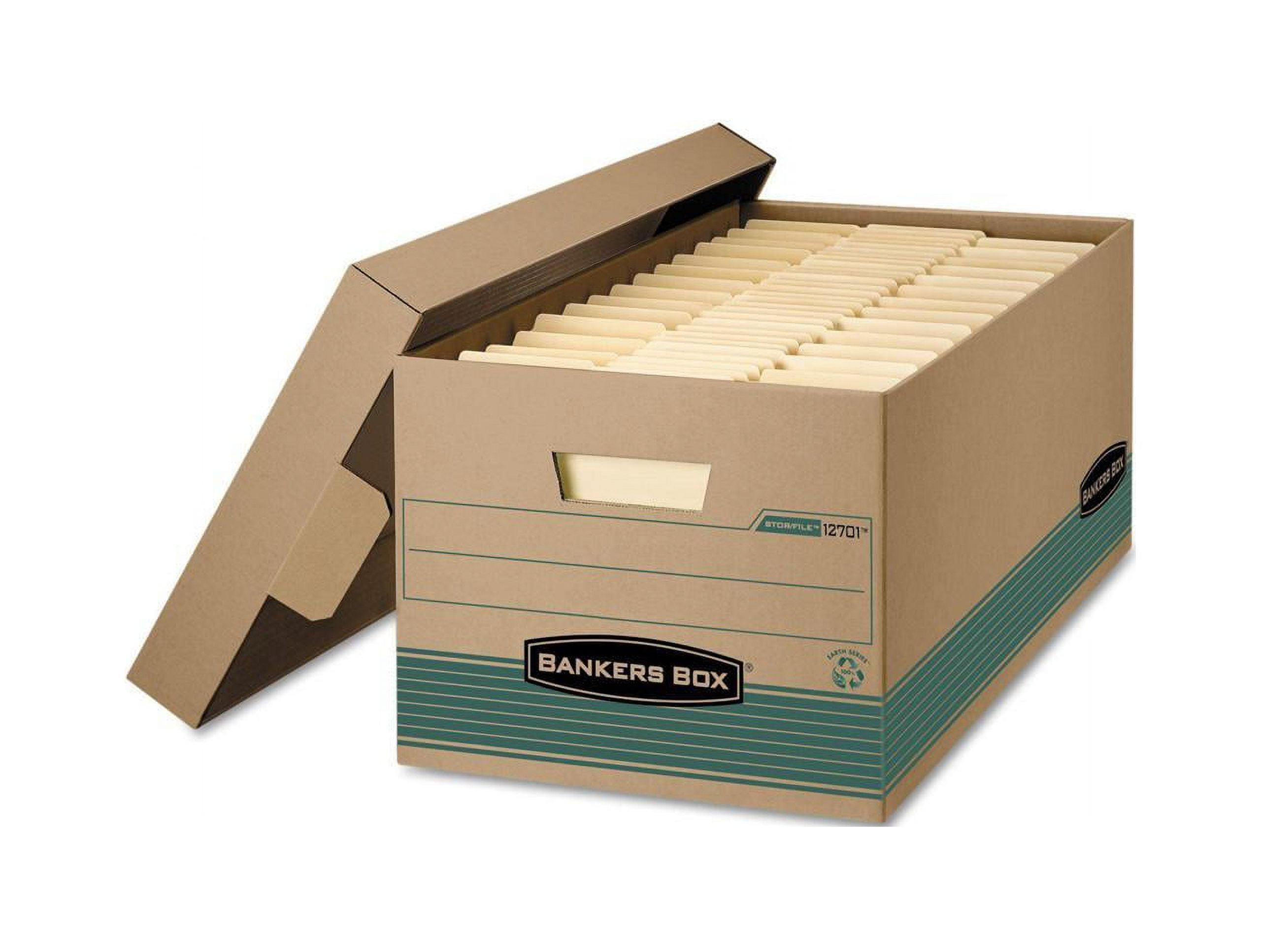Bankers Box? STOR/FILE? Medium-Duty 100% Recycled Storage Boxes Double-end, single-side construction. Medium-duty for use with or without shelving. FastFold? quick and easy assembly. Deep, locking, lift-off lid stays in place for secure file storage. Value Pack?Stock up and save! Box Type: Stackable File Storage; Box Style: FastFold? Quick & Easy Assembly; Strength: Medium-Duty; File Size Format: Letter.