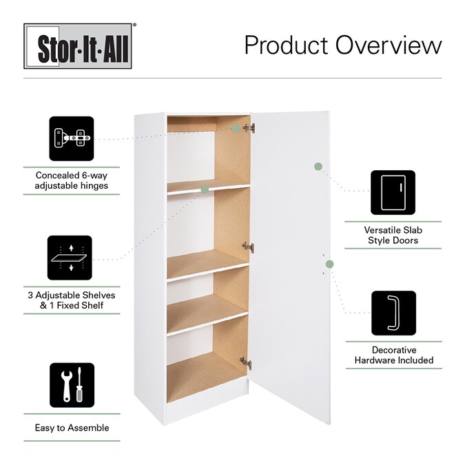 This 24 inch multipurpose cabinet provides added storage in a transitional door style to complement any room. This utility cabinet features a slab door in a durable white finish that is easy to clean. This Stor-It-All cabinet is the solution to your kitchen pantry, laundry room, bathroom and garage.